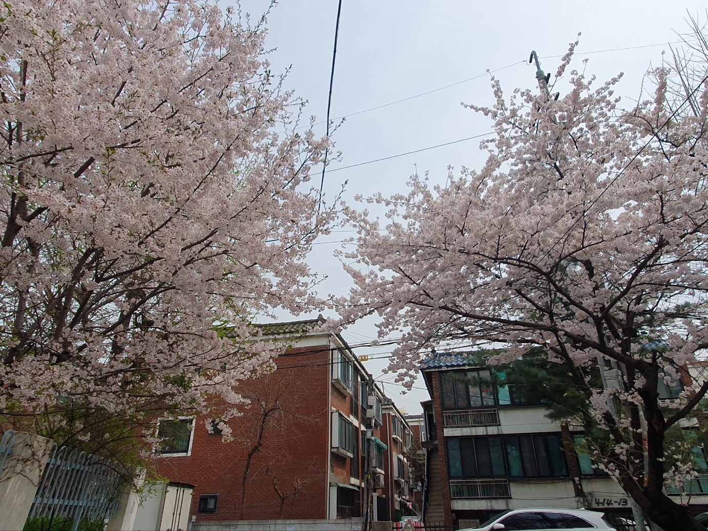처럼, 골목 사이 벚꽃이 만개하고 파란 하늘 사이로 색가락지하란 듯 전봇줄이 가로지른