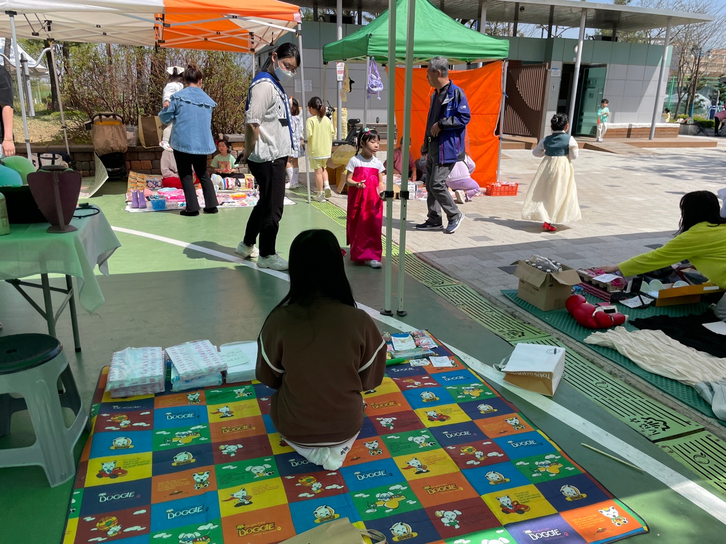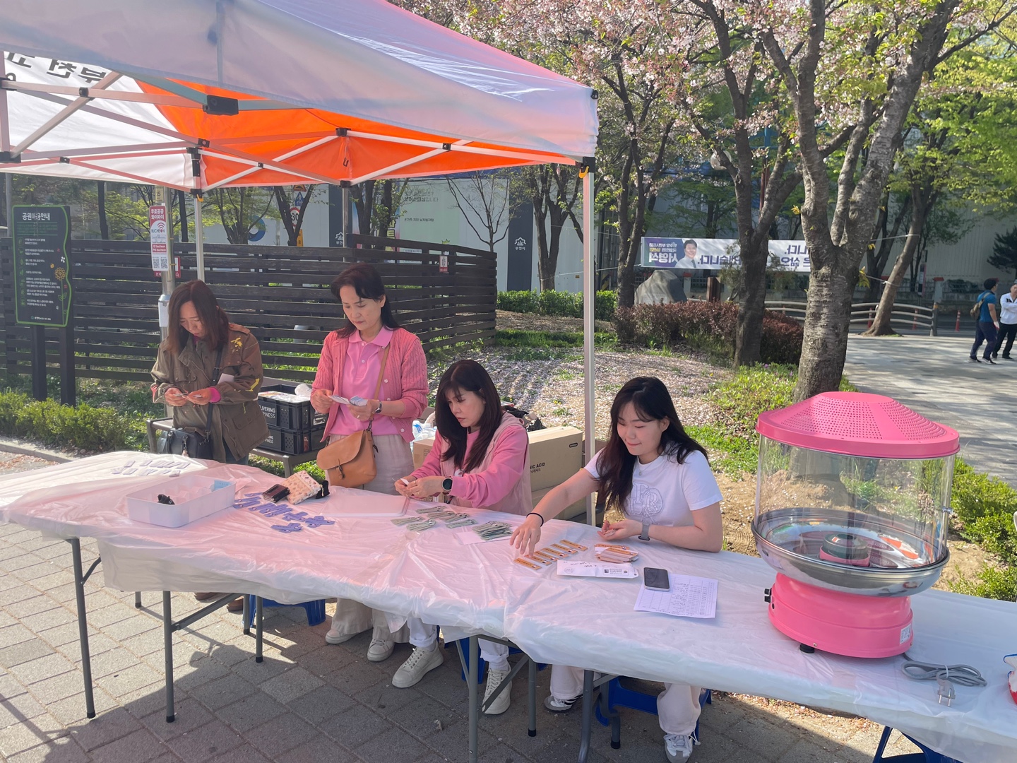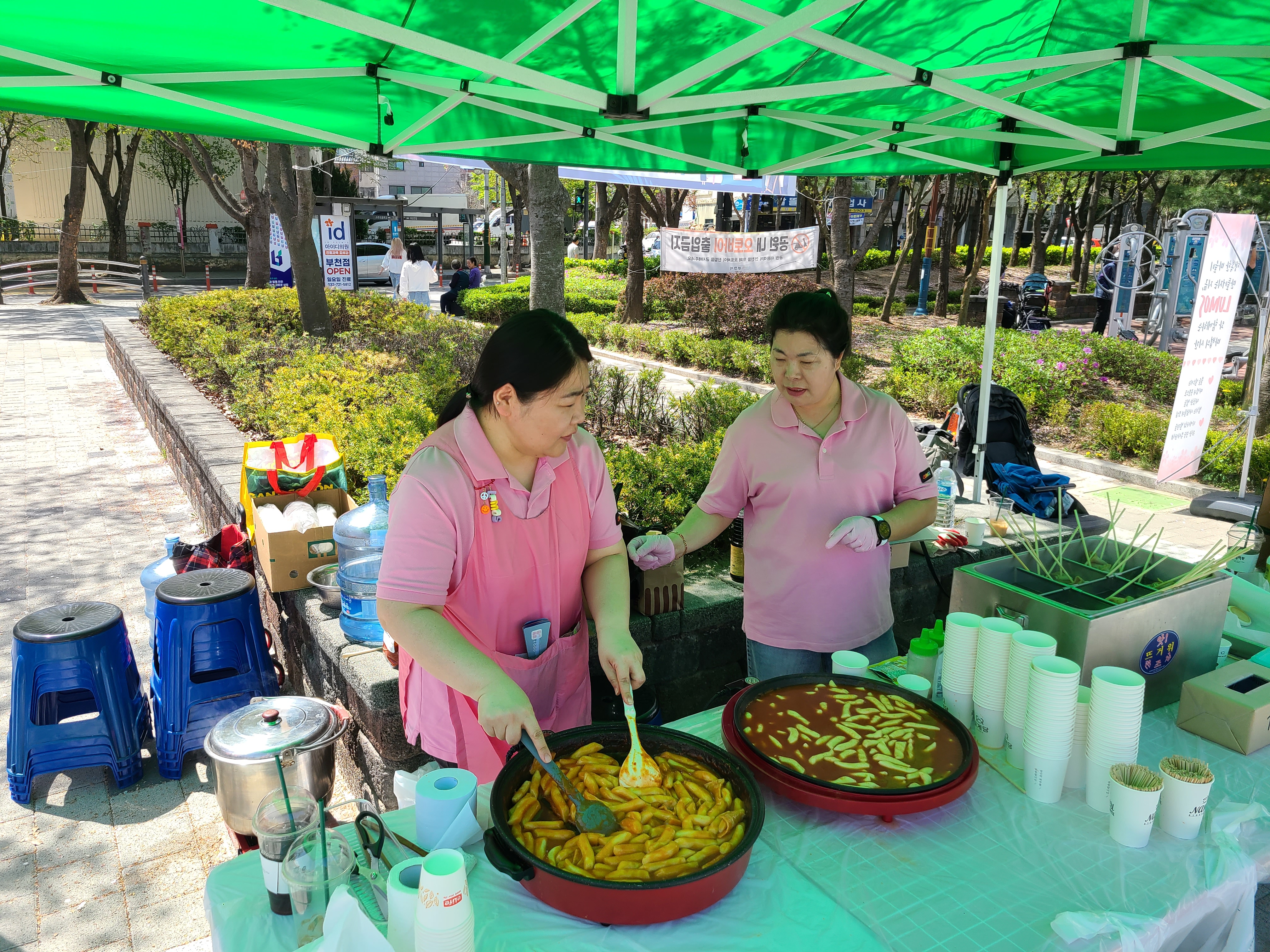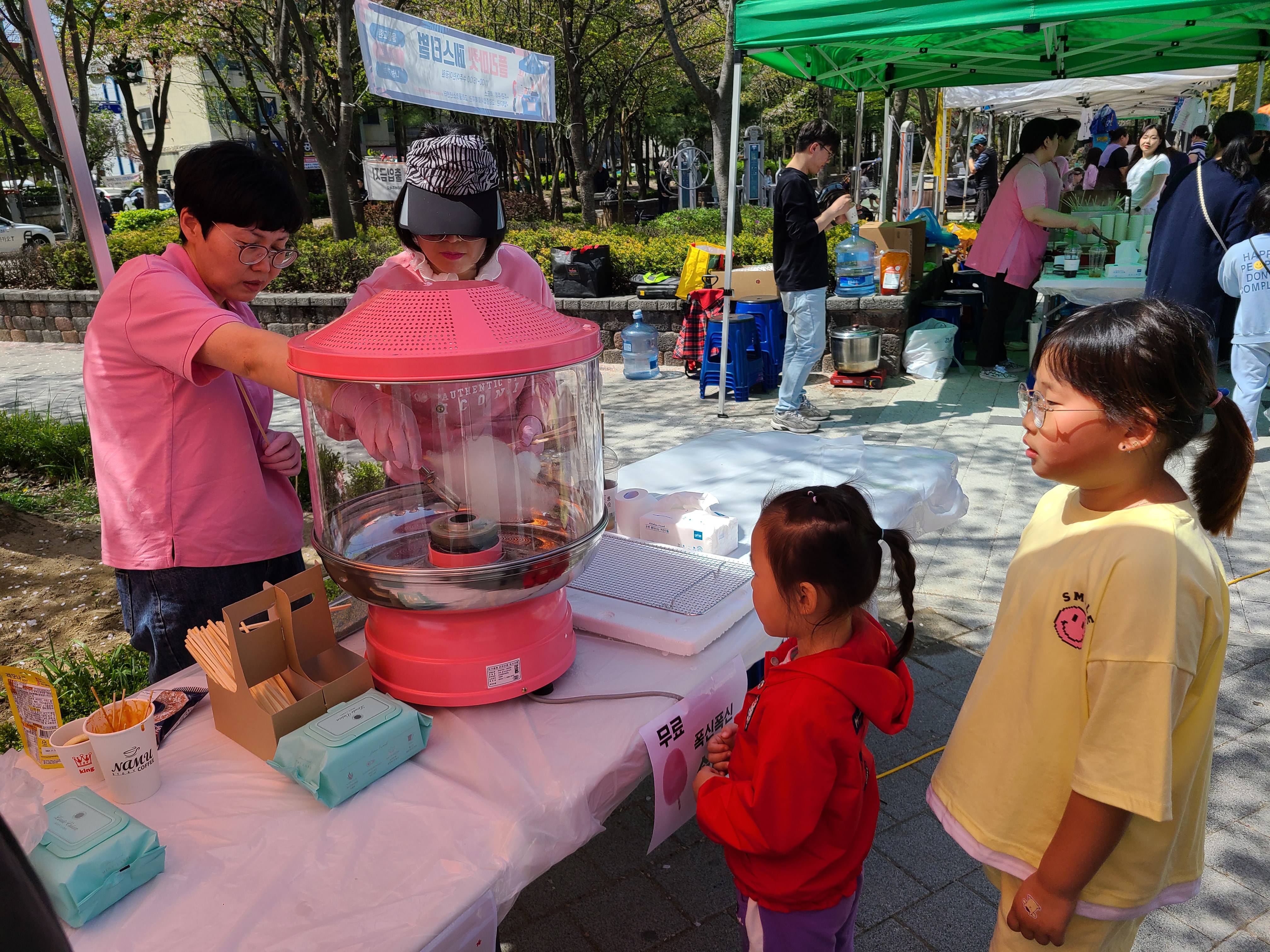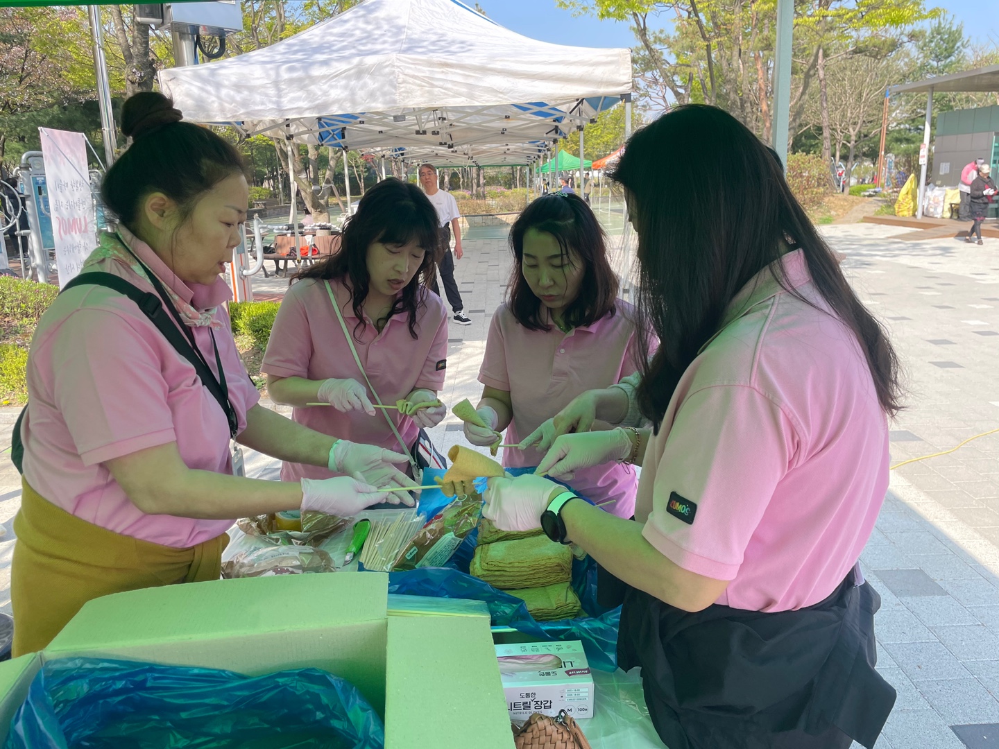 천막을 치고, 어묵에 꼬치를 끼우고, 아나바다에 사용할 쿠폰을 분류합니다.