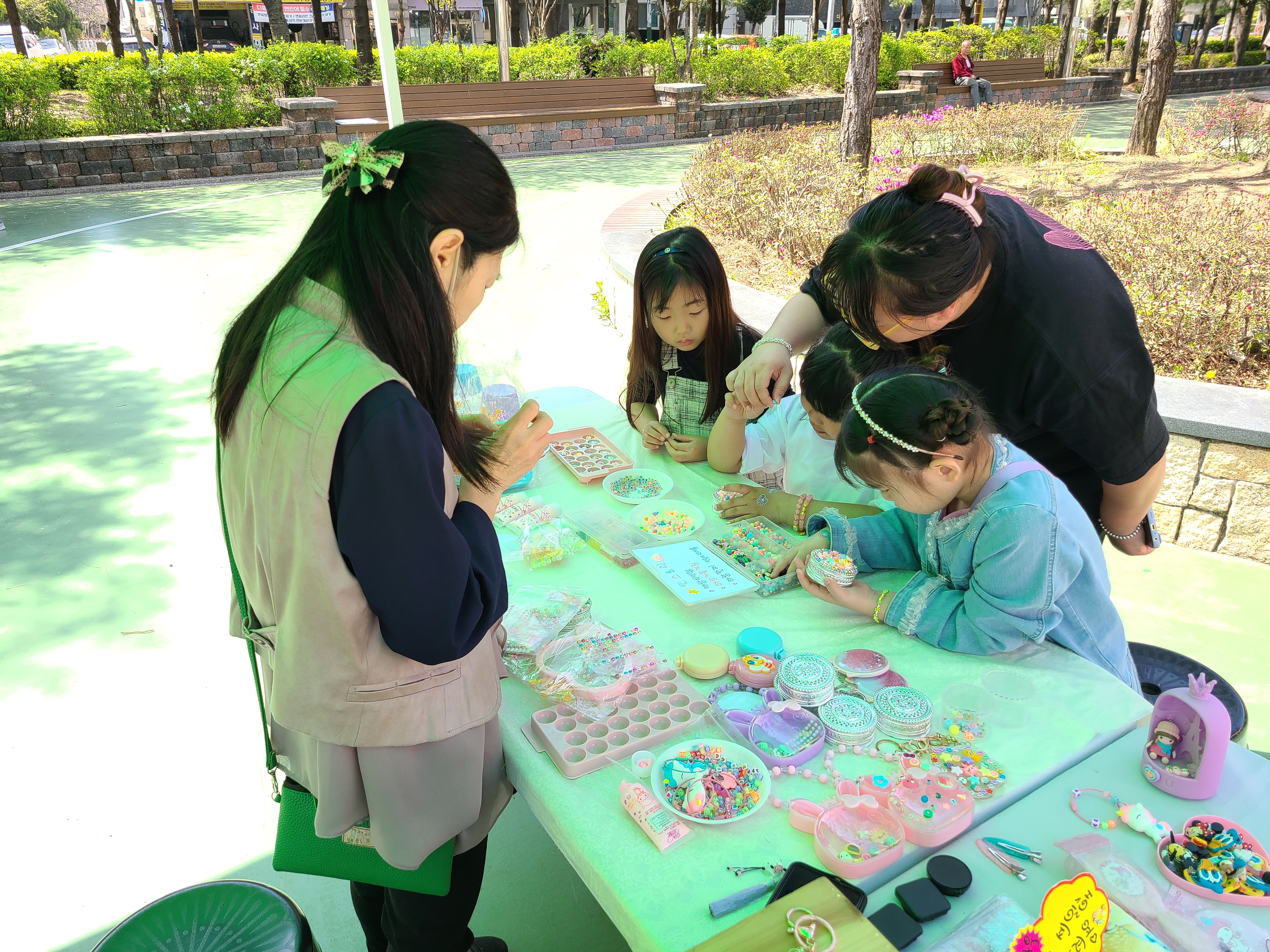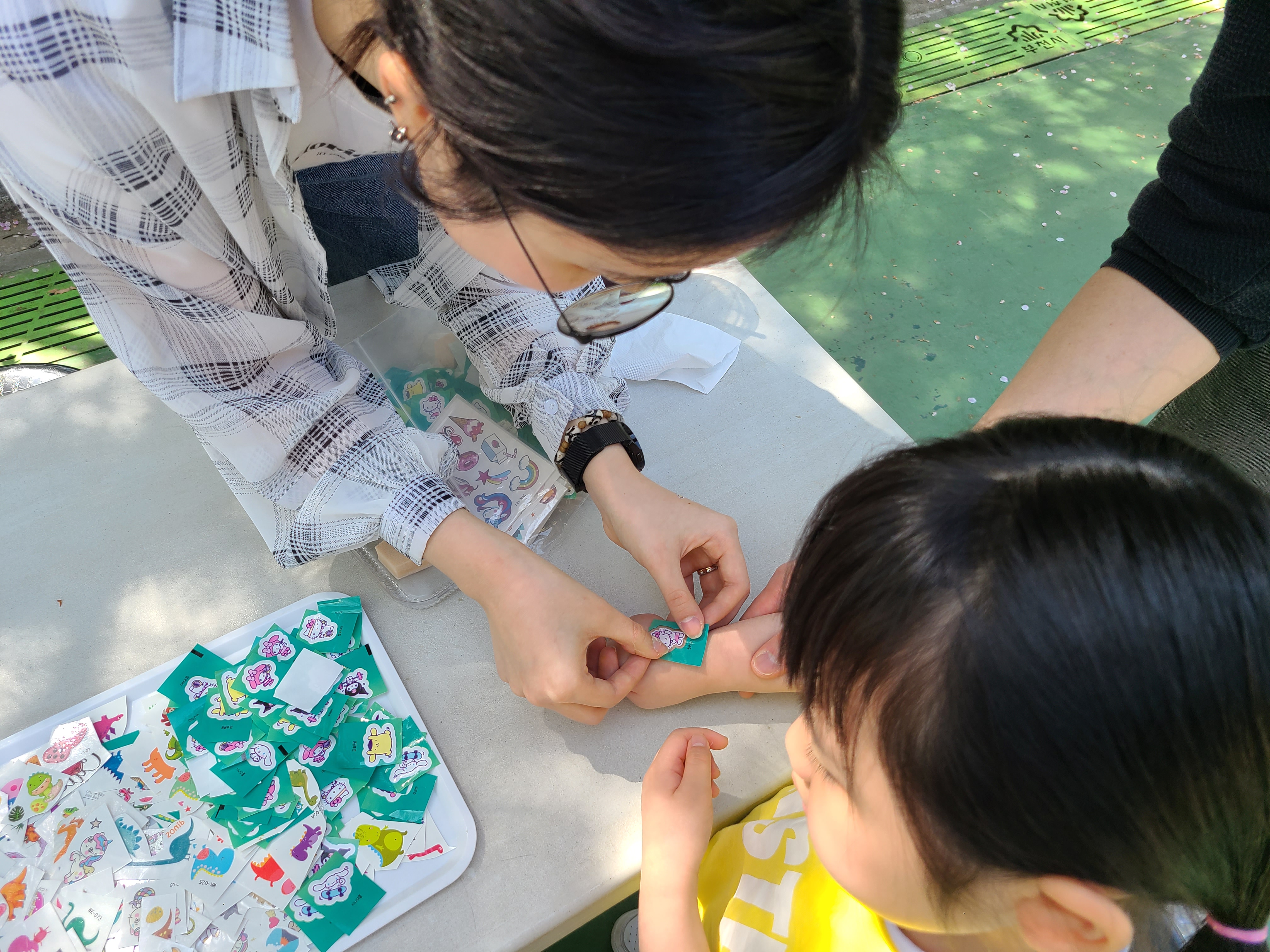 체험부스에서 활동을 하기도 합니다. 악세사리가 가득 붙어있는 보석함이나, 판박이를 붙이기도 합니다.