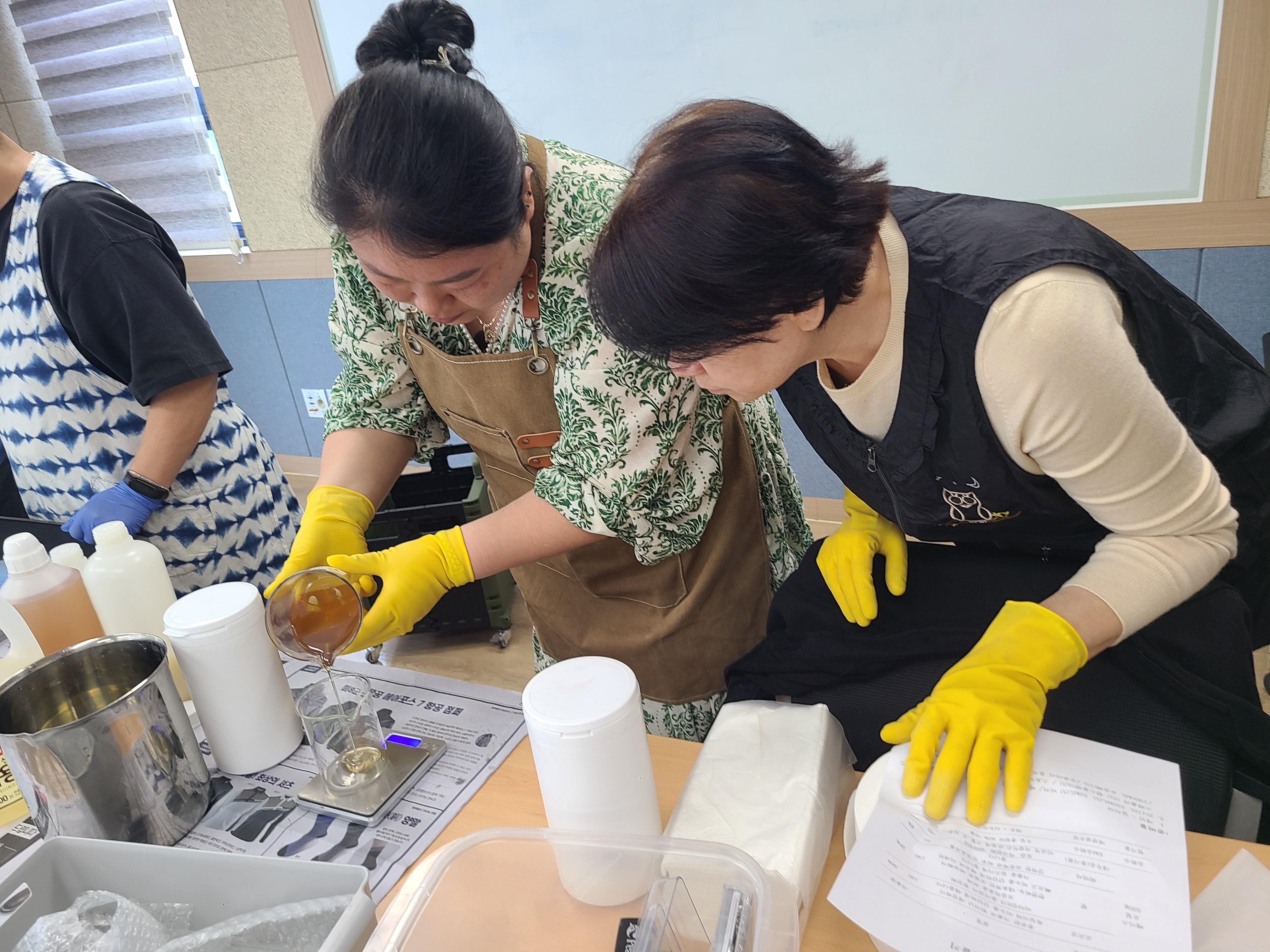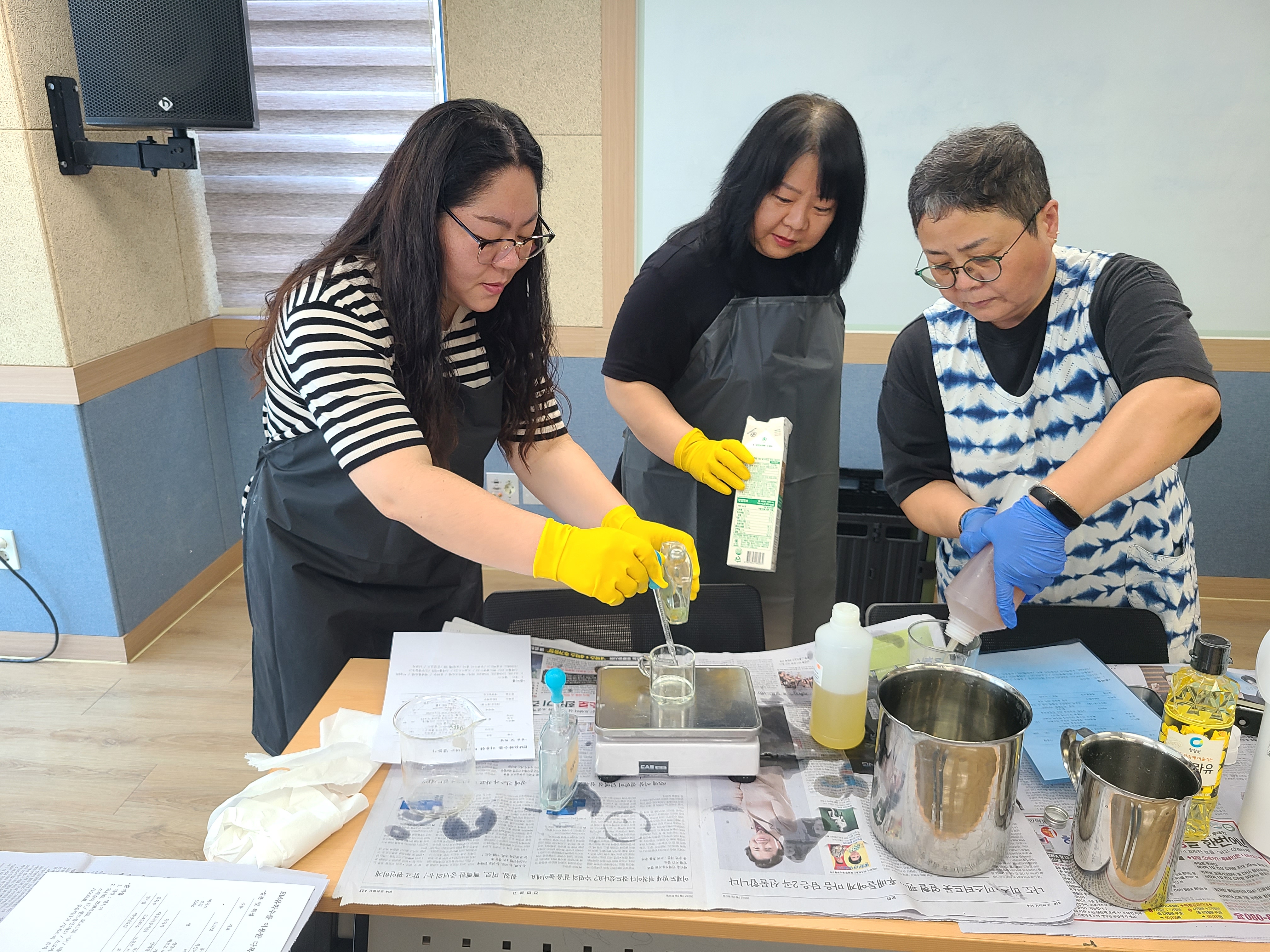 준비물을 계량을 합니다. 비누가 되는데 필요한 재료들과 향도 함께 나눴습니다.