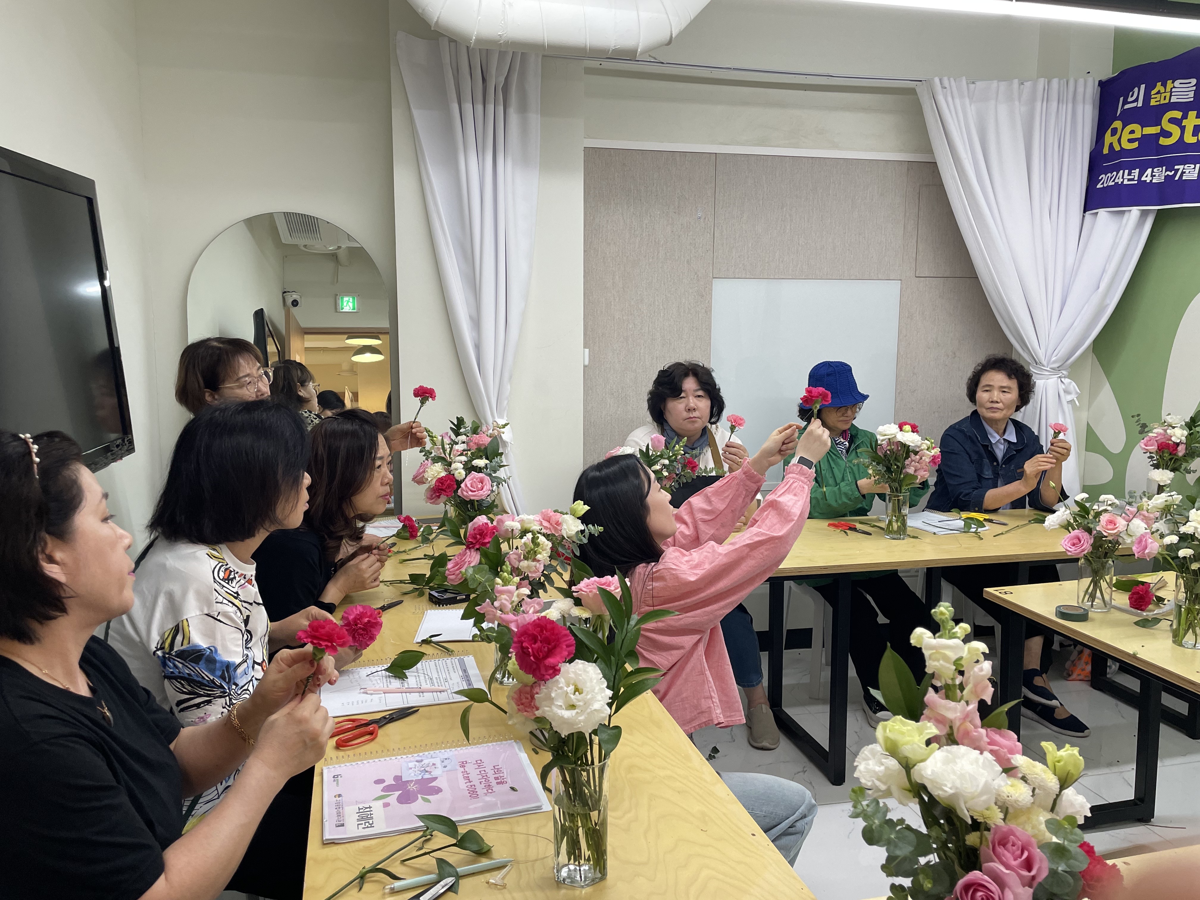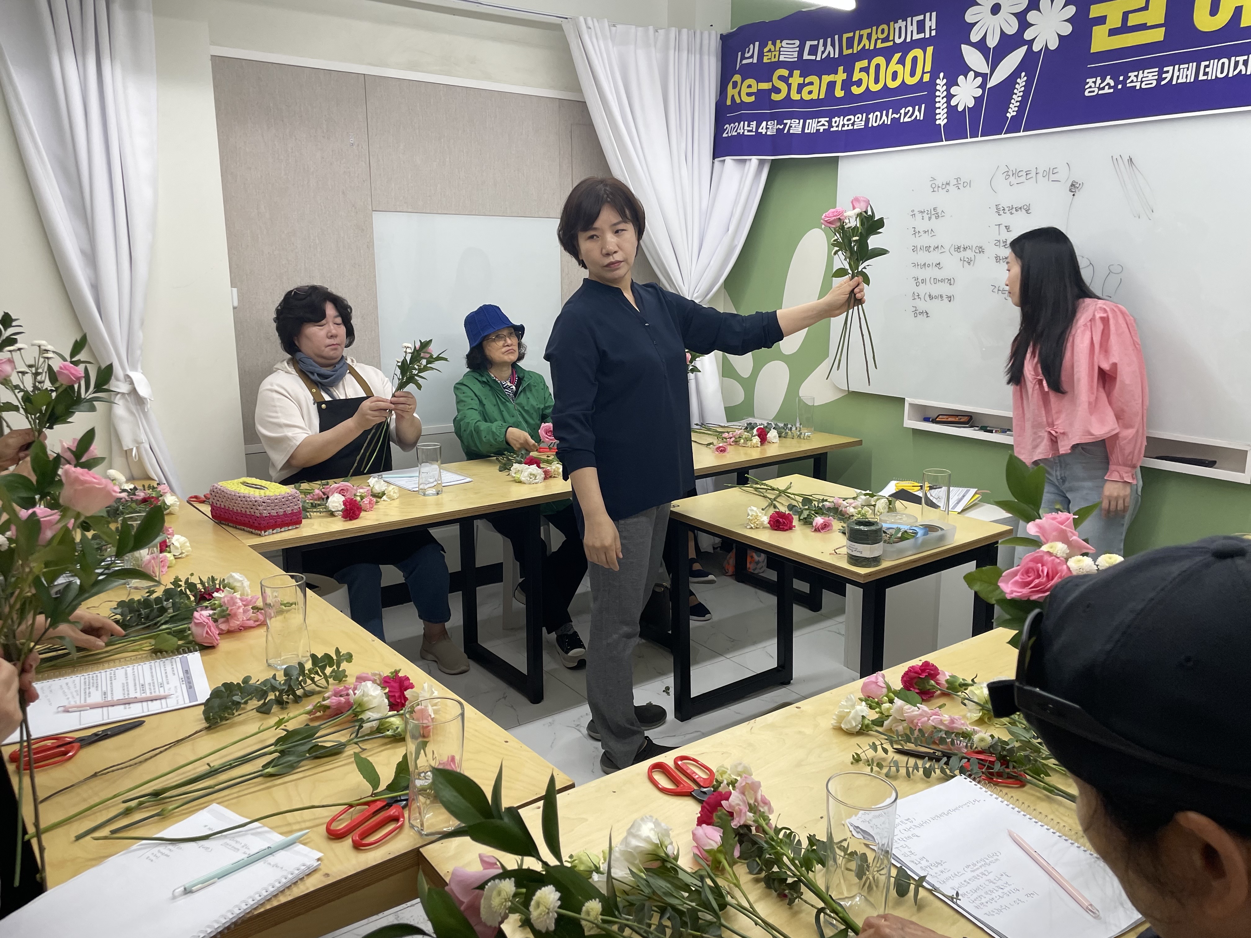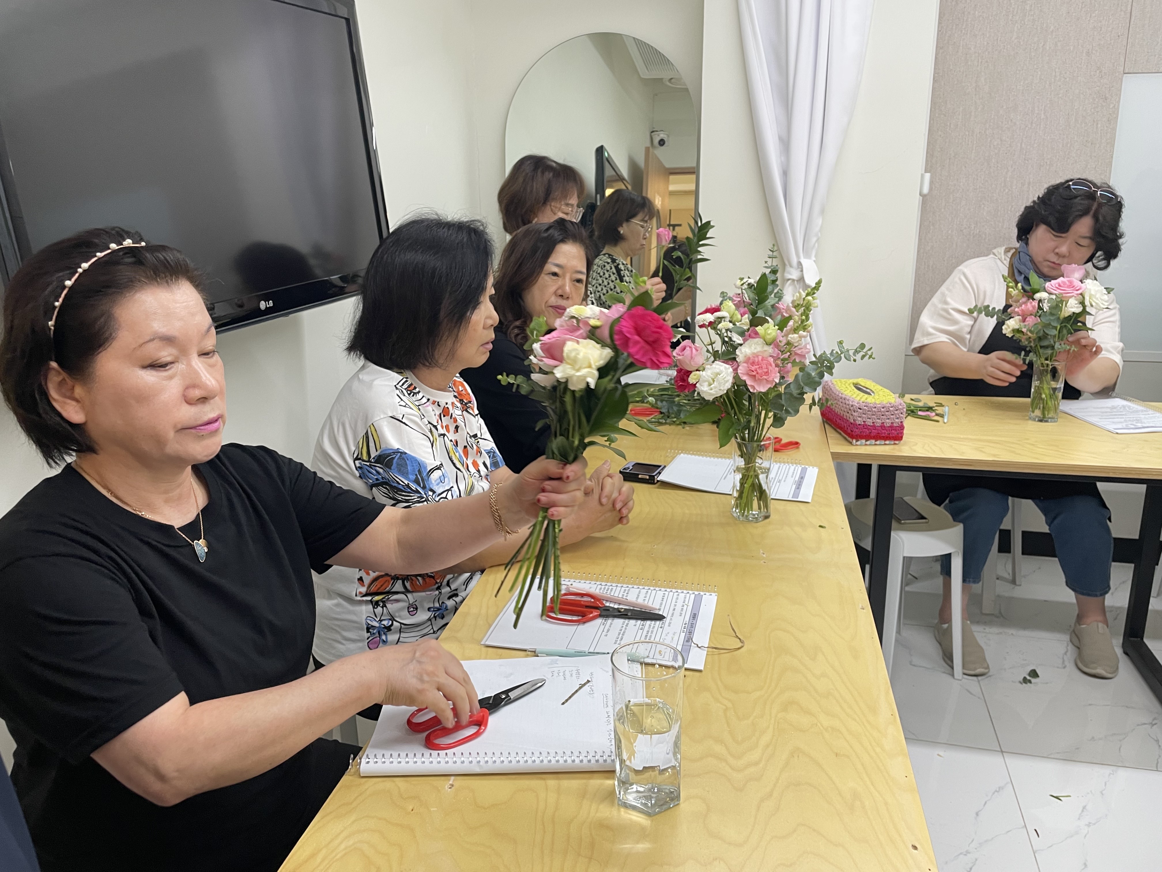 아직 꽃꽂이에 익숙하지 않은 참여자분들은 꽃을 다루는데 어려움이 있었지만 곧잘 따라 하시며 꽃을 향한 웃음을 잃지 않으셨습니다.