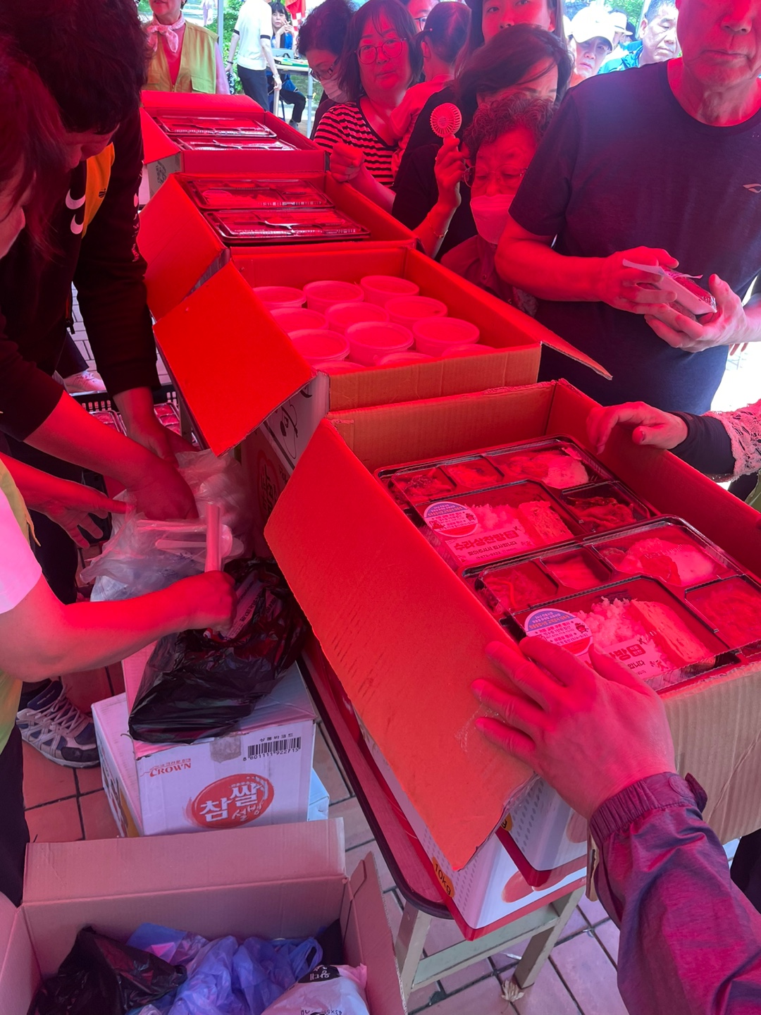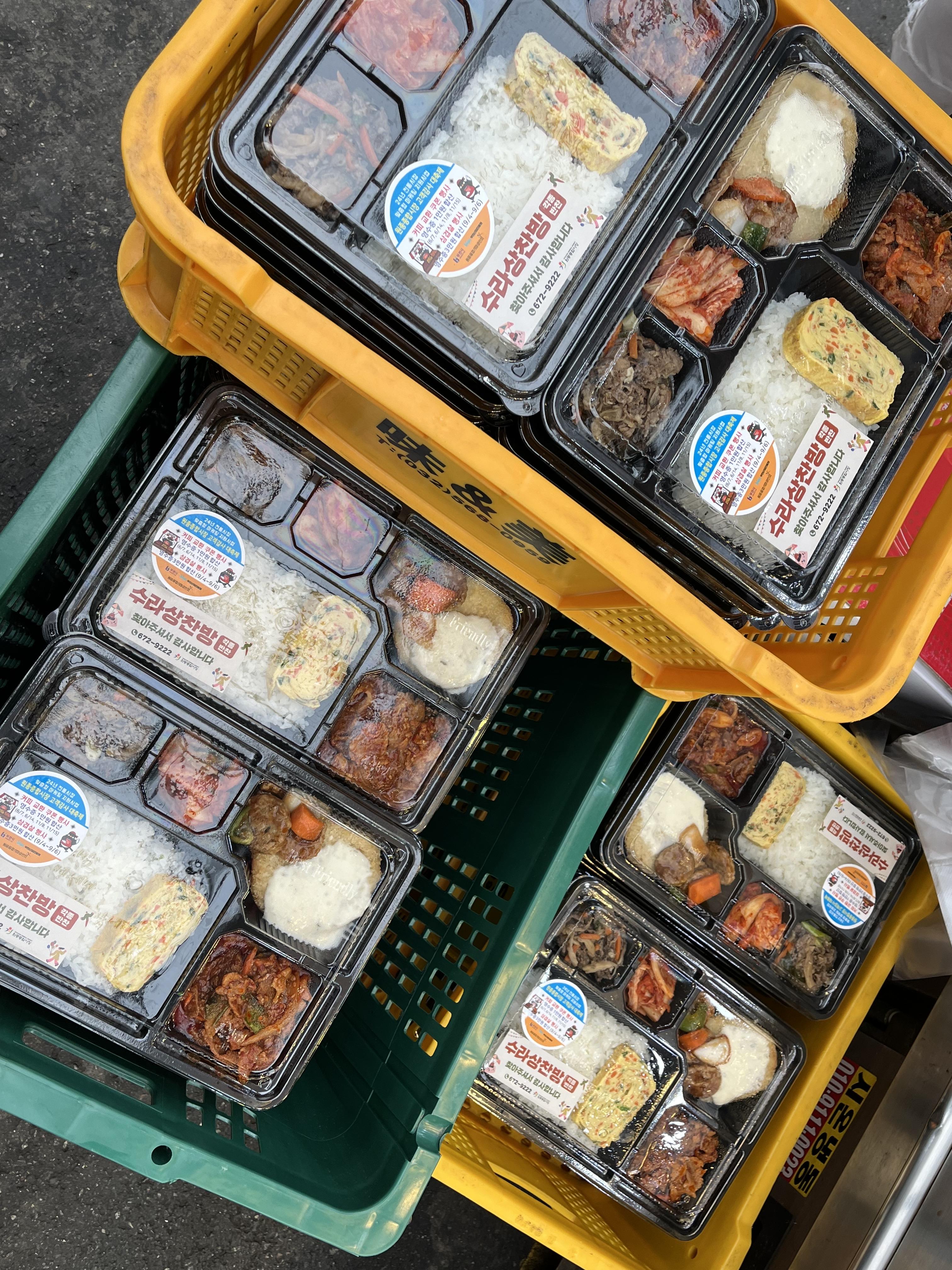 원종종합시장에서 마련해주신 도시락 200인분이 도착하자마자 빠르게 배분이 이루어졌습니다.
