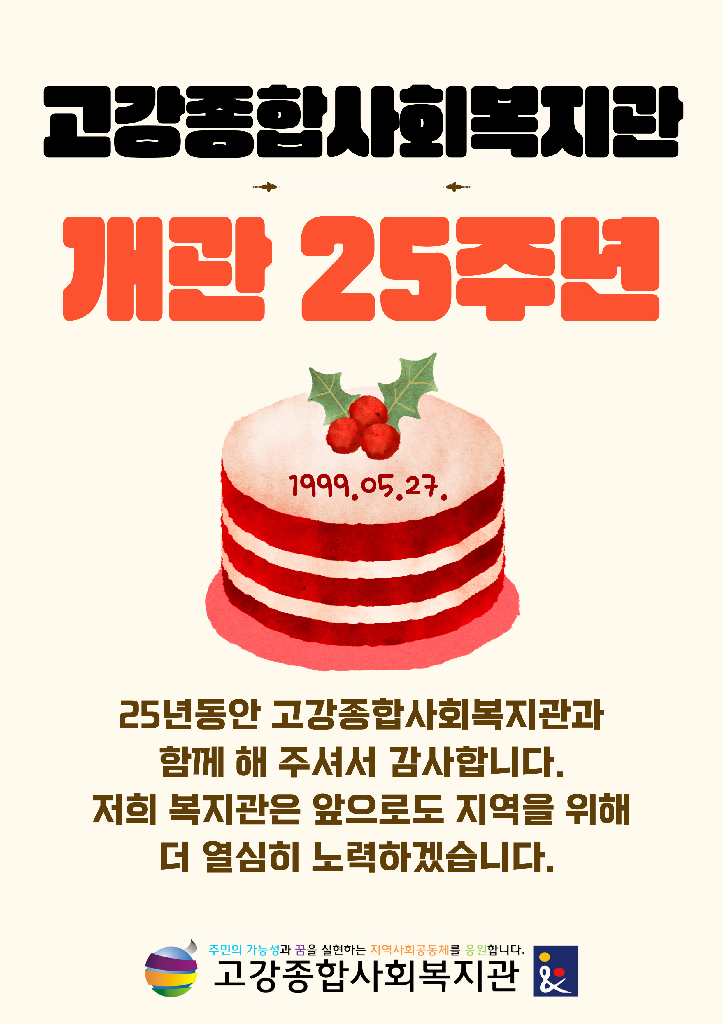 고강종합사회복지관이 1999년 5월 27일에 개관하여 어느덧 25살이 되었습니다.