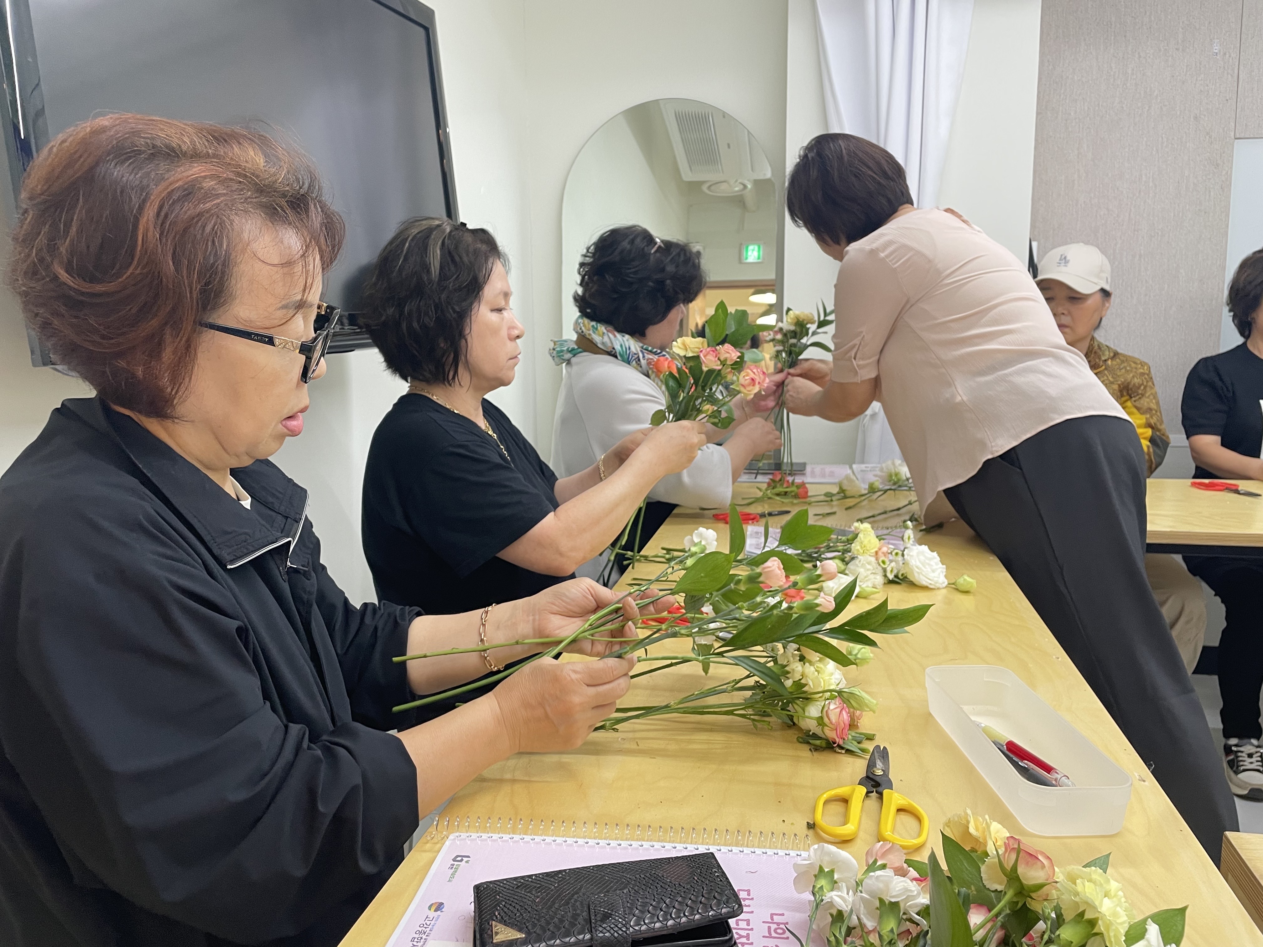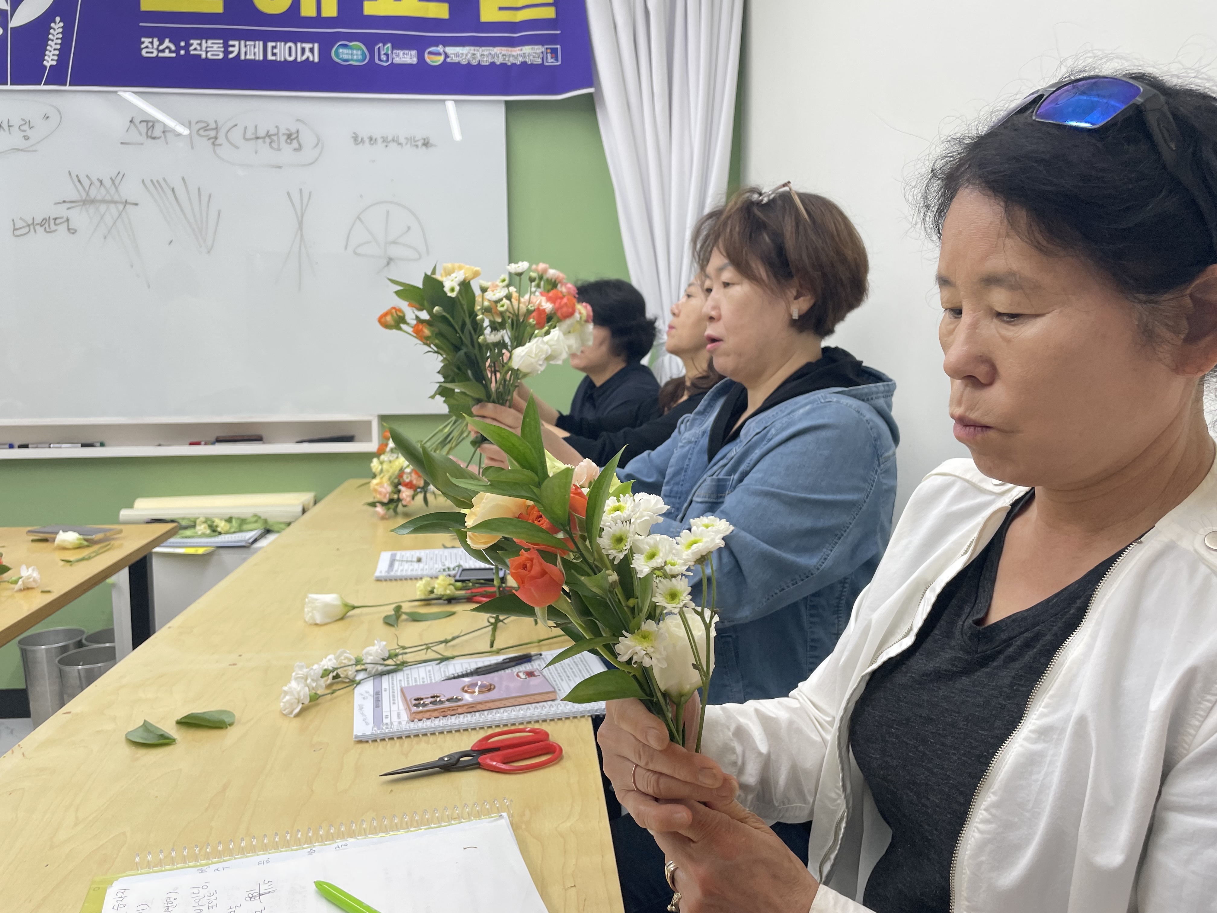 강사님과 참여자들은 단계적으로 배우며 꽃다발 하나를 완성해보았습니다.