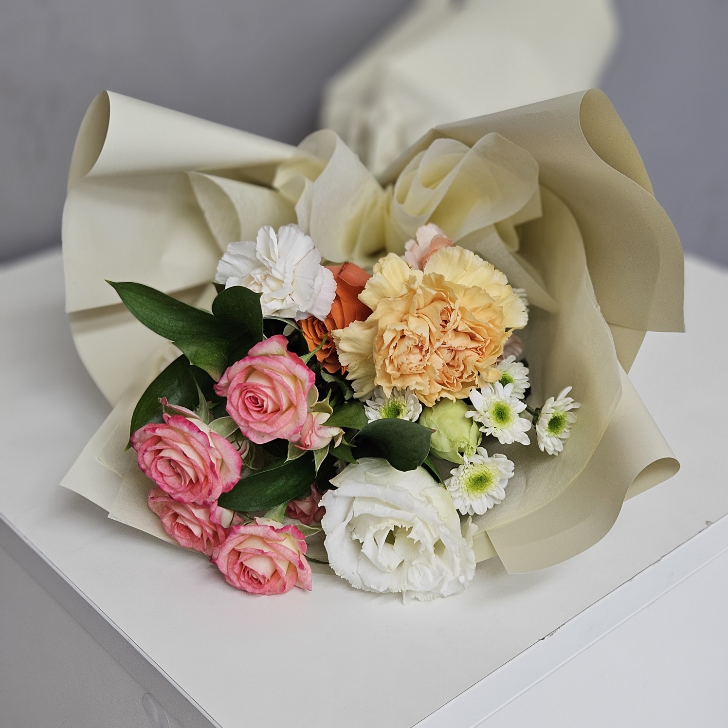 5월을 상징하는 카네이션과 장미, 거베라, 소국, 유카리를 사용하여 꽃다발을 만들어 보았습니다.