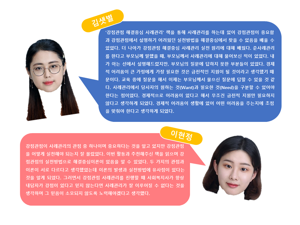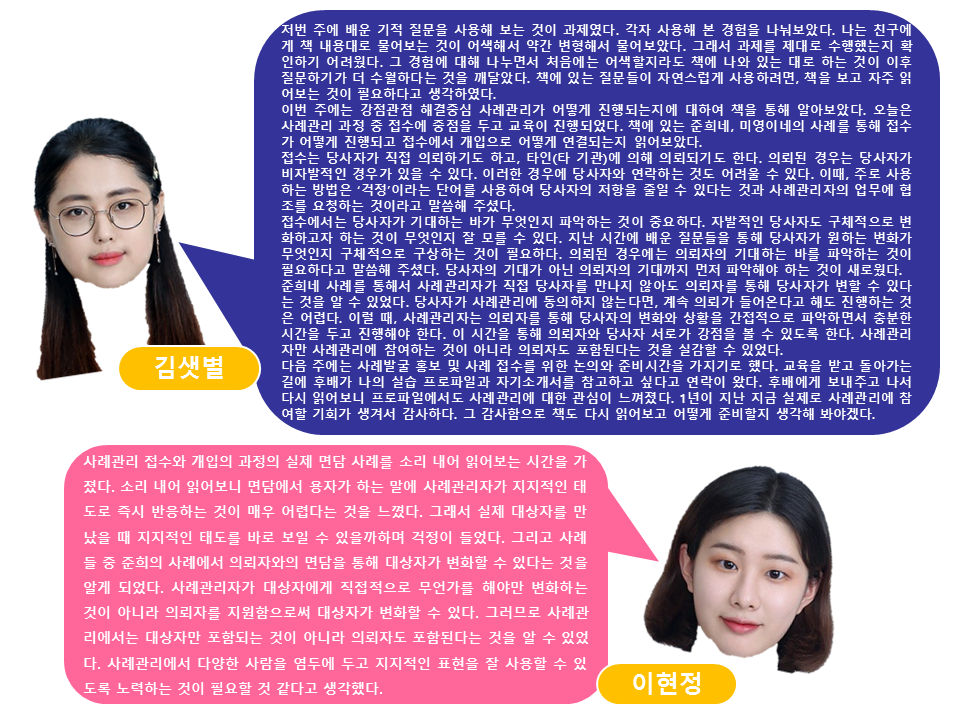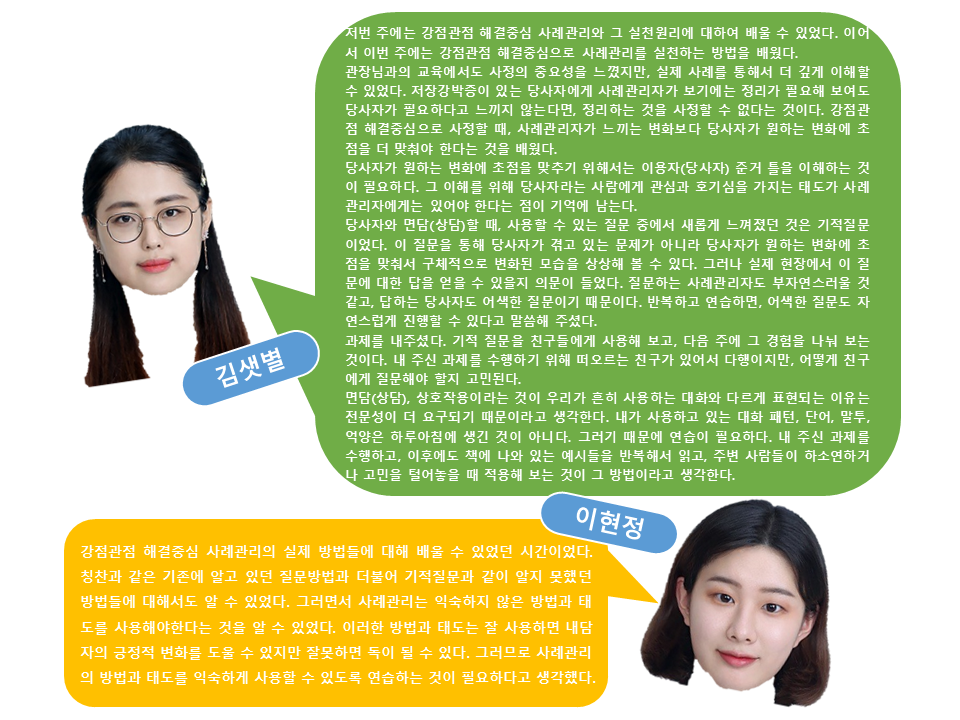 이 두학생은 작년부터 올해 상반기까지 총 10회에 걸쳐 최종복 관장님과 사례관리에 대해 교육을 받았던 학생들이기에 5월 한 달, 저와 함께 '강점관점 해결중심 사례관리' 교육을 받고, 바로 현장투입하는 것으로 결정!