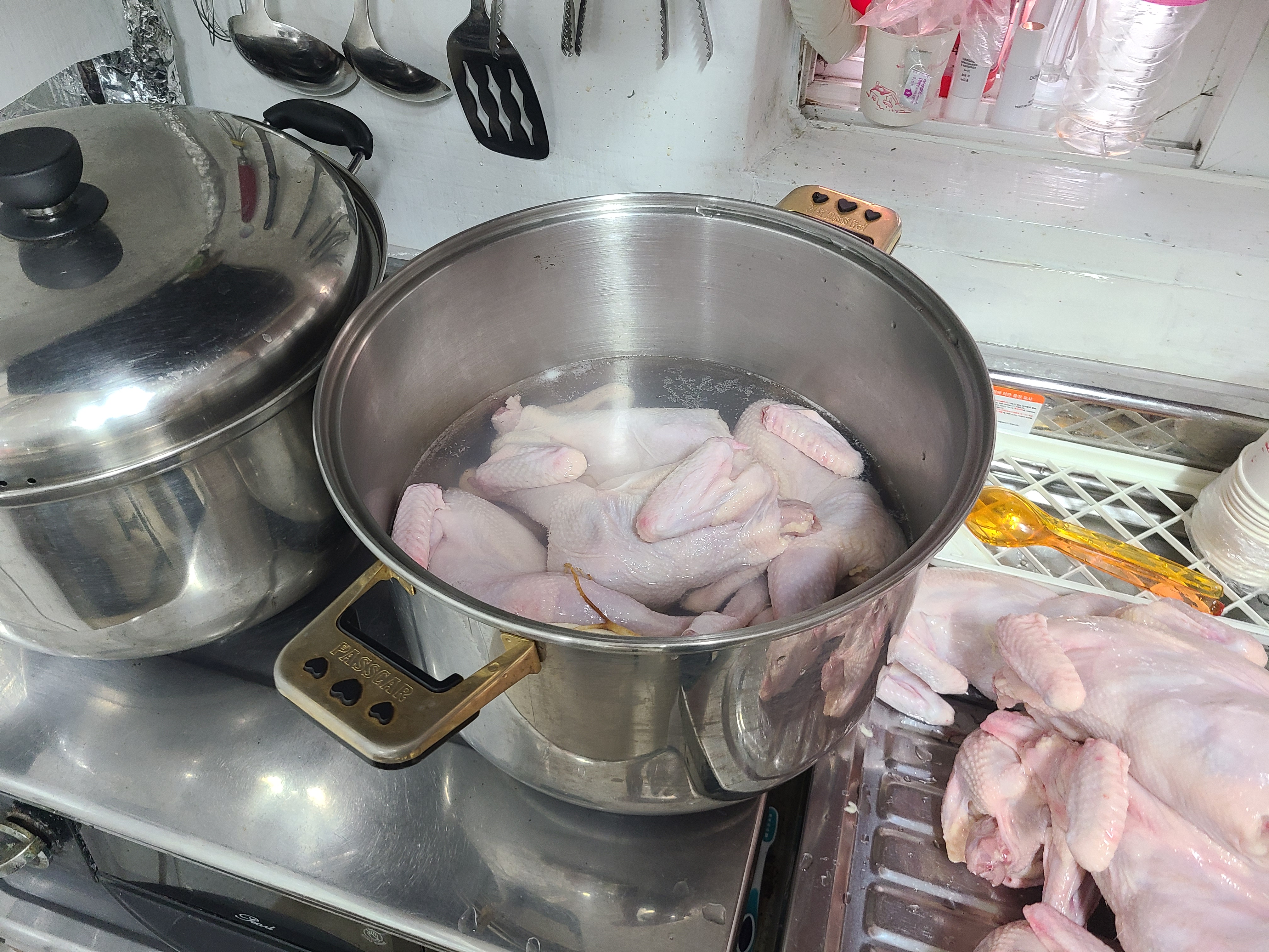 쌀을 불리고, 닭을 손질해서 냄비에 퐁당!!! 보글보글