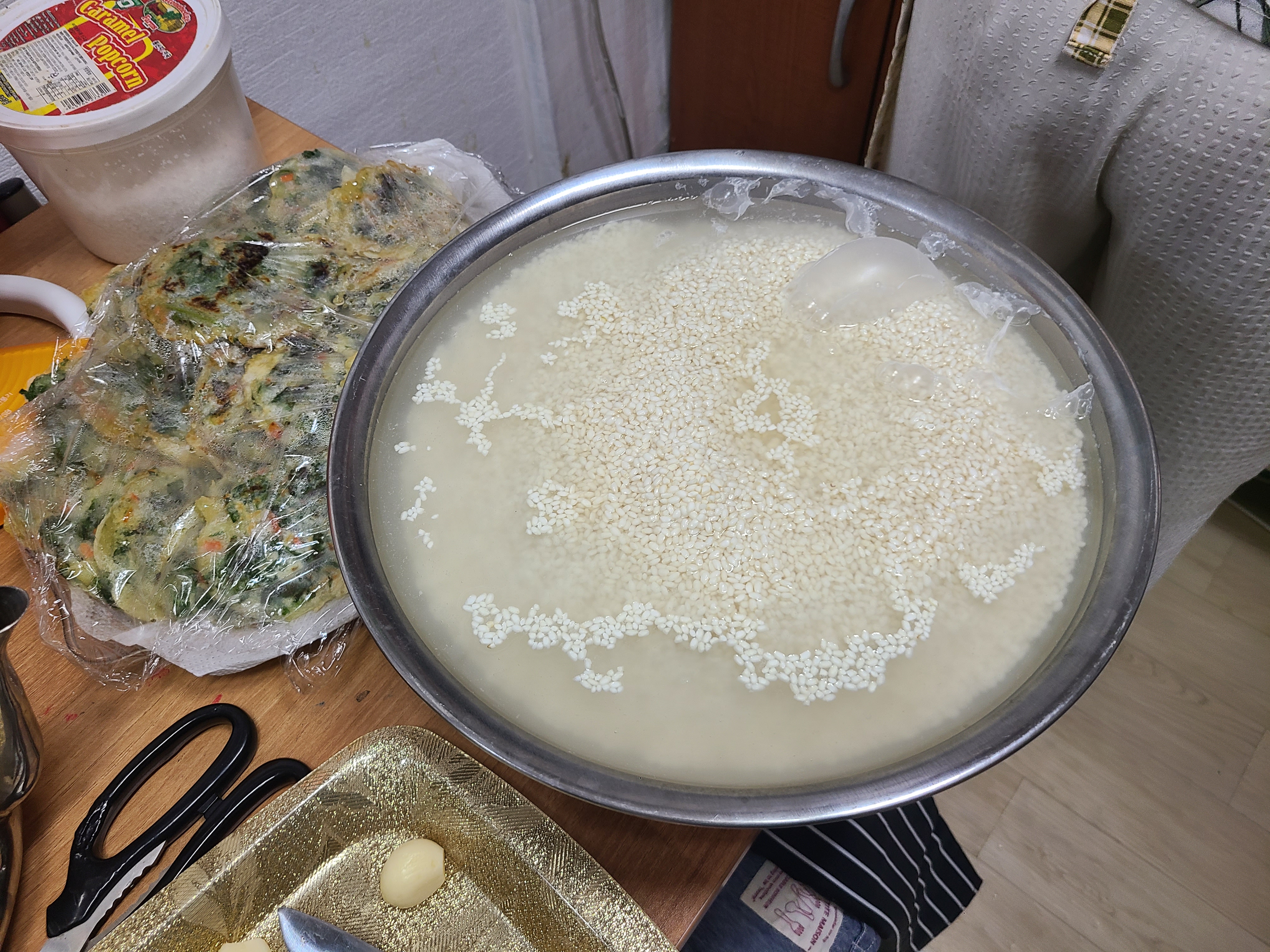 통장님이 미리 준비해 놓으신 부침개와 마침 고강1동 주민자치회에서 주신 열무김치도 있습니다.