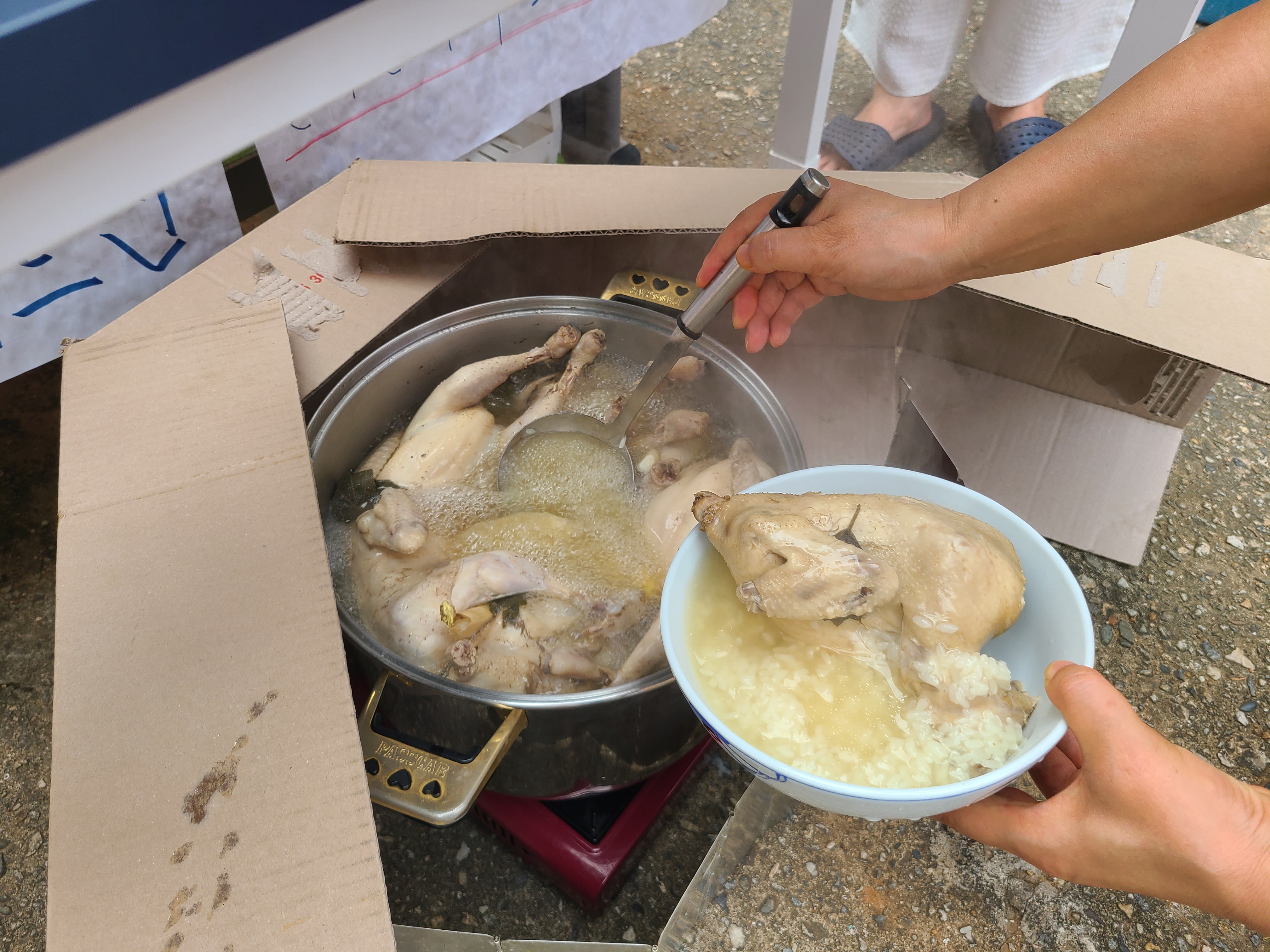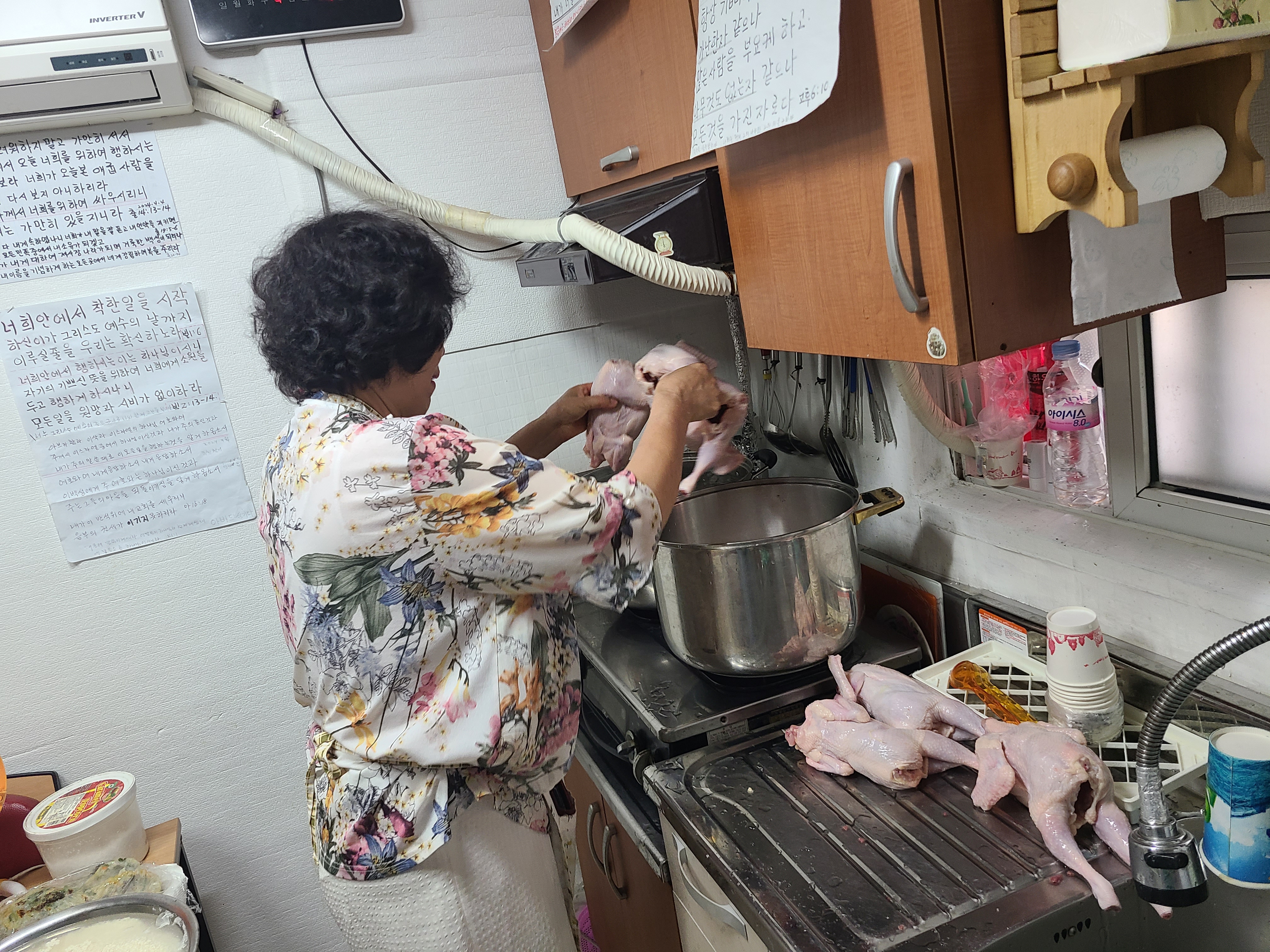 통장님이 준비하신 재료들을 넣고 폭폭 삶으니 어느새 맛좋은 삼계탕이 완성됐습니다.