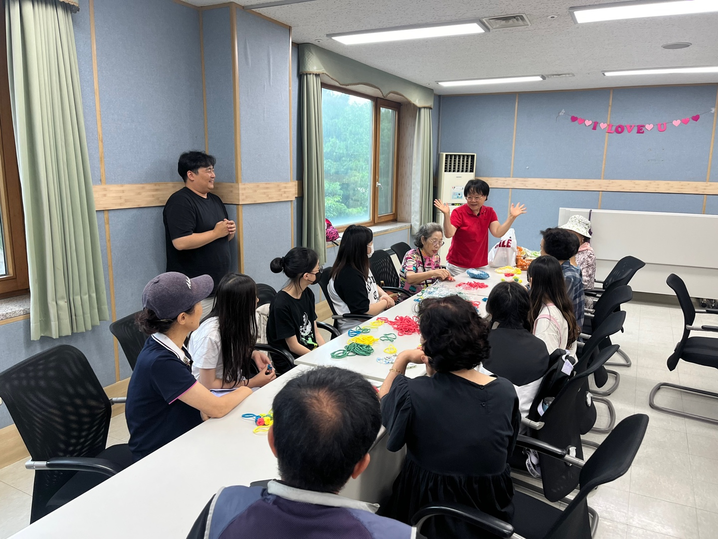 아이들에게 네잎클로버를 만드는 방법을 알려주기 위해 아이들을 만나기 전, 어르신들은 양말목으로 네잎클로버를 만드는 방법을 배우셨습니다.