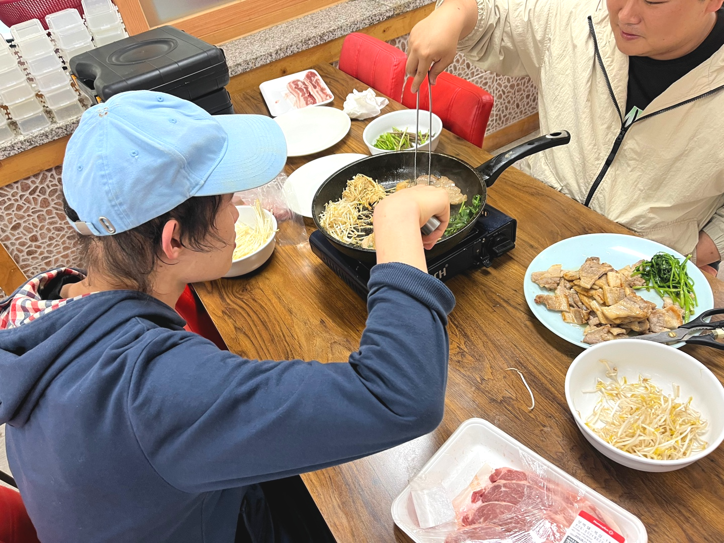 첫 번째 요리 – 숙주삼겹살볶음, 된장찌개, 김치전