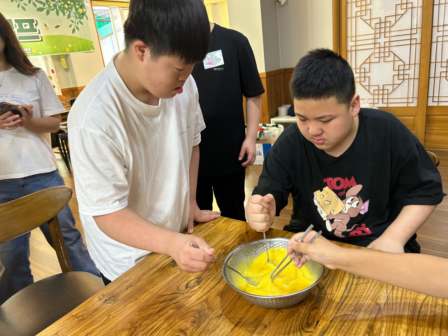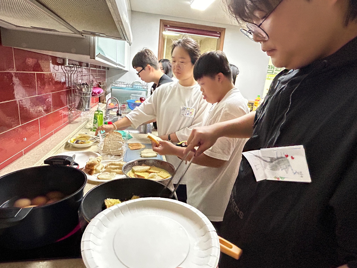 2일 차도 아침 식사는 아이들이 기대하는 요리인 프렌치토스트였습니다. 달걀을 깨고, 젓고, 굽고, 제티를 타보며 각자의 역할을 맡아 요리를 진행하였습니다.