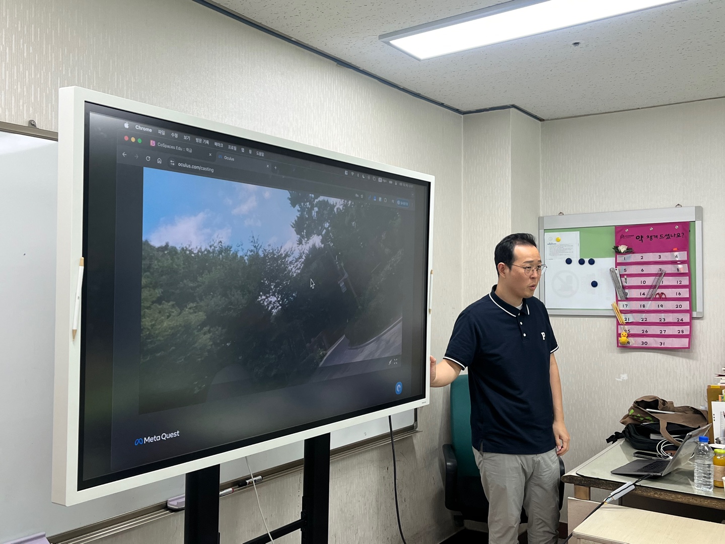 강사님이 먼저, 시스템을 뚝딱뚝딱 만지니, 우리가 직접 찍은사진이 360도로 구현되어 실감나게 보이게 합니다.