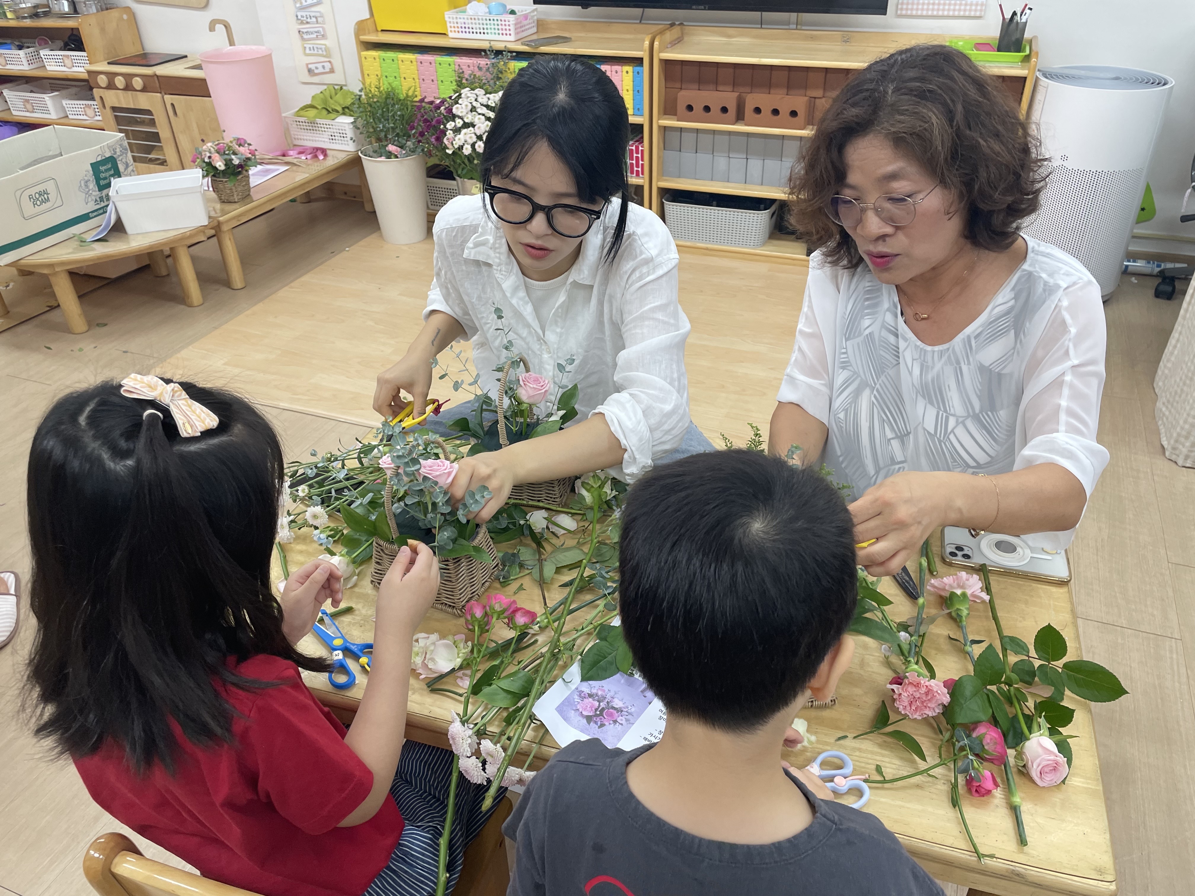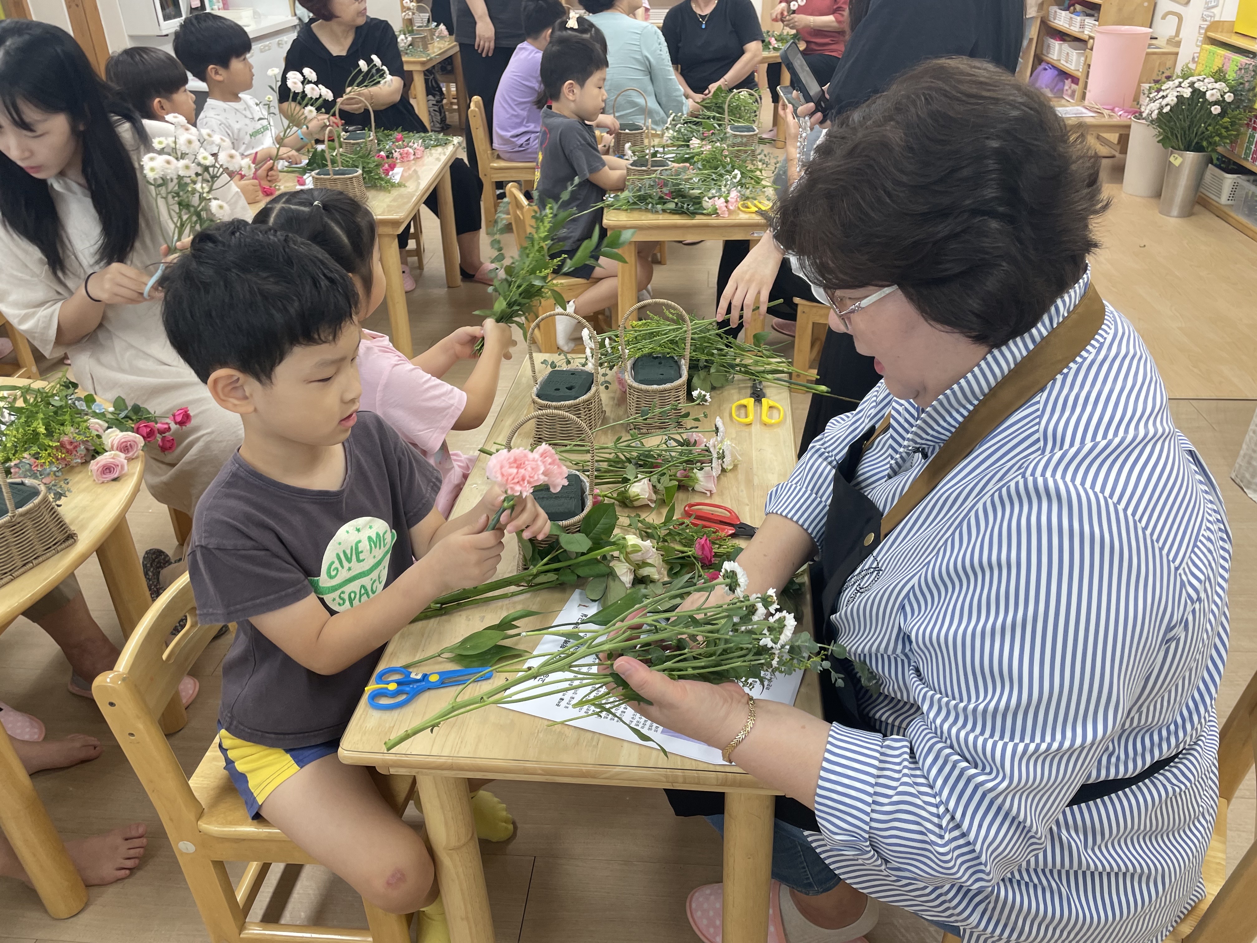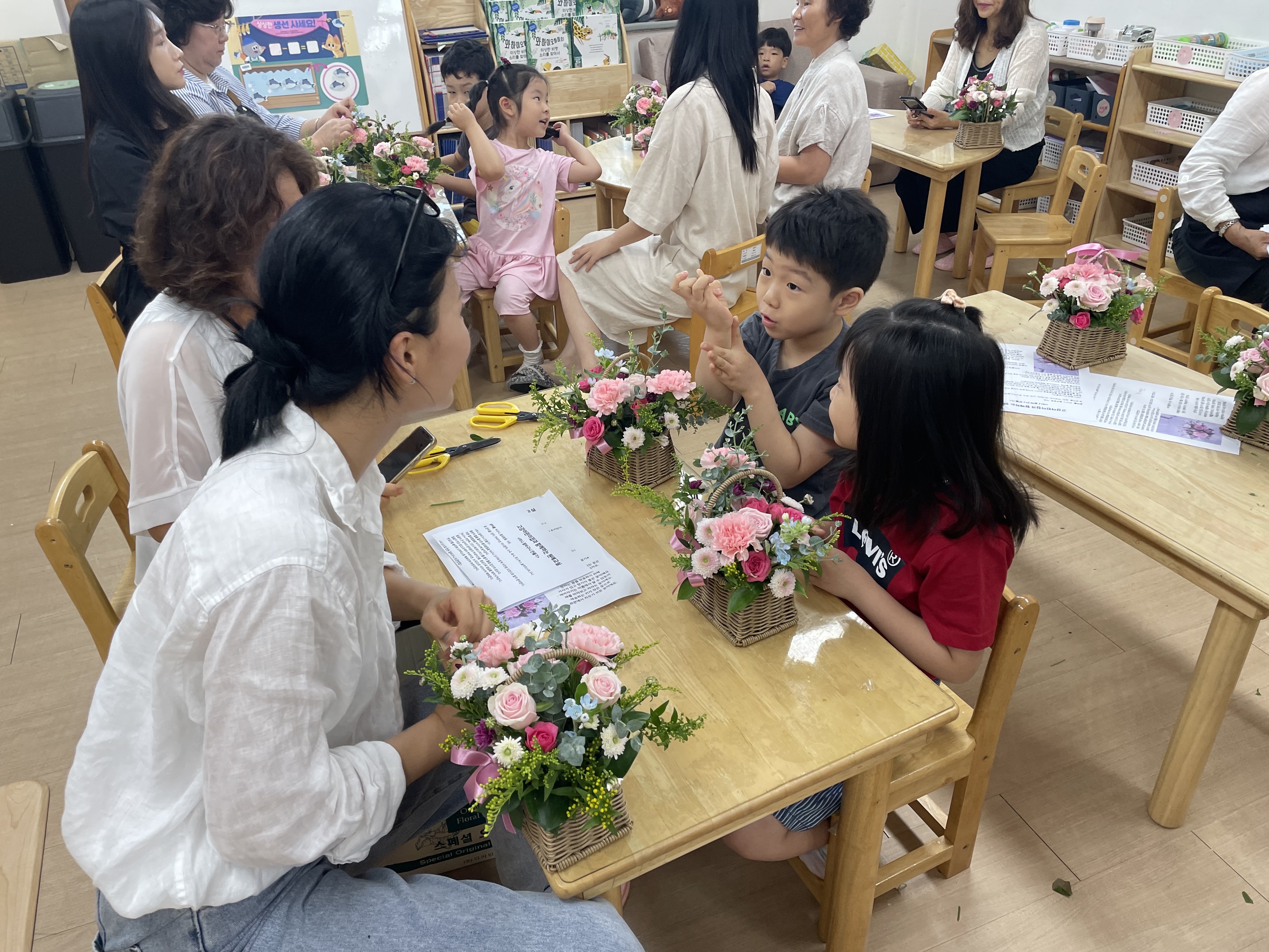 수강생들과 아이들의 상호작용을 통해 꽃바구니는 하나 둘 완성되었습니다.