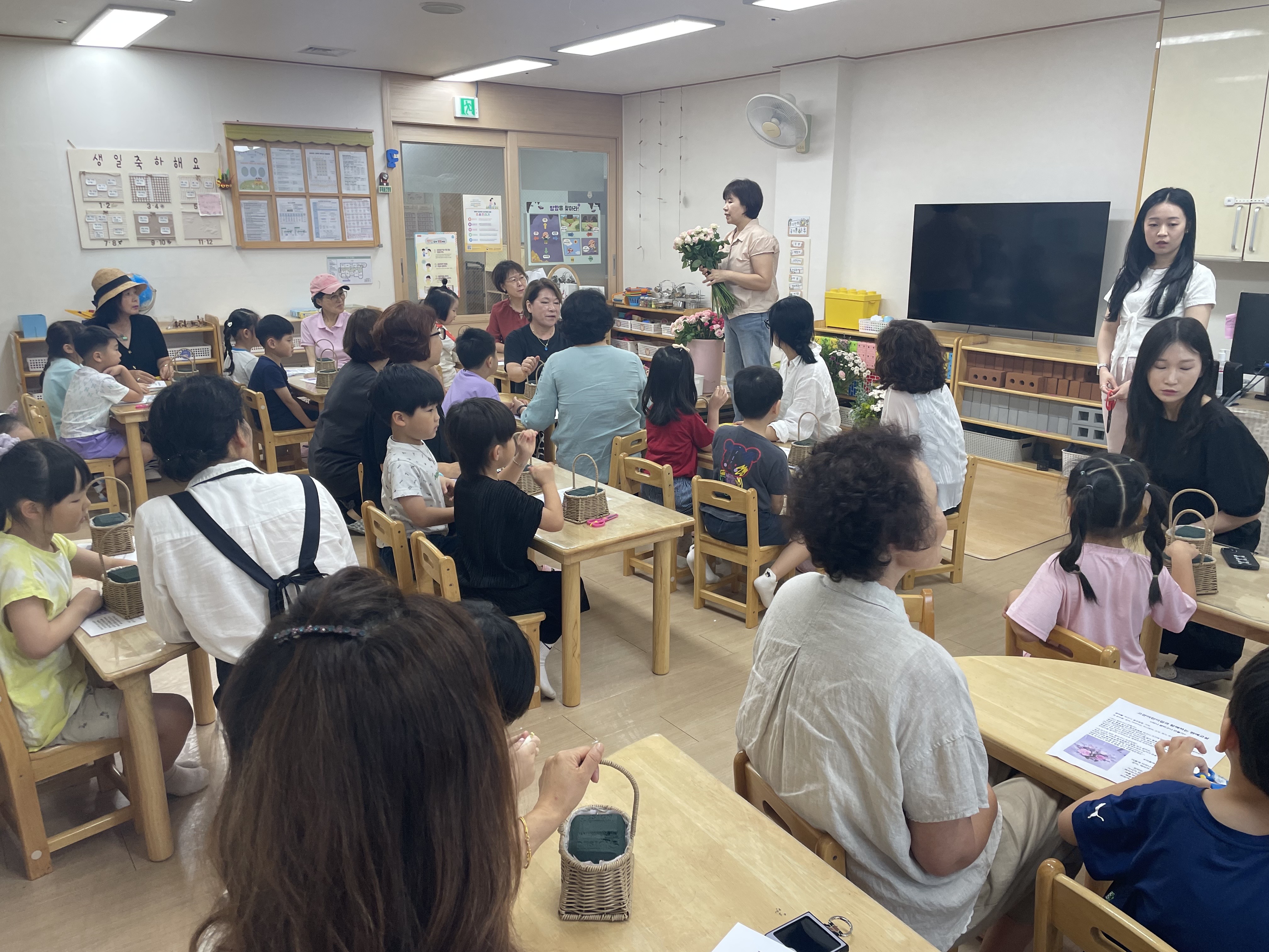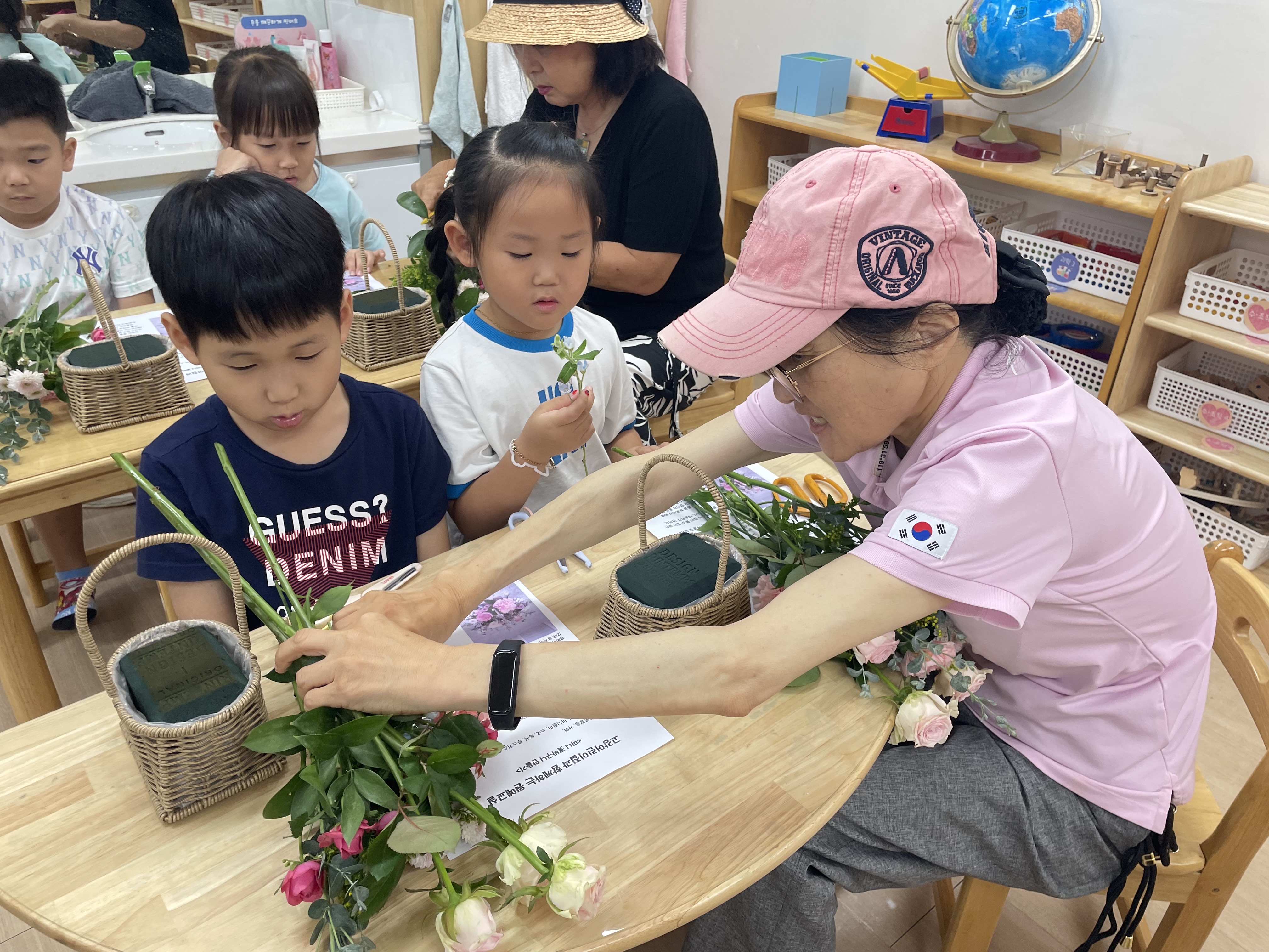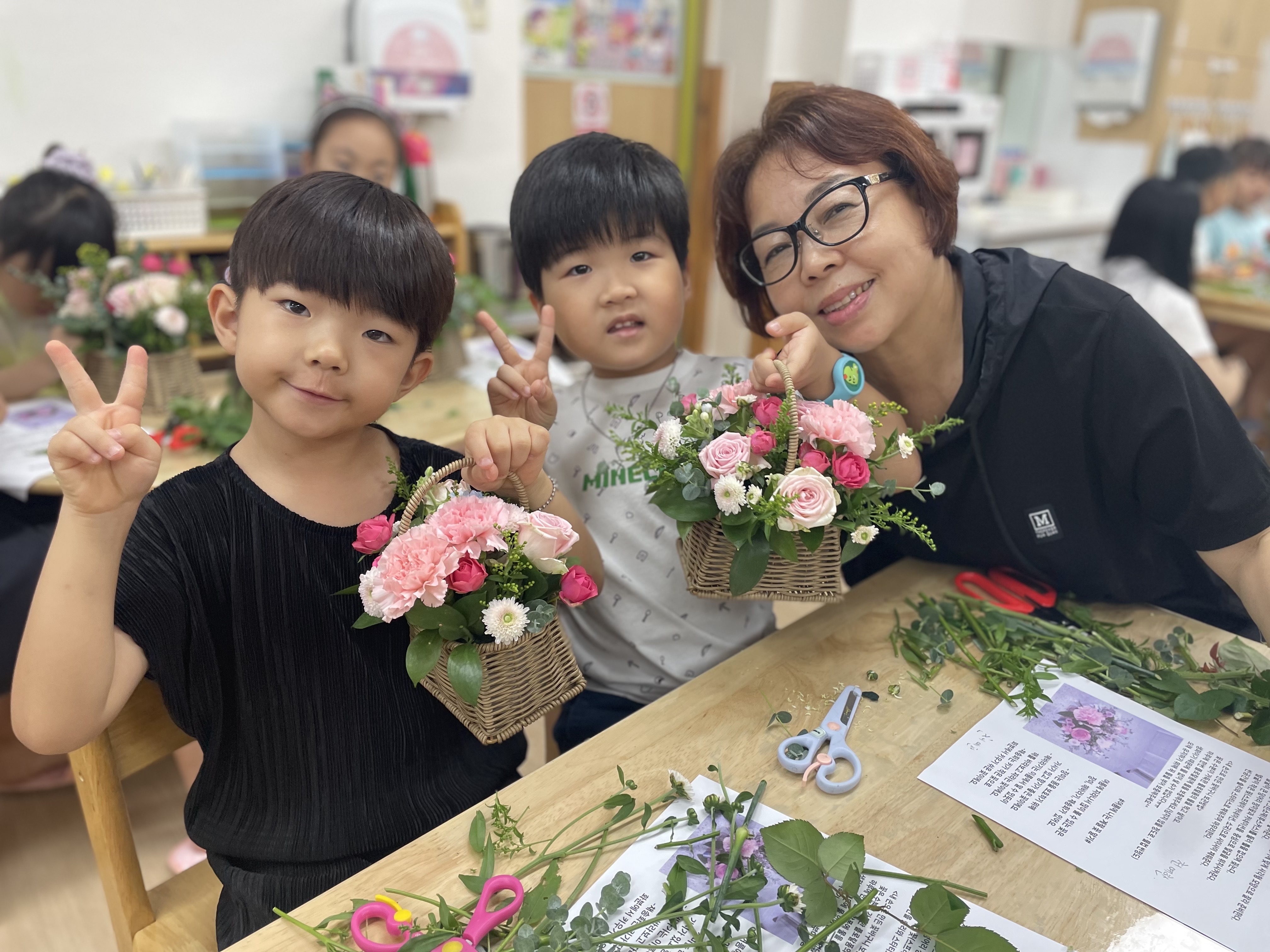 수강생들과 아이들의 상호작용을 통해 꽃바구니는 하나 둘 완성되었습니다.