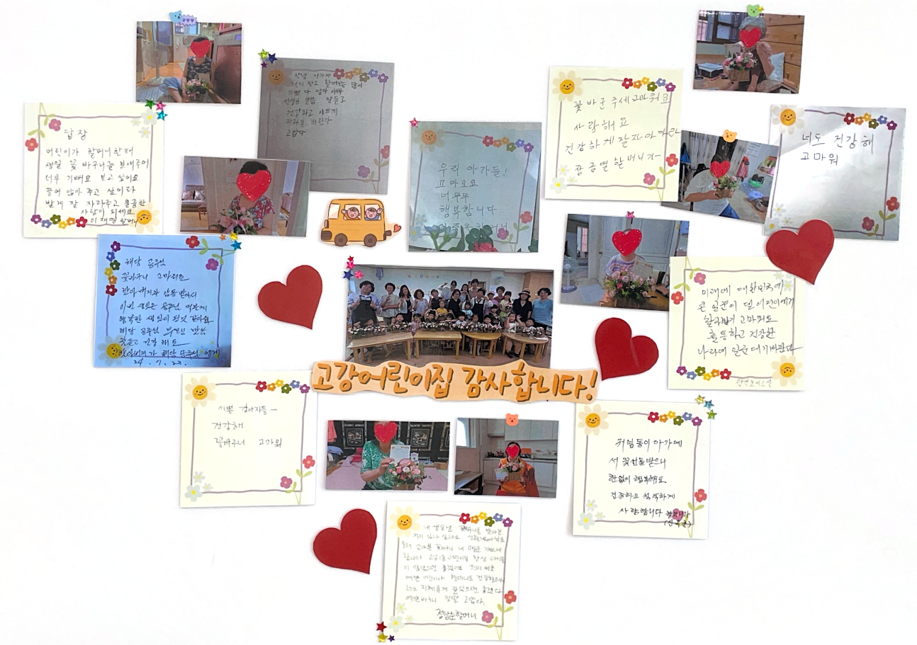 고강어린이집 푸른솔반 아이들이 손수 만든 꽃바구니는 고강종합사회복지관 노인맞춤돌봄서비스를 이용하는 어르신 20가정에 선물하였고 어르신들은 고마움을 가득 담아 꾹꾹 눌러쓴 편지를 어린이집에 전달하였습니다.