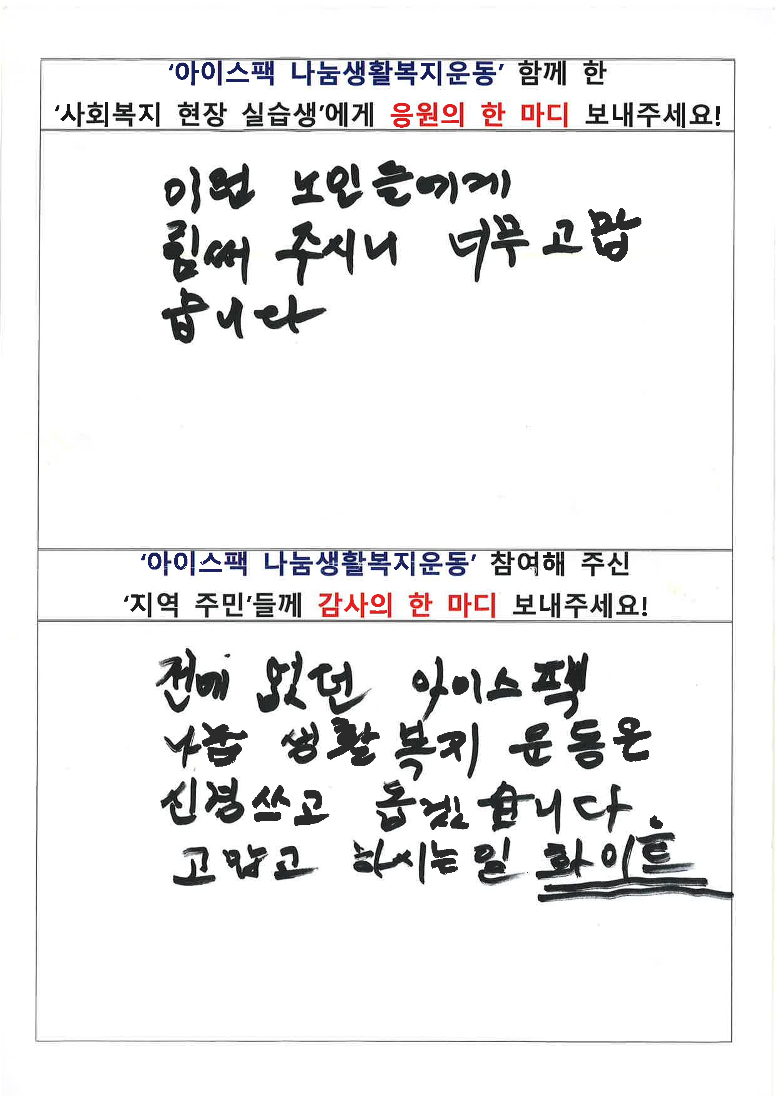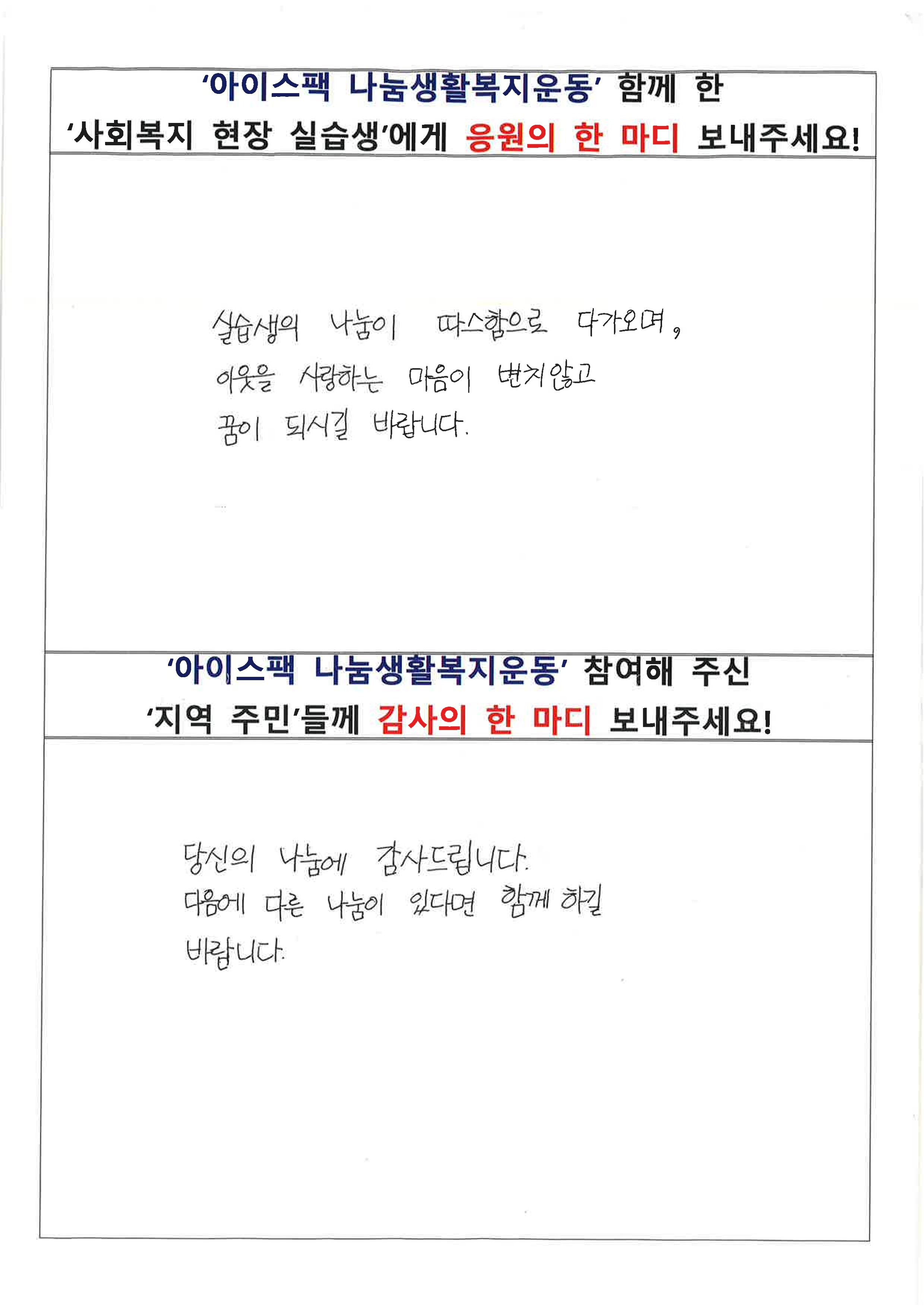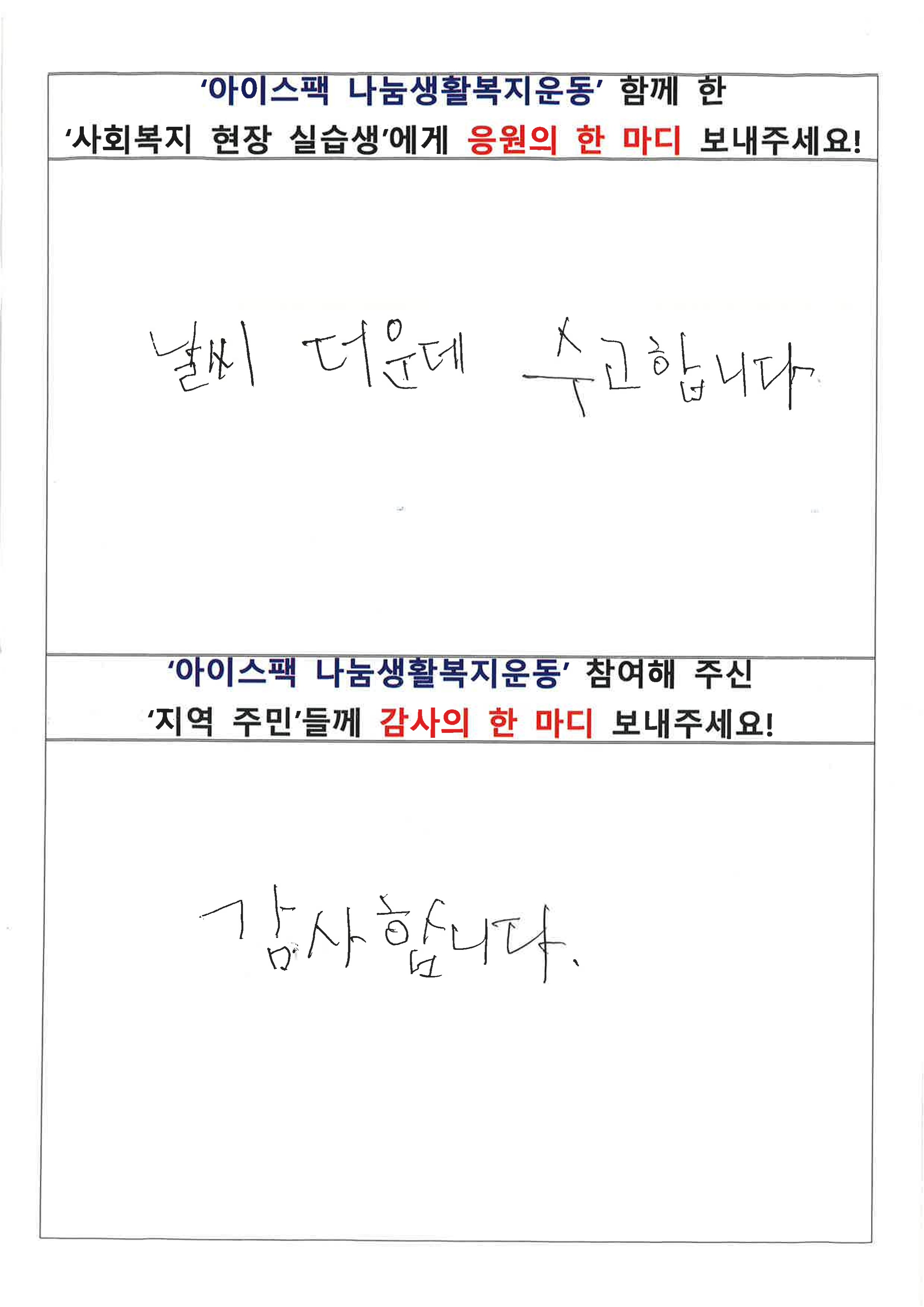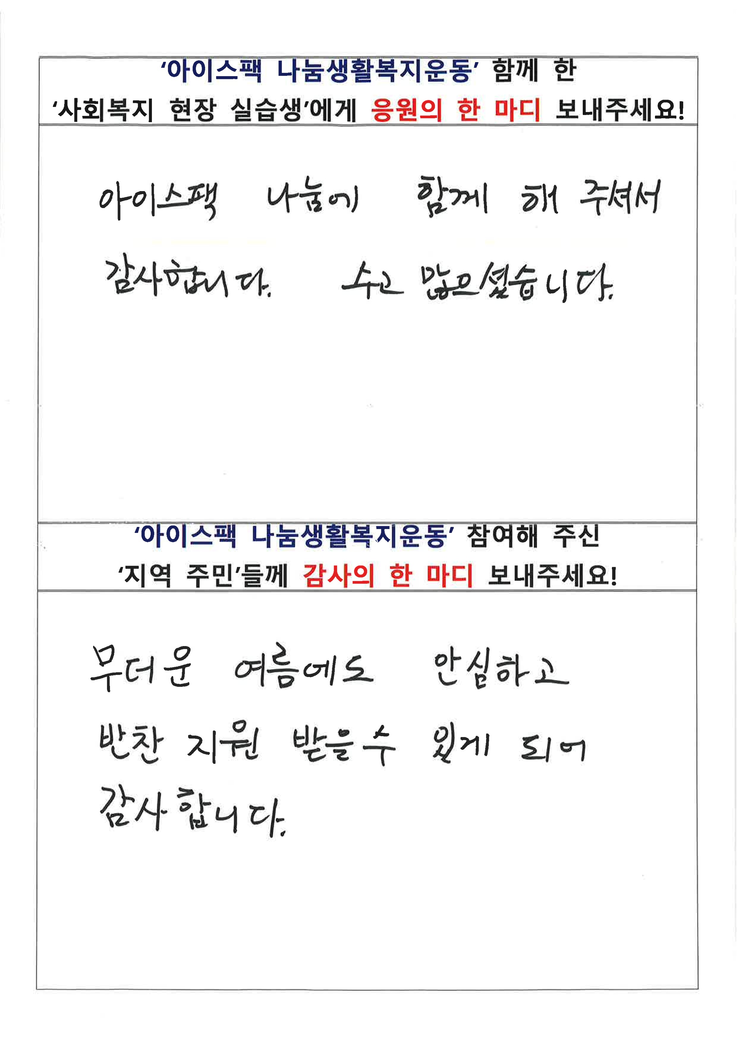 생활복지운동에 참여해 주신 주민 분들이 남겨 주신 소감입니다. 도움 주신 것만으로도 충분한데 나눔에 참여할 수 있음에 기뻐하시는 모습을 보니 감사한 마음이 깊어집니다.