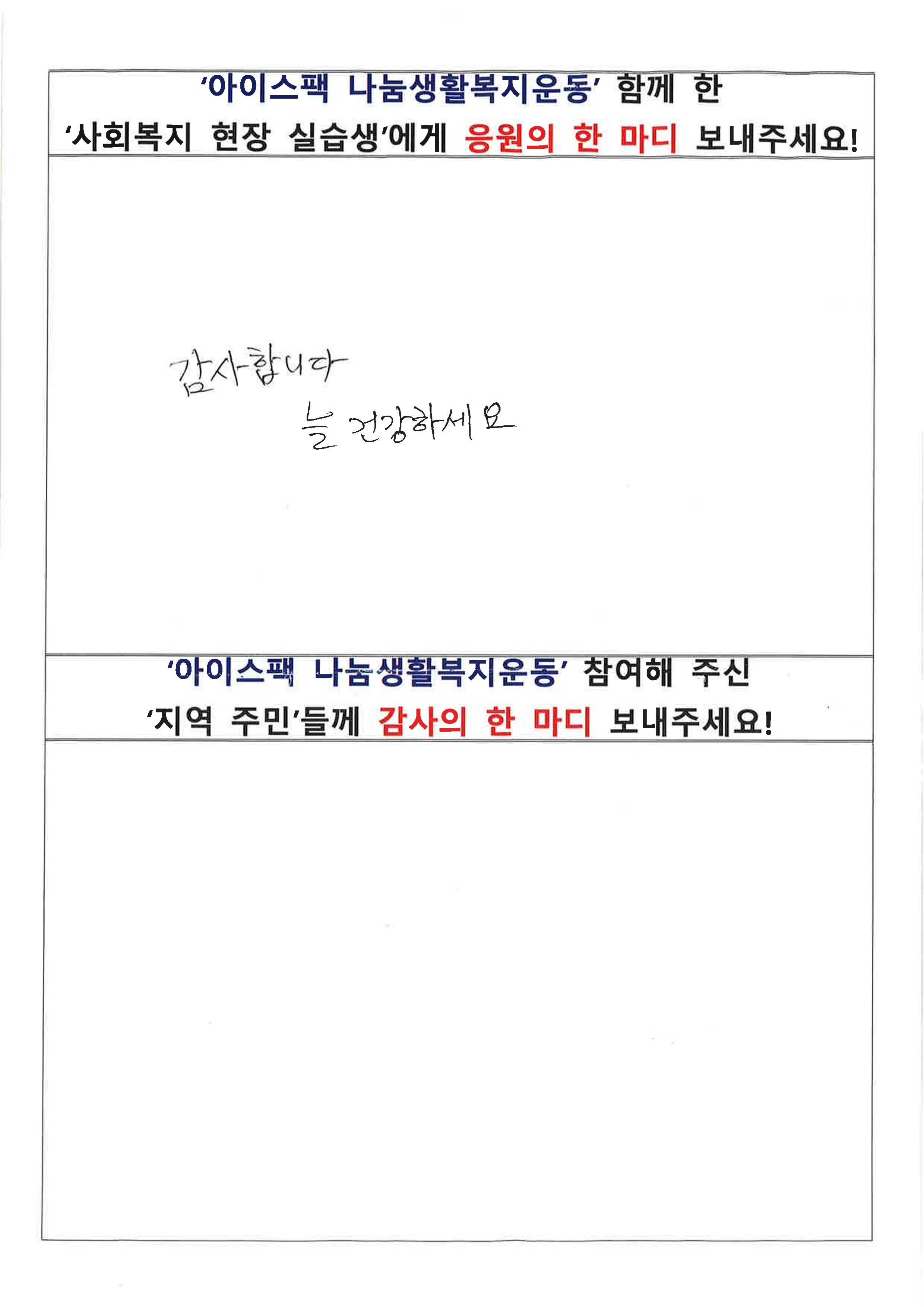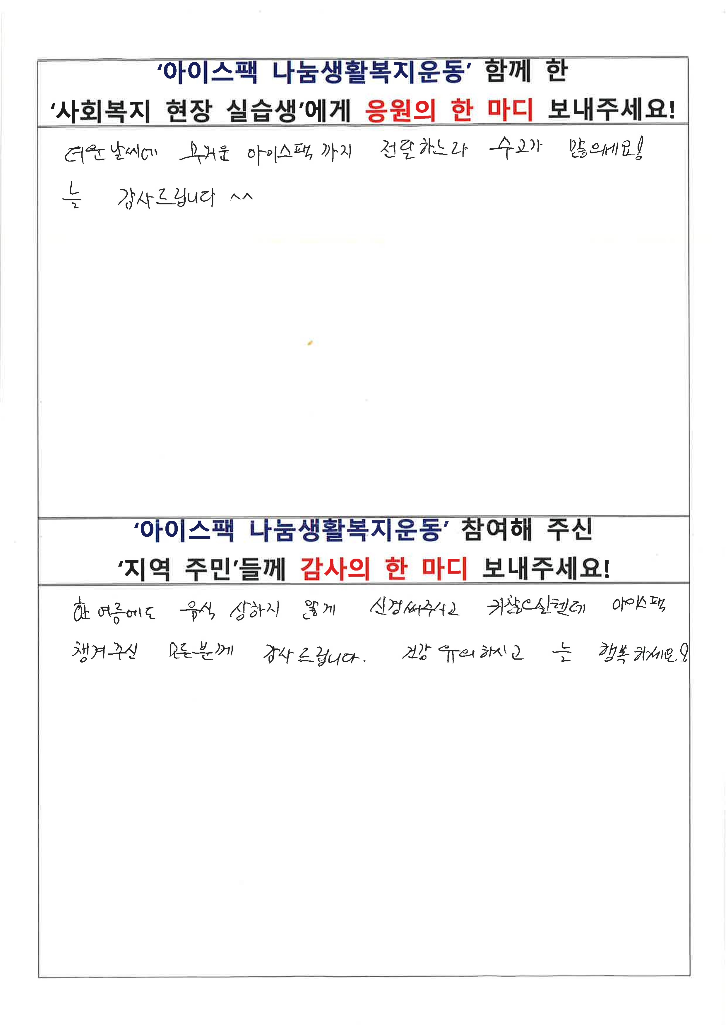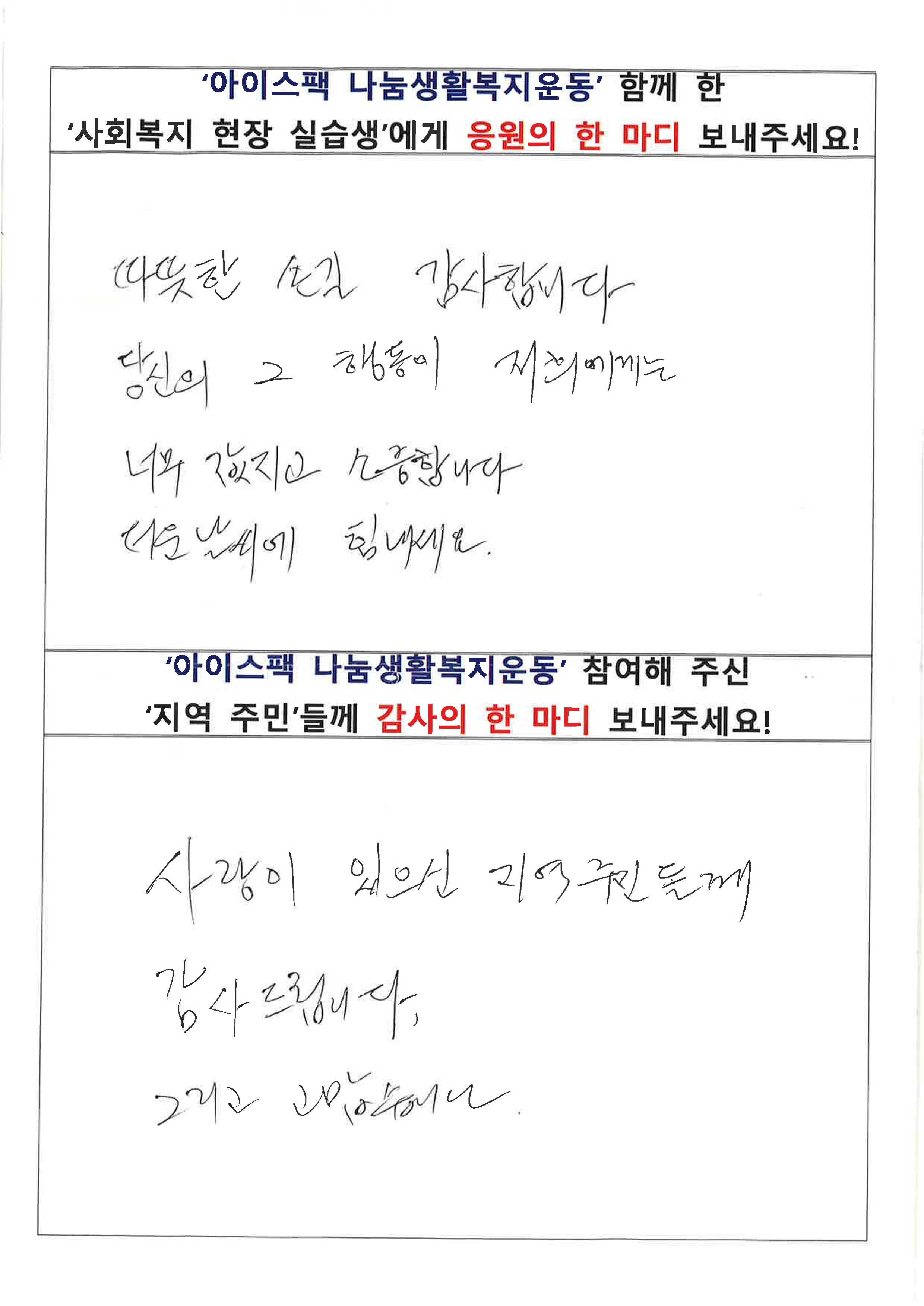 생활복지운동에 참여해 주신 주민 분들이 남겨 주신 소감입니다. 도움 주신 것만으로도 충분한데 나눔에 참여할 수 있음에 기뻐하시는 모습을 보니 감사한 마음이 깊어집니다.