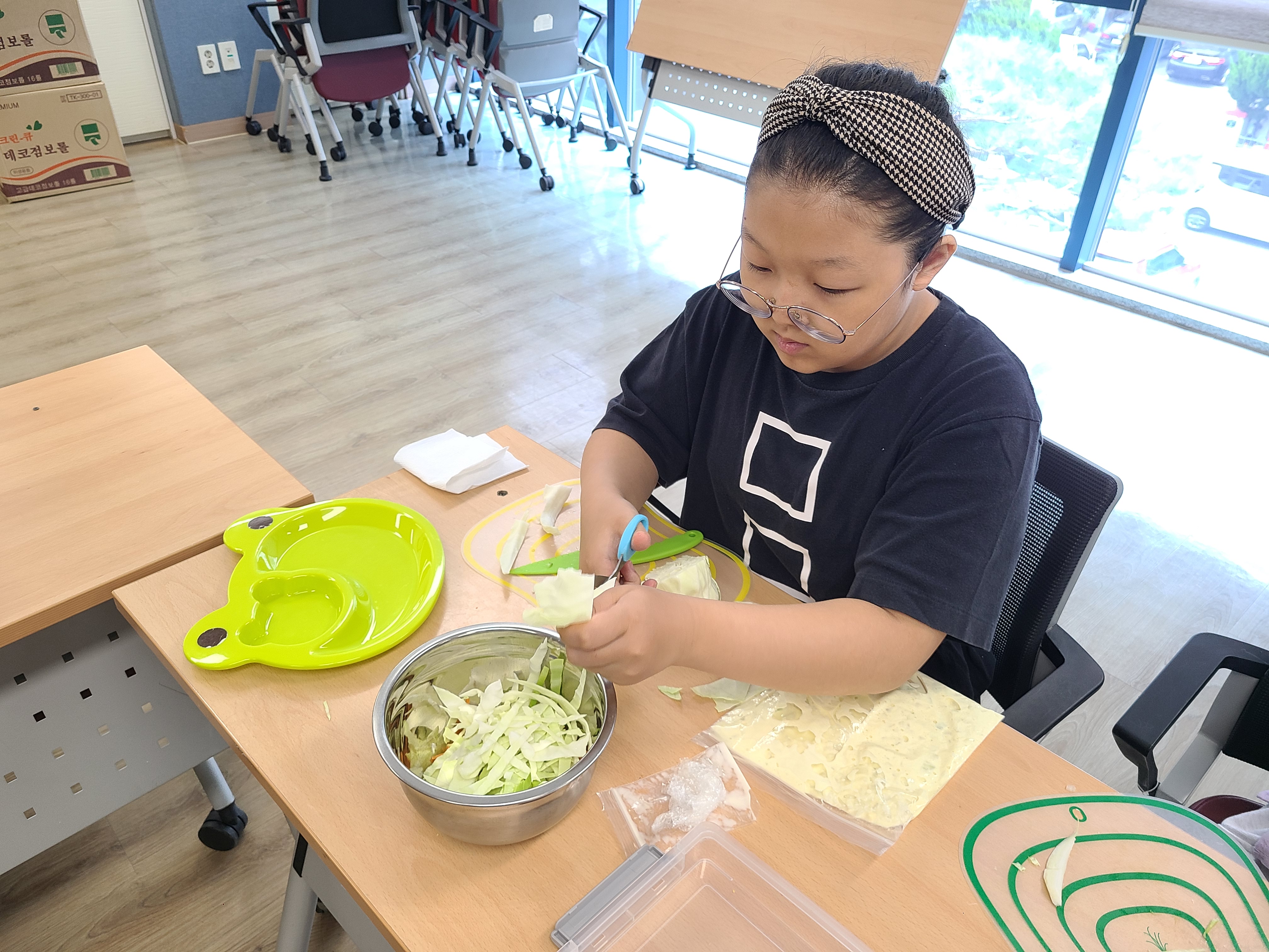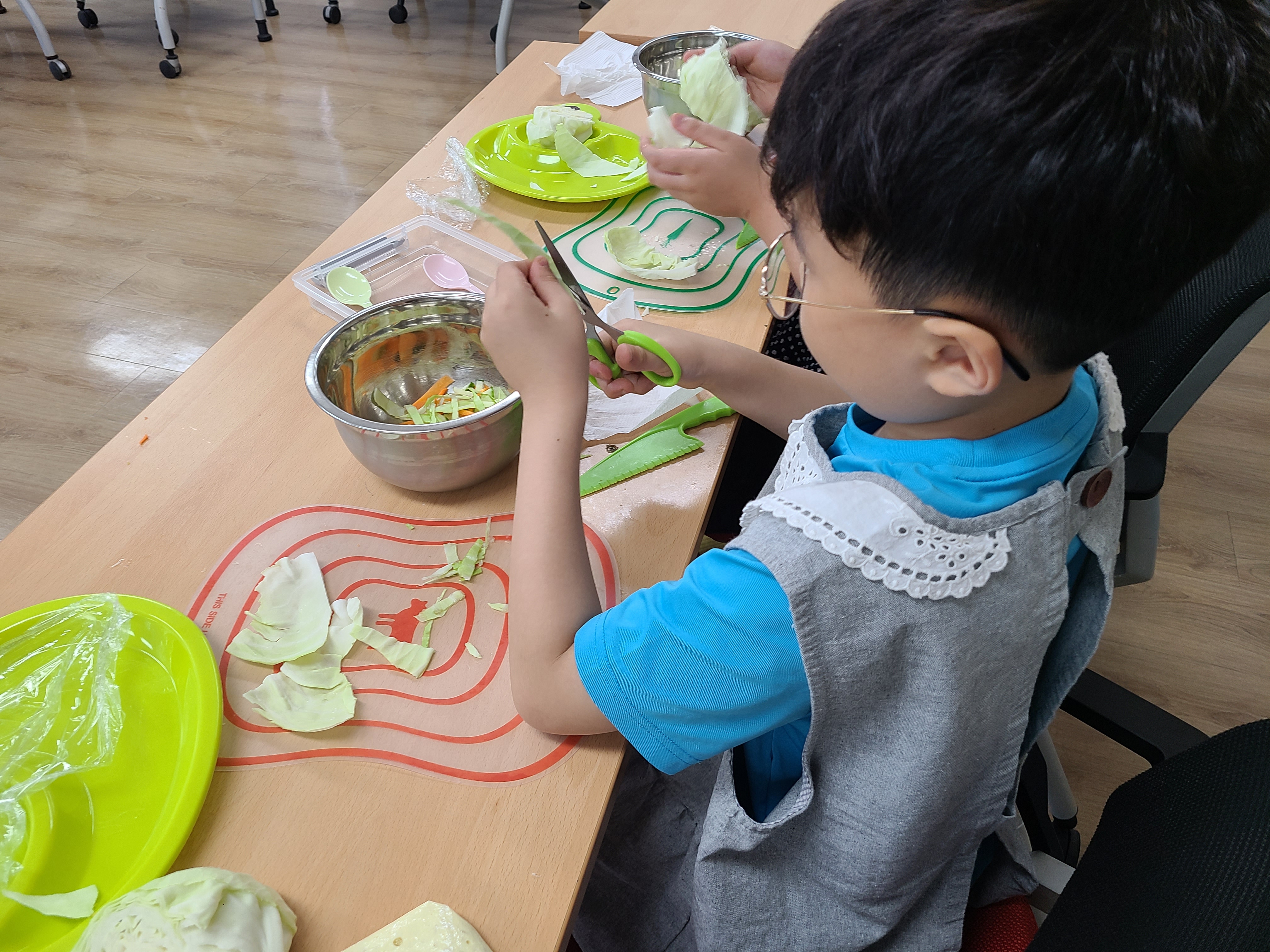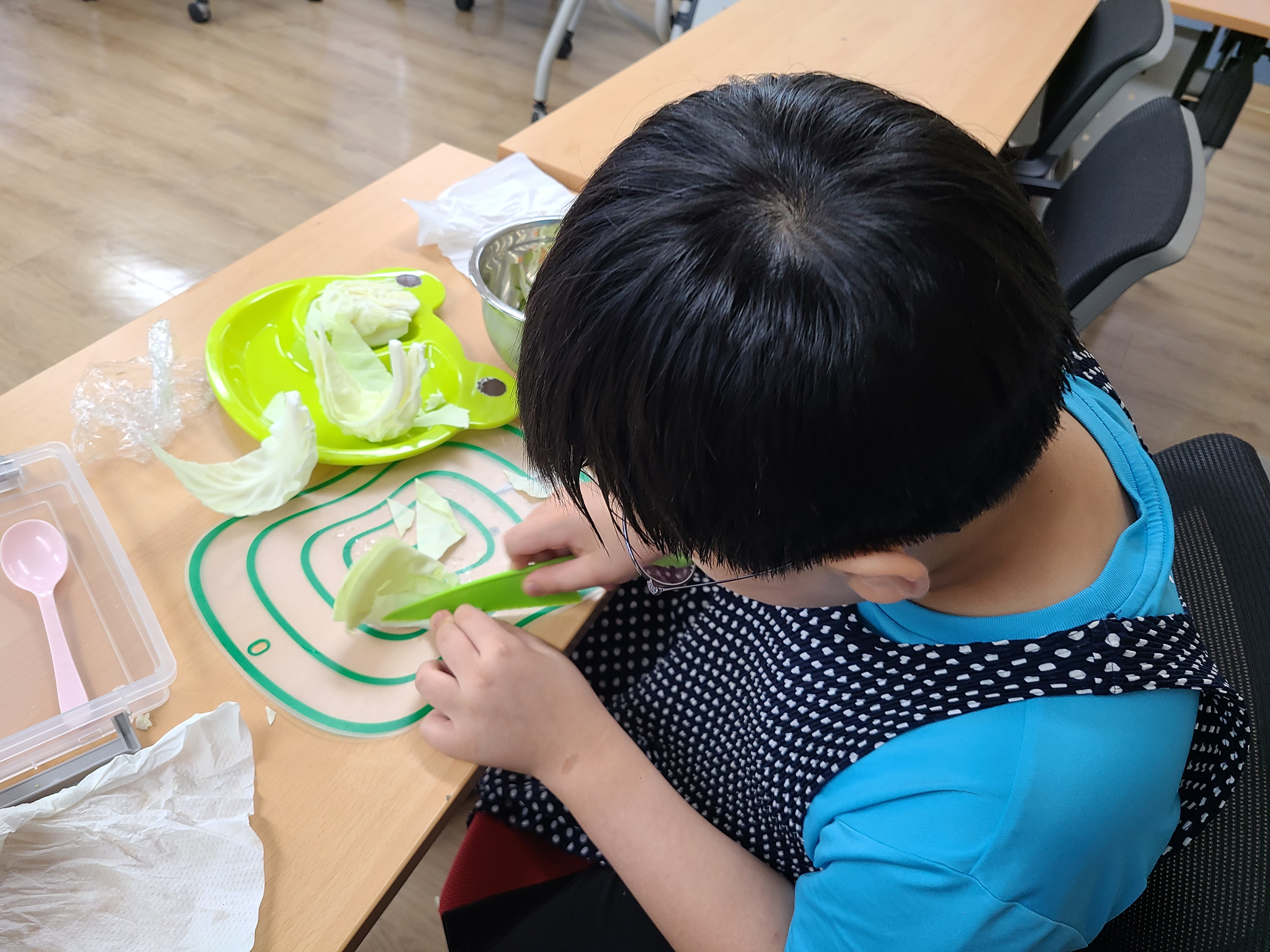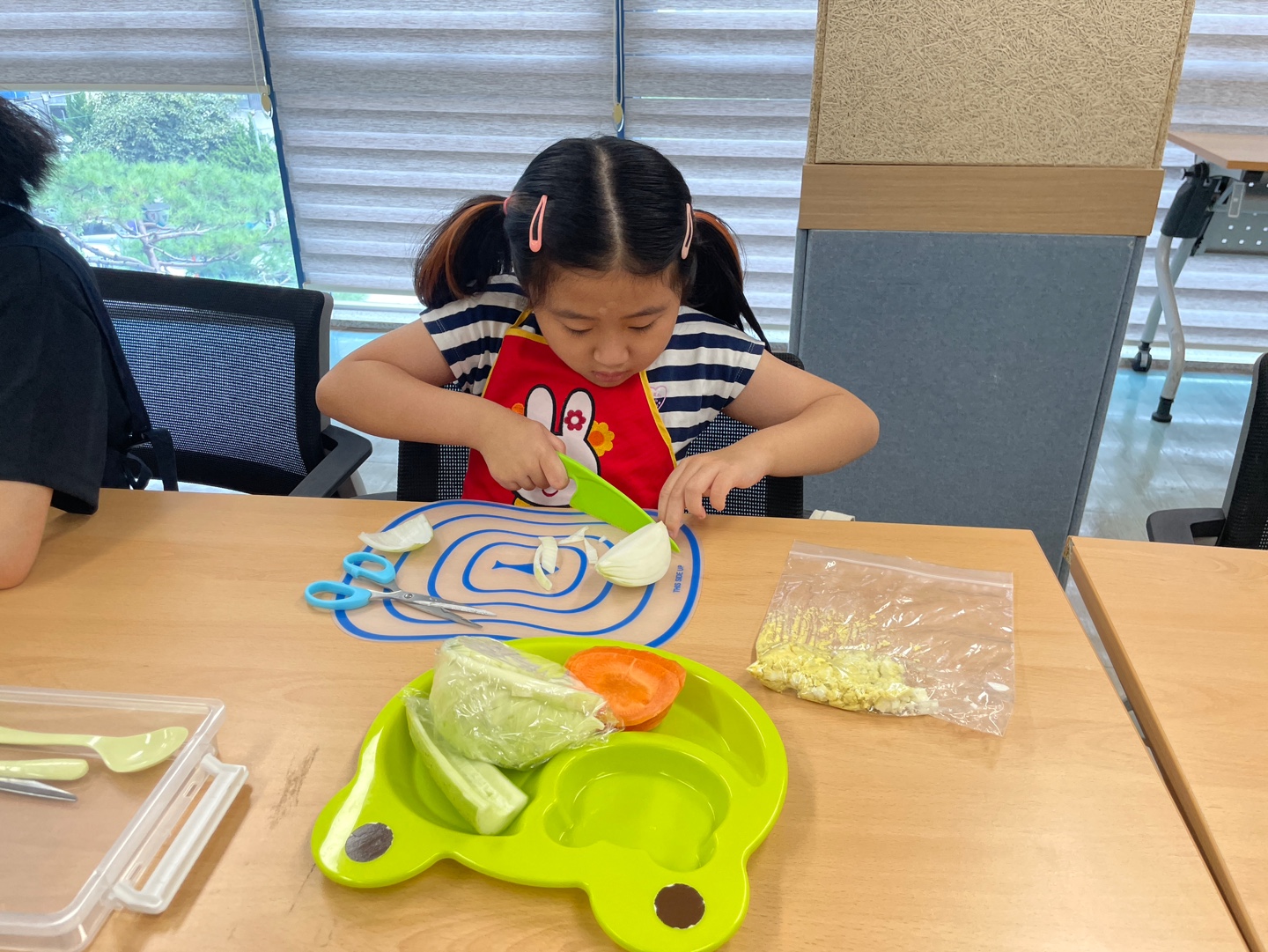 먼저 주의사항을 알려줍니다. 고학년이 함께하는 자리라 양파도 썰어보기로 했습니다. 양파를 만진 손, 칼과 가위를 든 손으로 얼굴을 만지지 않는 것도 중요합니다.
