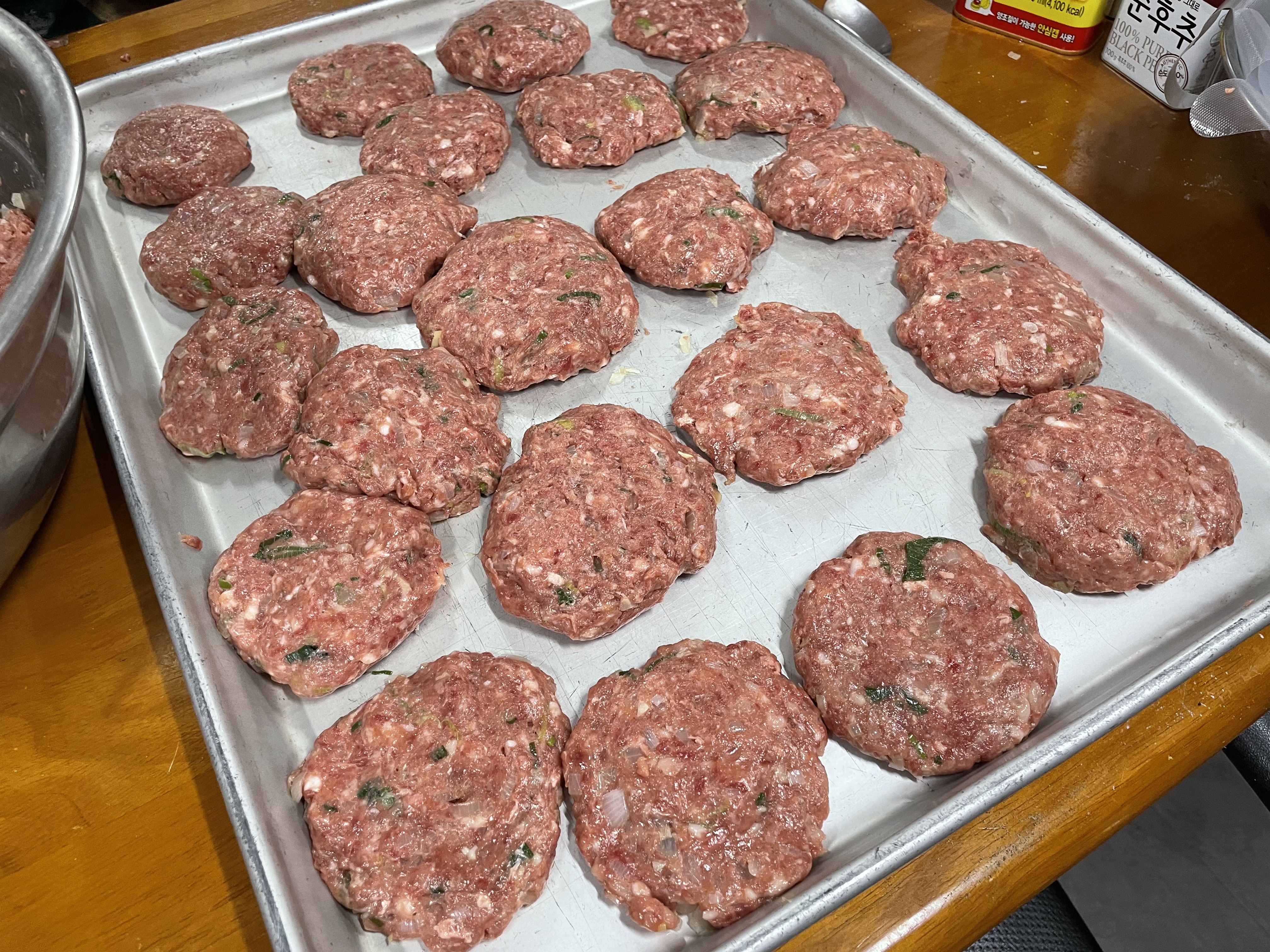 다들 위생장갑을 끼고 하나 둘 둘러모여 찹찹 소리가 나는 떡갈비를 만들었습니다.