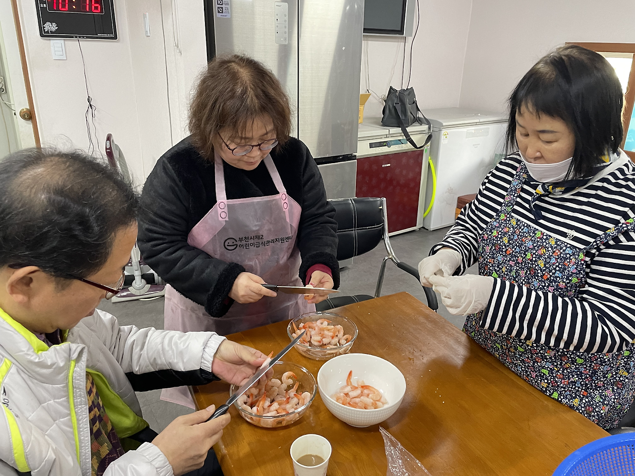 함께 둘러 모여 새우와 마늘, 토마토 등 빠르게 손질을 하였습니다.