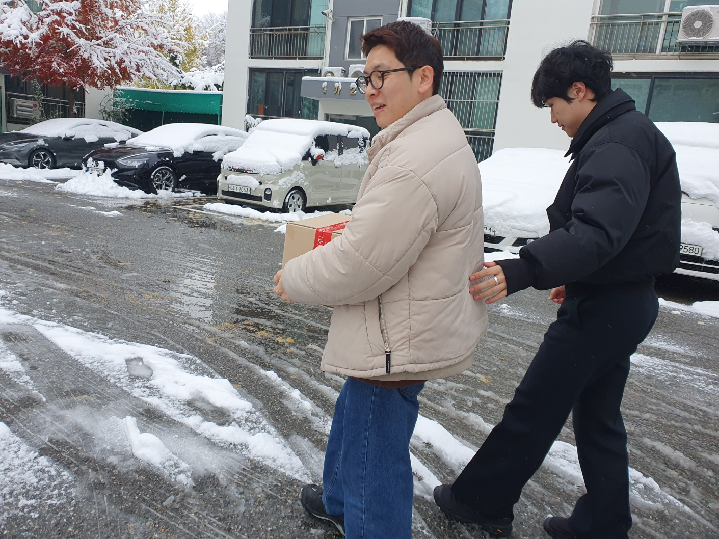 눈내리는 시간에 가가호호 방문하여 김치를 전해주신