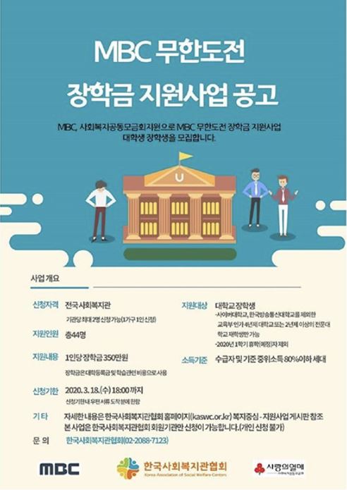 MBC무한도전팀 후원, 사회복지공동모금회 지원으로 한국사회복지관 협회에서 장학금 지원사업을 진행합니다. 올해 2020년도에는 저소득 가정 대학생 44명에게 1인당 350만원 장학금을 지원하였습니다 :-)