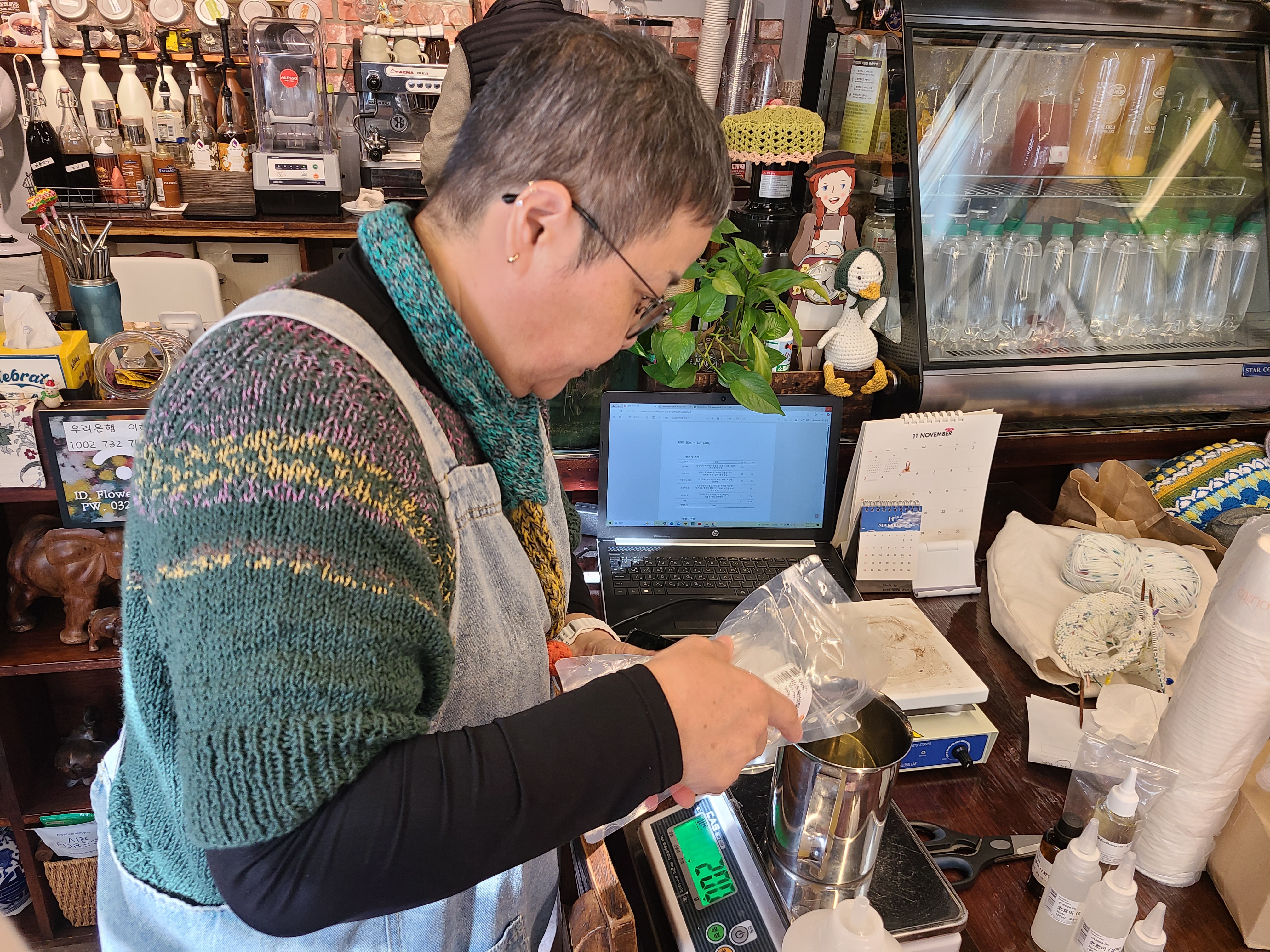 호호바오일, 아보카도오일, 시어버터 등의 재료를 정해진 양만큼 섞고 취향에 맞게 향을 넣습니다.