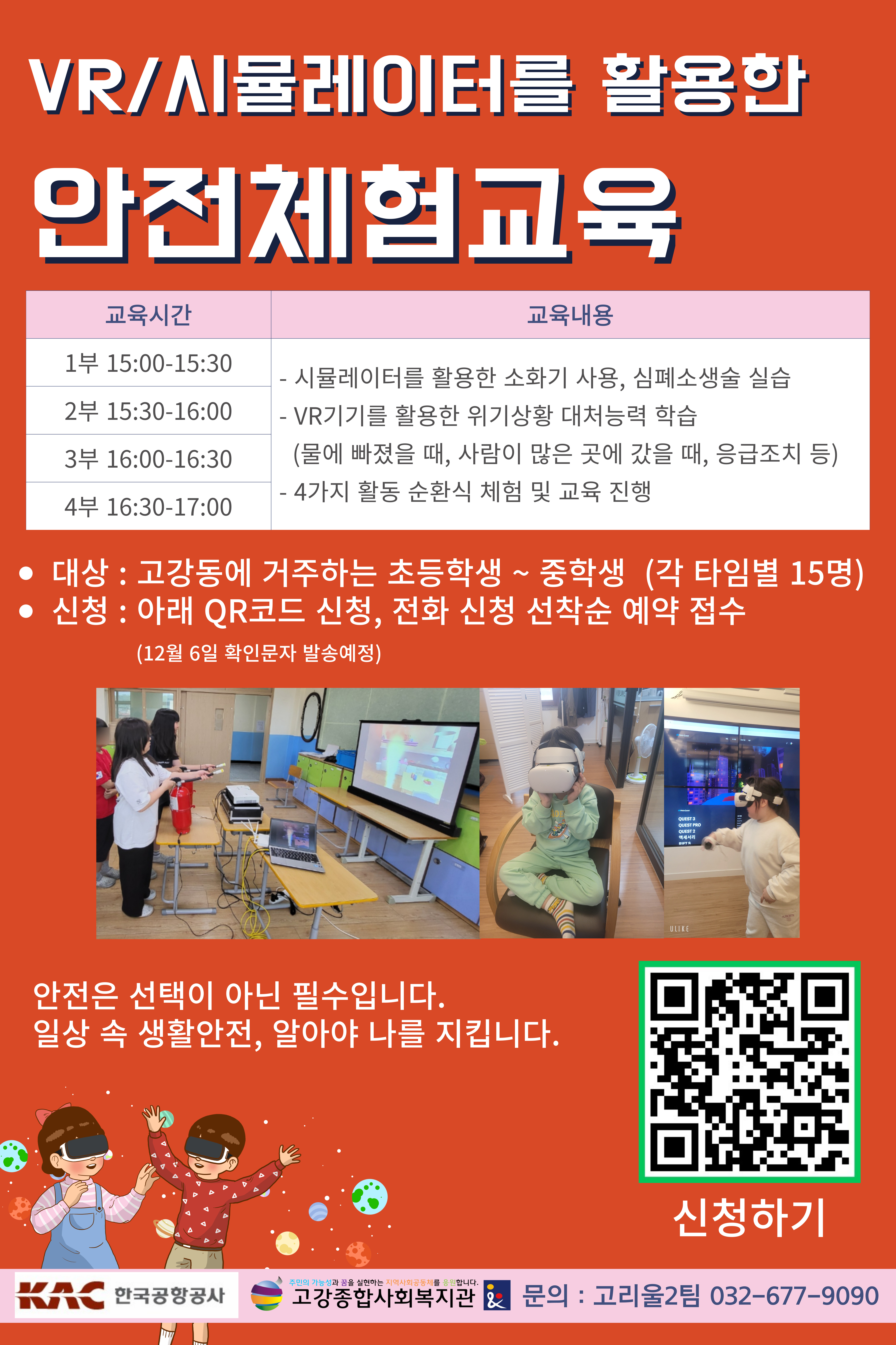 고강종합사회복지관에서 진행하는 안전체험교육 신청 페이지입니다. 중복신청시 최초 신청 1건 만 반영됩니다. 문의 : 고강종합사회복지관 고리울2팀 032-677-9090