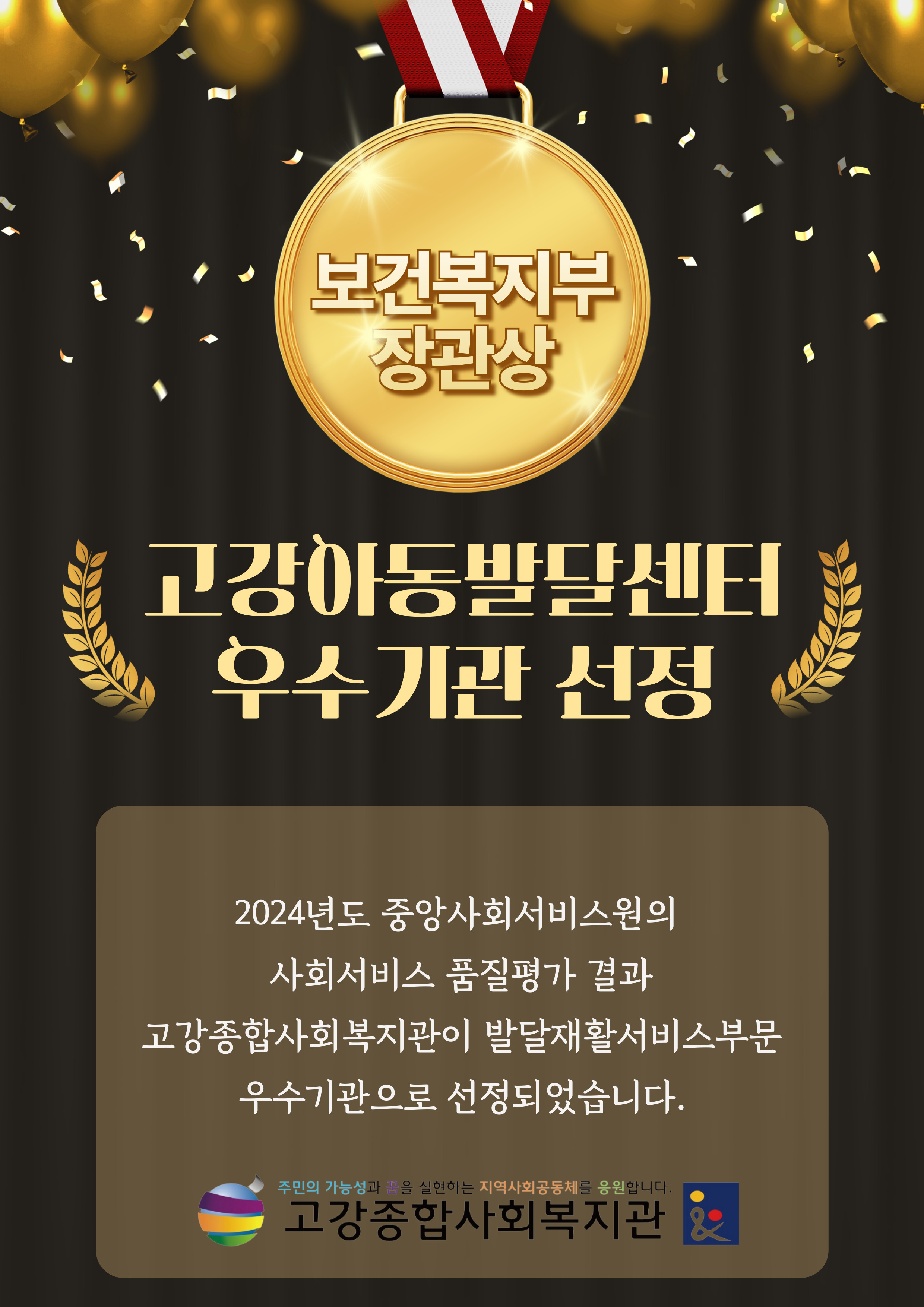 ✨ 고강아동발달센터는 2024년 사회서비스 품질평가에서 발달재활서비스 부문 최우수 기관으로 선정되어 보건복지부장관상을 수상하는 영예를 안았습니다!