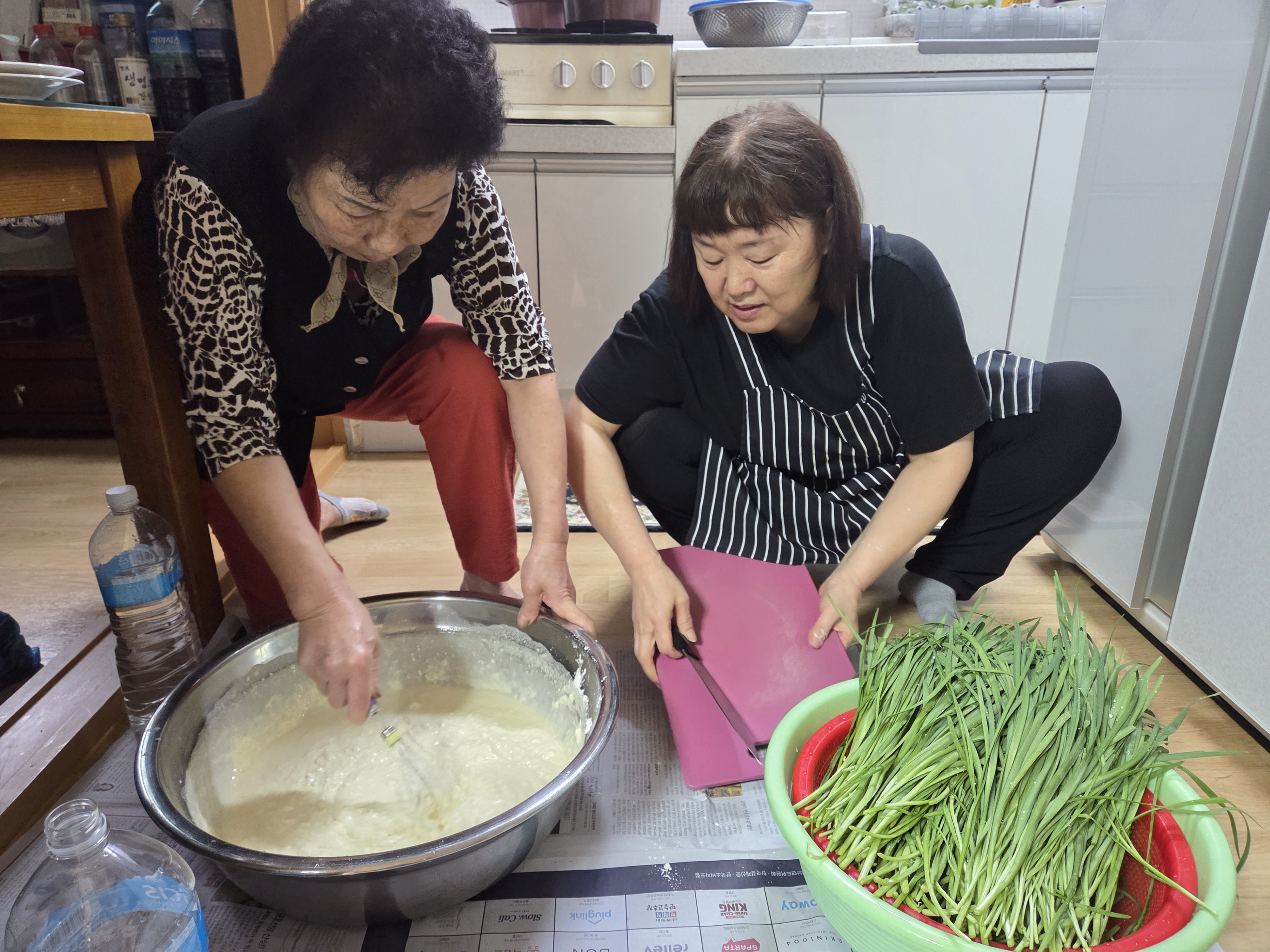 앞치마를 내어주시고, 주방을 빌려주시며 함께 부침개 준비를 하십니다.
