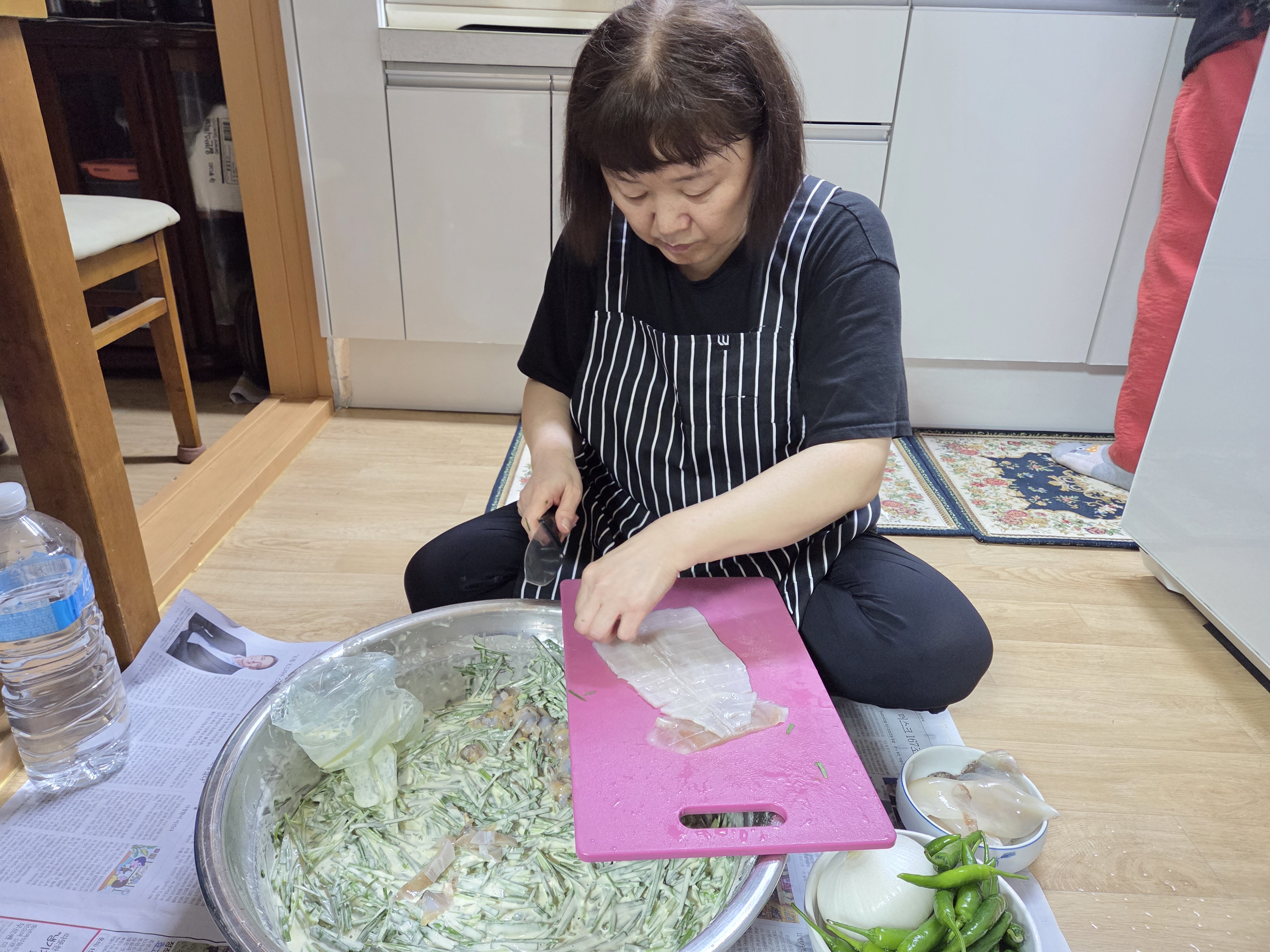 앞치마를 내어주시고, 주방을 빌려주시며 함께 부침개 준비를 하십니다.