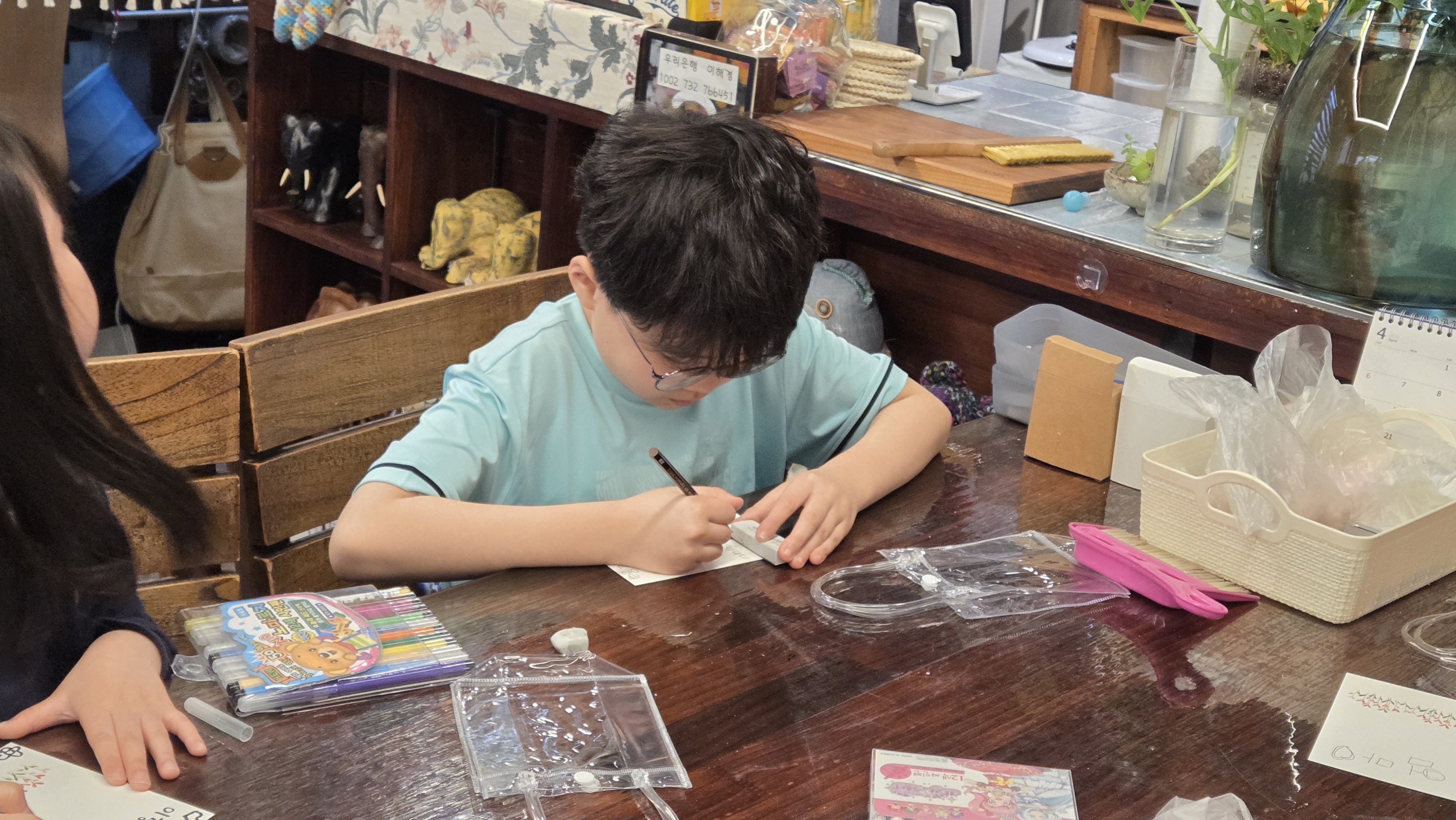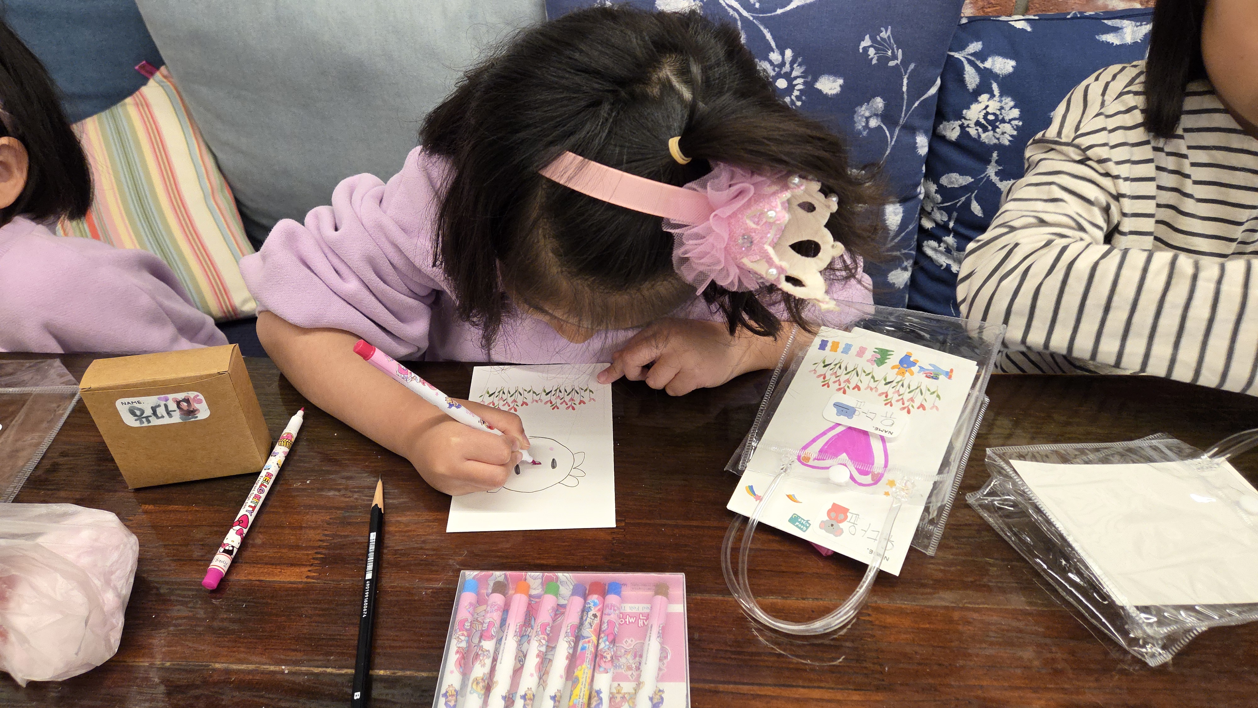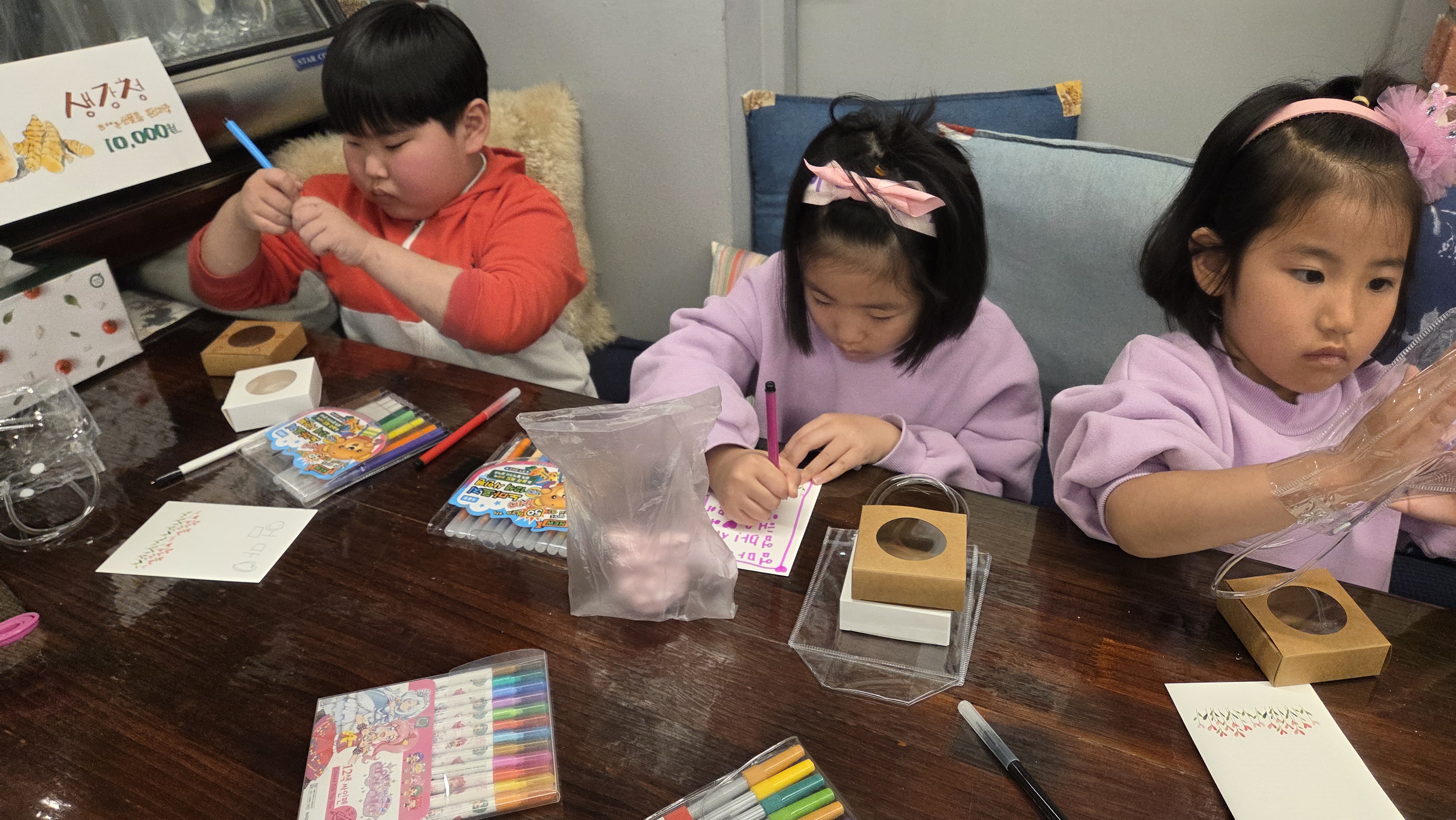 비누를 만드는 동안 시끌시끌 재잘재잘 하던 우리 친구들이 주물럭 비누를 만들고, 엽서를 쓸 때는 굉장히 조용해졌습니다.