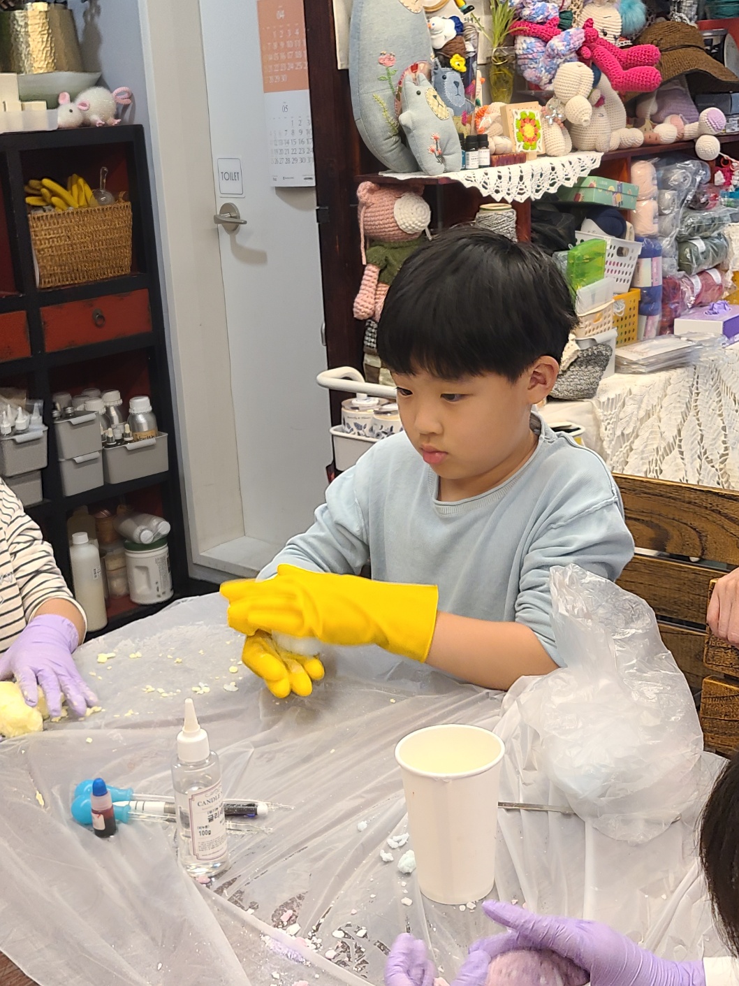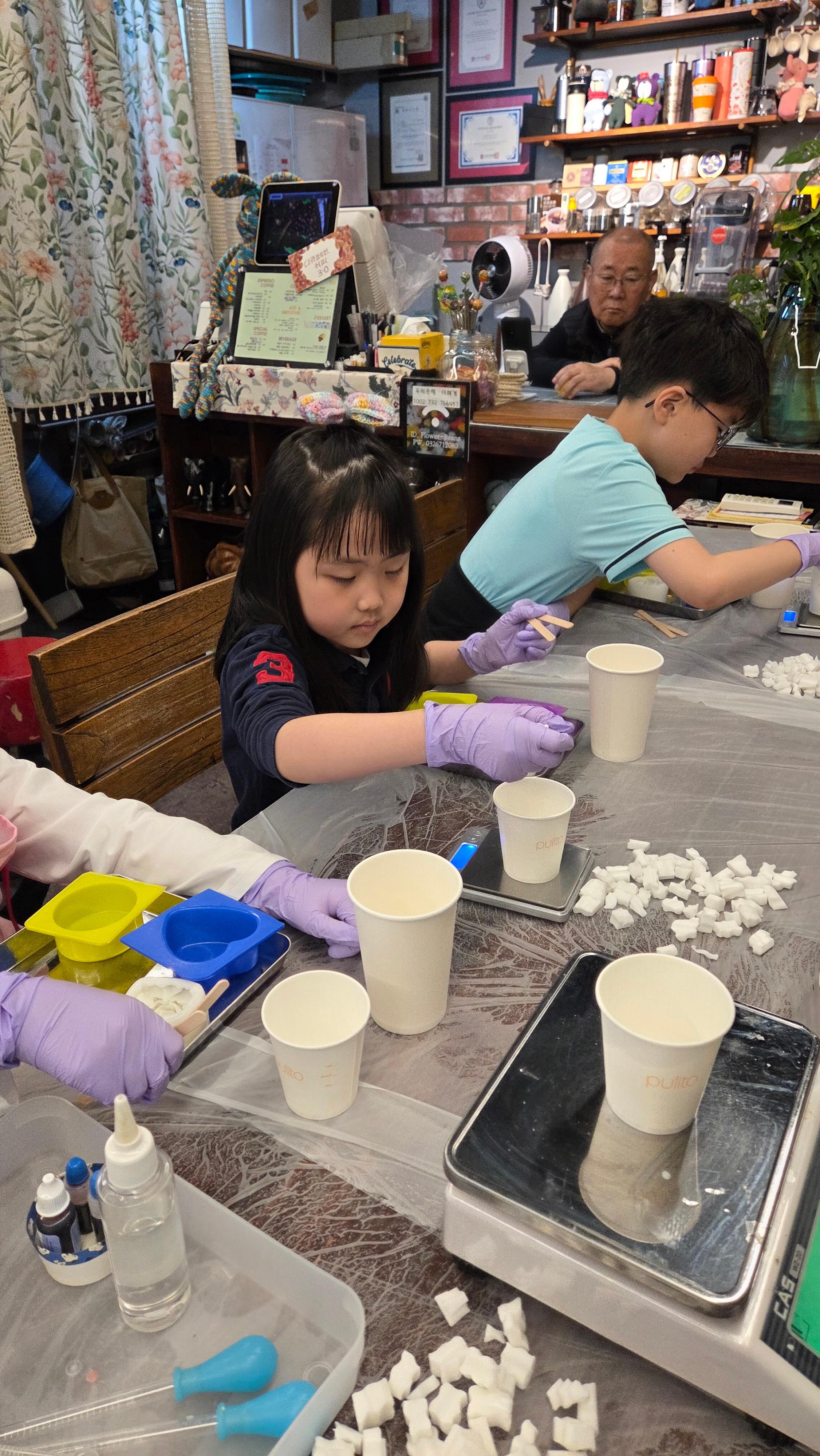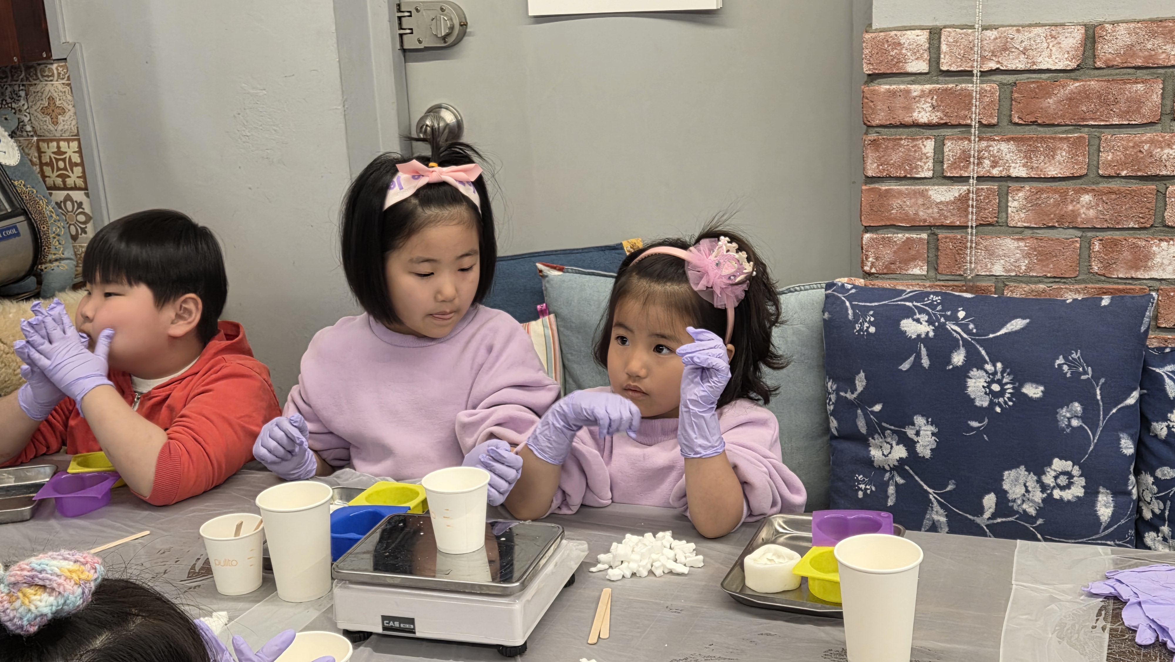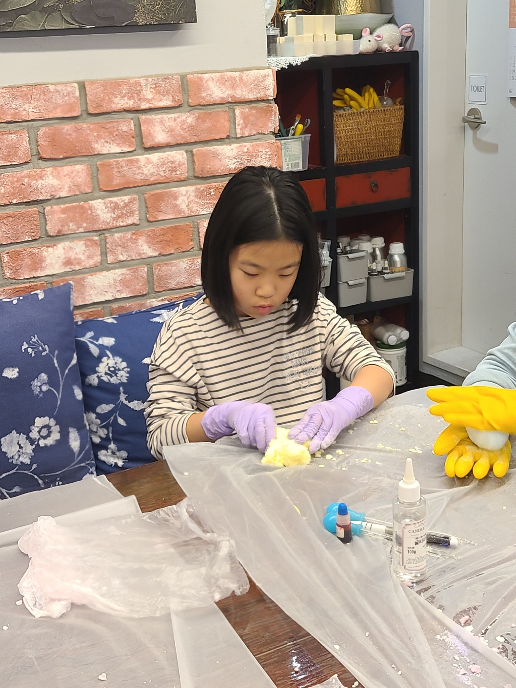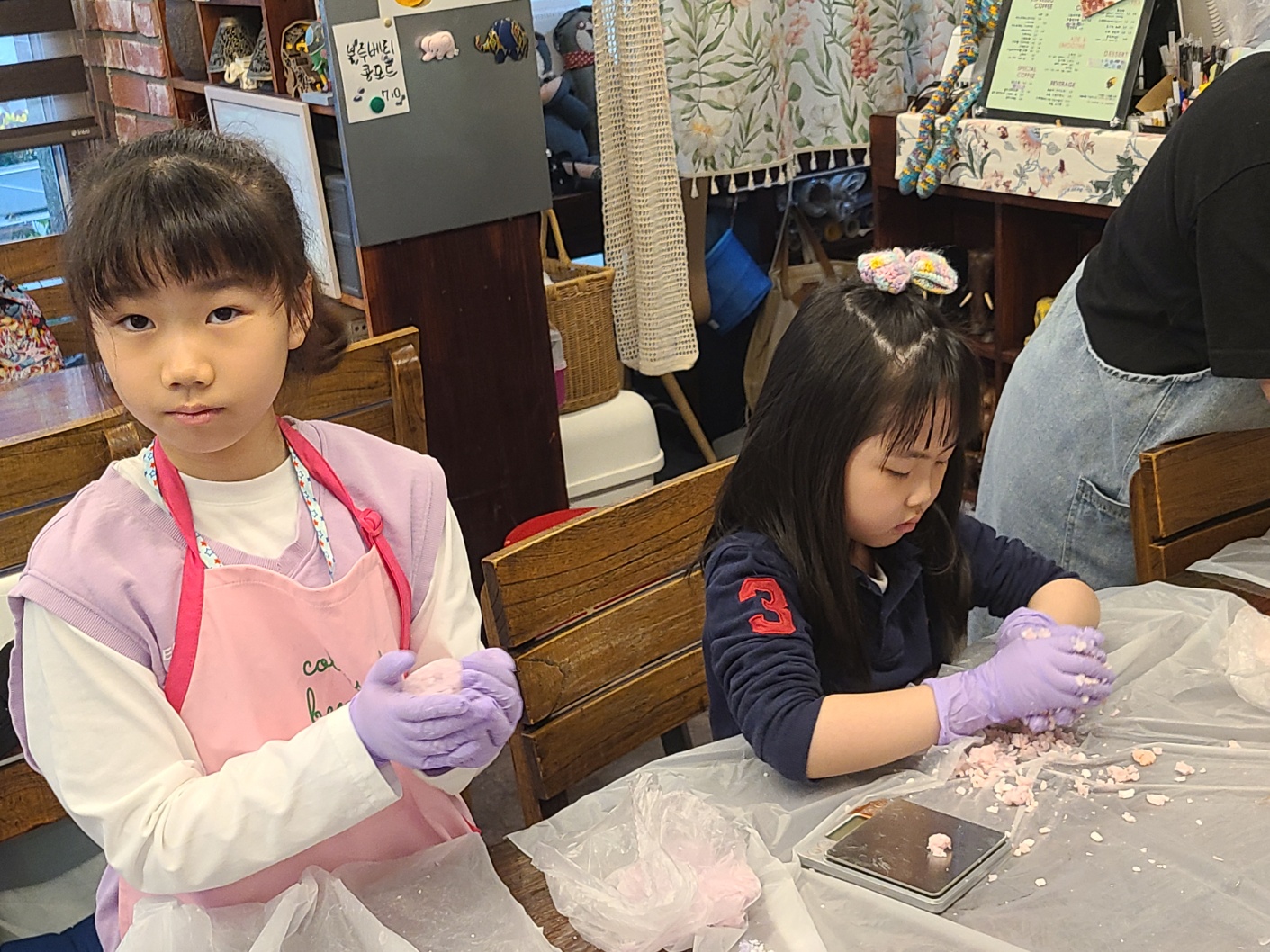 꽤나 많은 양의 비가 내리고 있었지만 아이들이 모였고, 드디어 비누만들기를 시작했습니다.