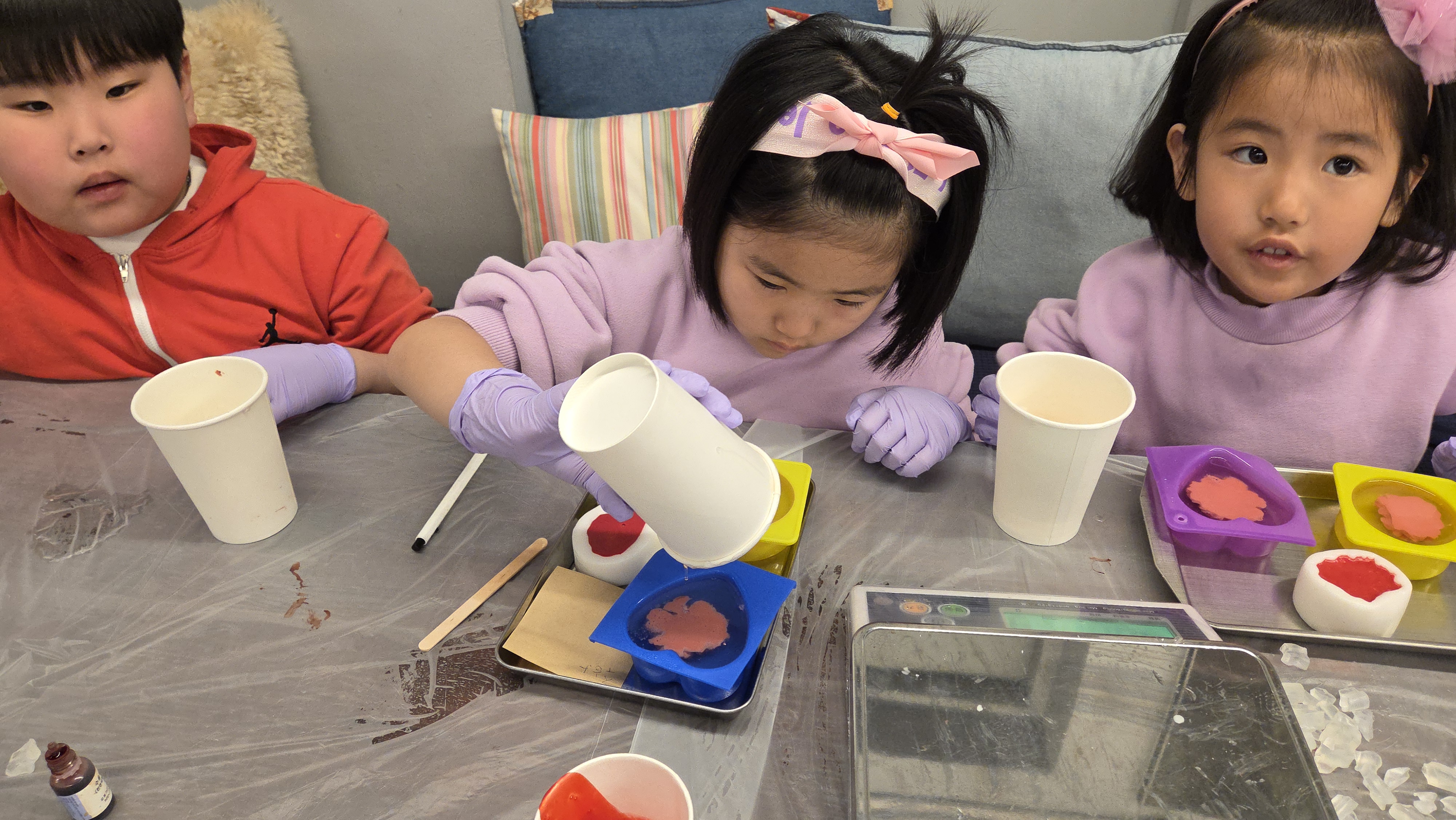 비누를 녹이고, 색을 넣고 비누를 만들었습니다.