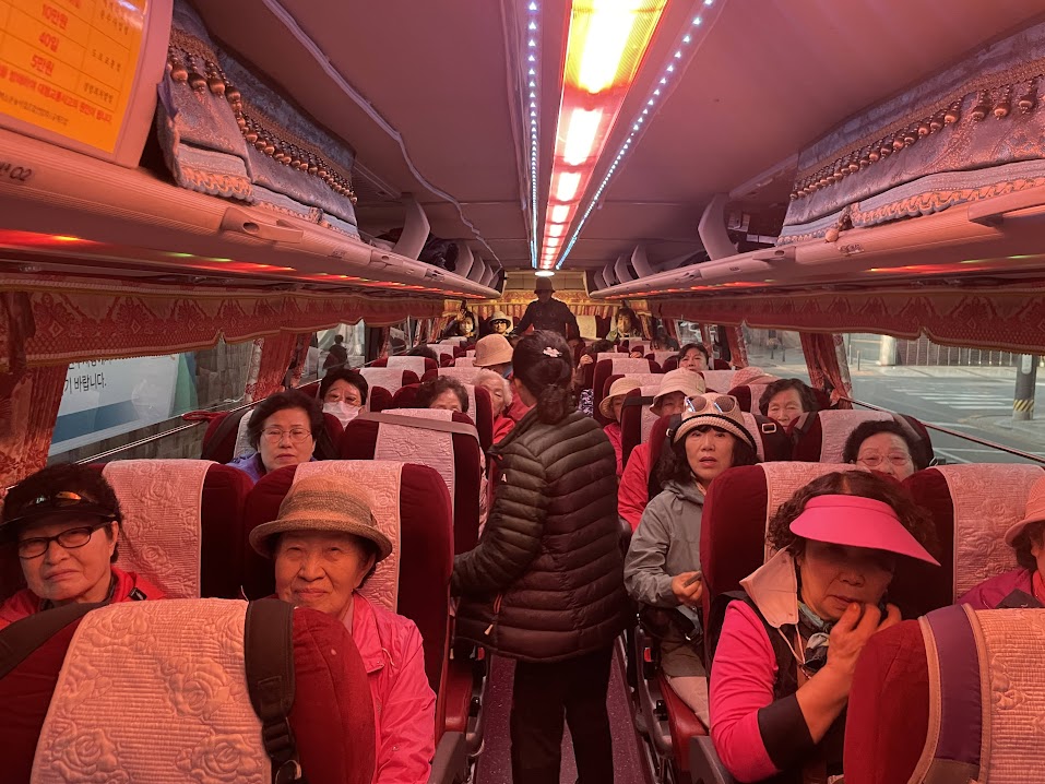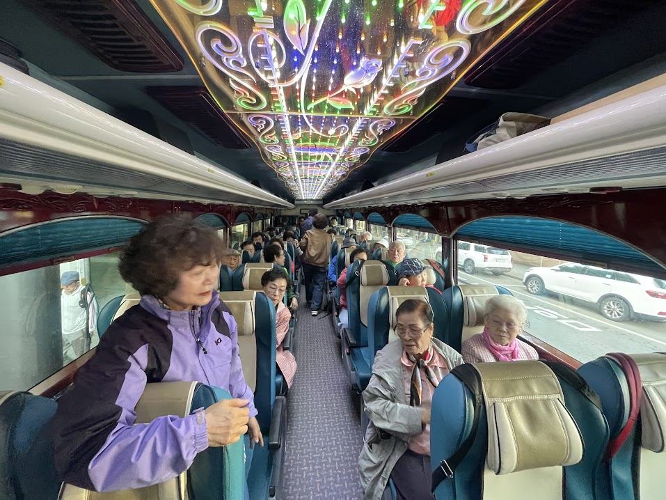 어르신들의 들뜬 목소리와 웃음소리가 출발 전부터 현장을 따뜻하게 채웠습니다. 봉사자들은 어르신들의 탑승을 돕고 준비물을 챙기며 바쁘게 움직였고, 출발 후에는 신나는 음악과 간식이 함께하는 즐거운 이동 시간이 이어졌습니다.