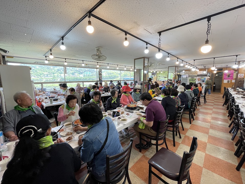 오랜이동으로 배가 고프실 어르신들을 위해, 유람선 탑승 전 점심 식사를 먼저 진행했습니다. 준비된 메뉴는 충주의 향토 음식인 더덕구이 정식. 다양한 반찬과 구수한 더덕향이 어우러진 식탁에 어르신들은 “밥도 맛있고, 풍경도 좋고 너무 좋네~”라며 환한 미소를 지으셨습니다.