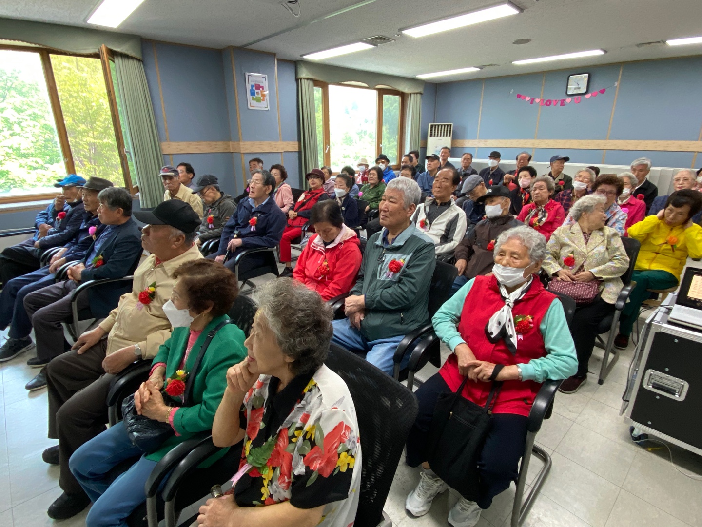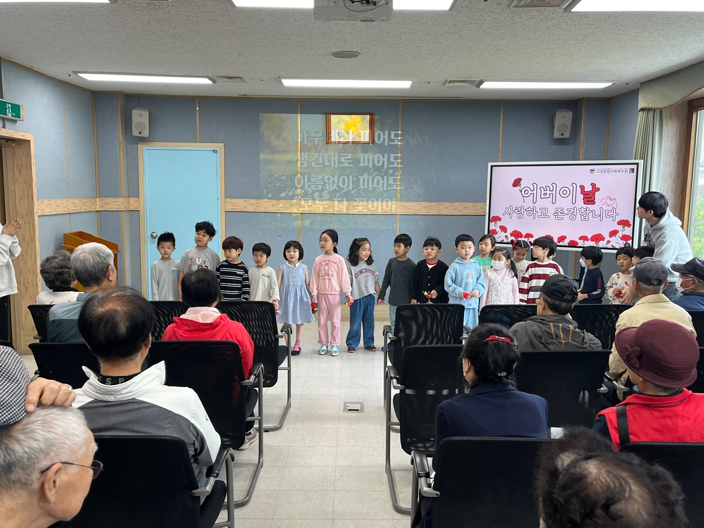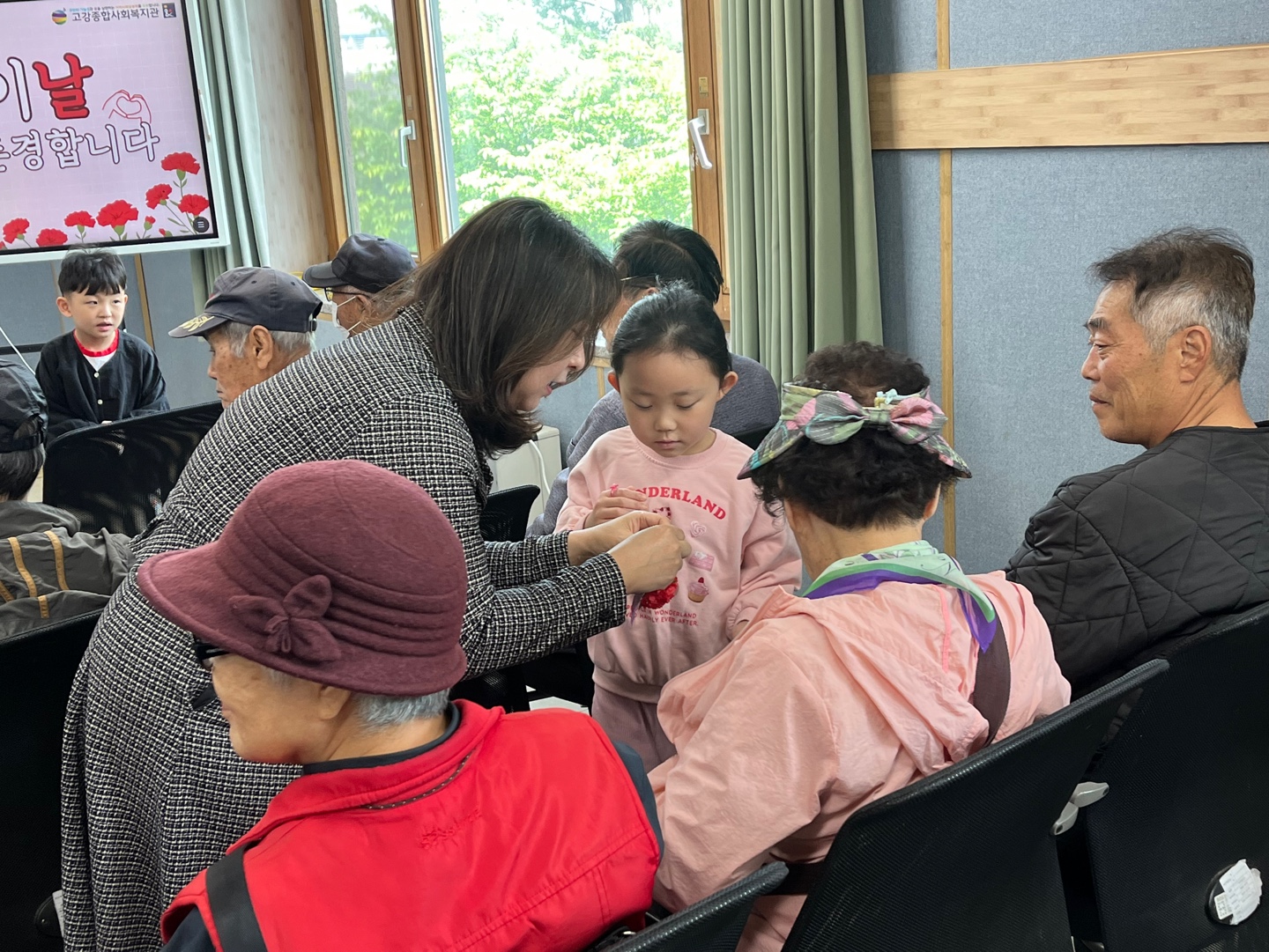 노래가 끝난 뒤 아이들과 직원들은 어르신 한 분 한 분께 직접 꽃을 달아드리며 사랑의 마음을 전했습니다.
