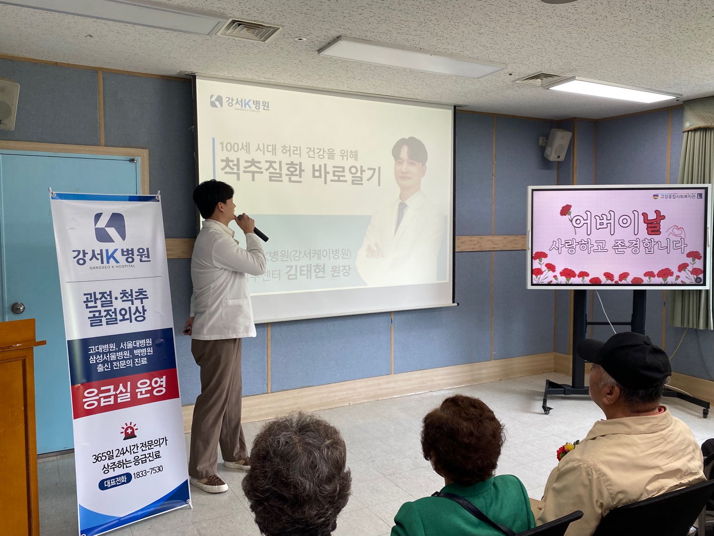 강서K병원에서는 어르신들을 위한 간식선물과 함께, 김태현 원장님의 척추 건강 강의도 진행되었습니다.