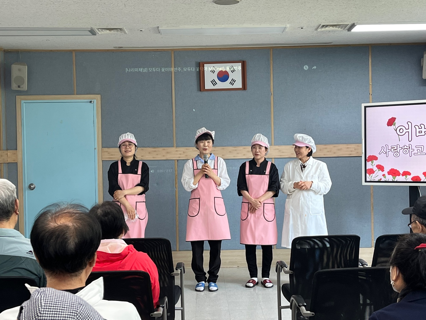 서선희 부장님의 대표 인사말과 함께 조리팀 직원들도 무대에 올라, 어르신들의 건강한 식사를 책임지고 있는 고마움을 담아 인사를 드렸습니다.