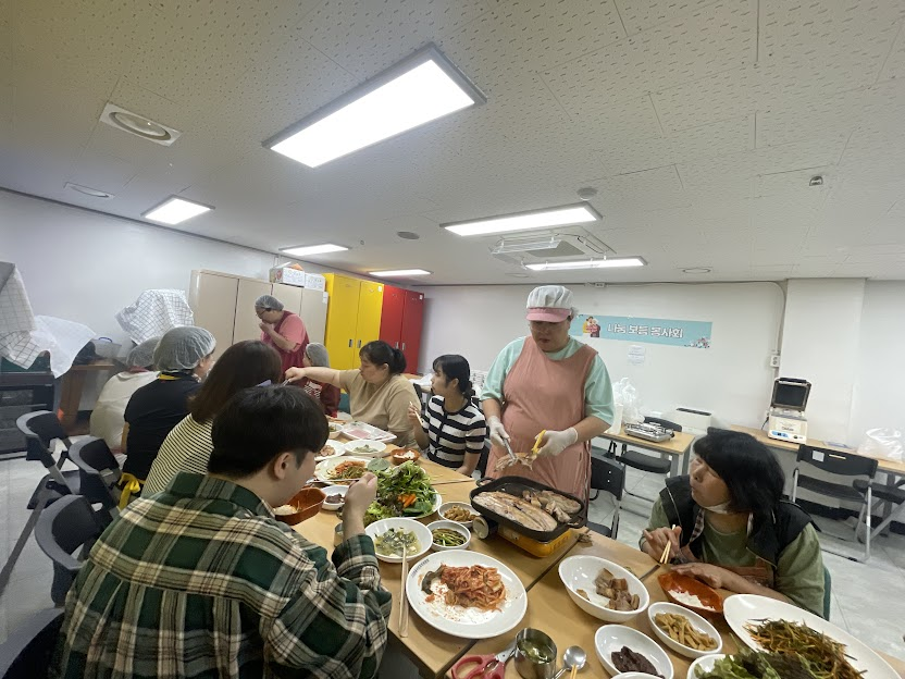 김영희 봉사자님이 찬조해 주신 돼지고기와 회원들이 각자 집에서 가져온 반찬들이 더해져 금세 푸짐한 식탁이 차려졌고, 박은주 회장님은 "센터 선생님들도 함께 드셨으면 좋겠다"며 고리울청소년센터 직원분들을 초대했습니다.