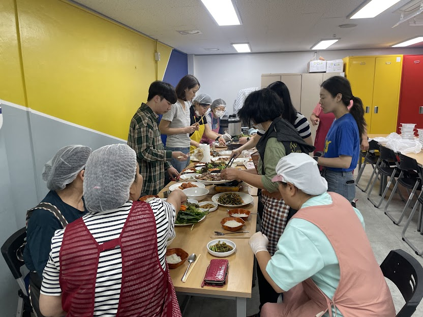 얼마 전 새로 합류한 봉사자들의 활약도 돋보였습니다. 열무김치를 담당한 이상녀 봉사자는 이전 골목잔치에서도 열무김치를 맡았던 경험이 있어 익숙한 손놀림으로 큰 역할을 해주셨고, 김승섭, 김형희 회원은 처음이라 낯설 수 있는 주방에서도 능숙하게 움직이며 어르신들을 위한 건강한 반찬 만들기에 힘을 보탰습니다.