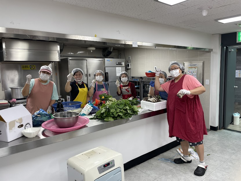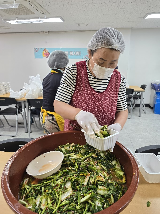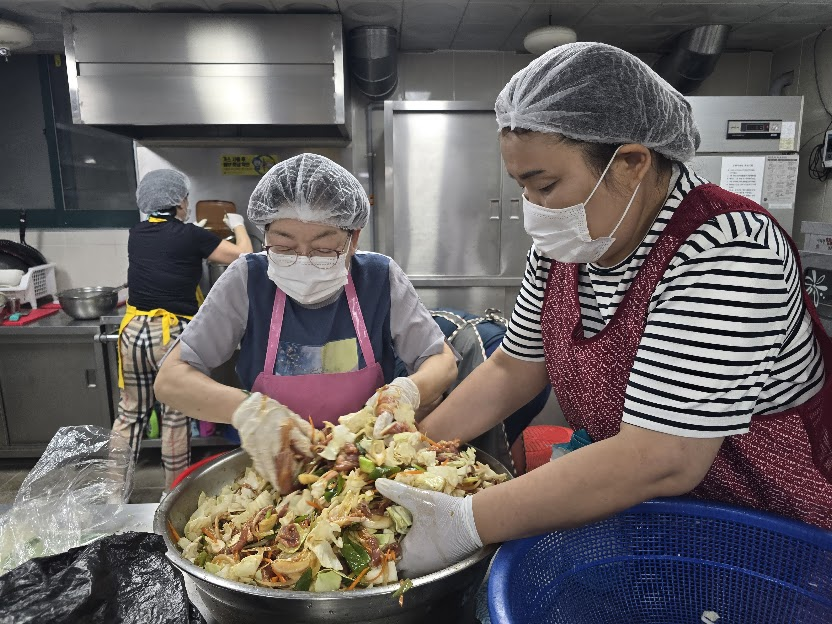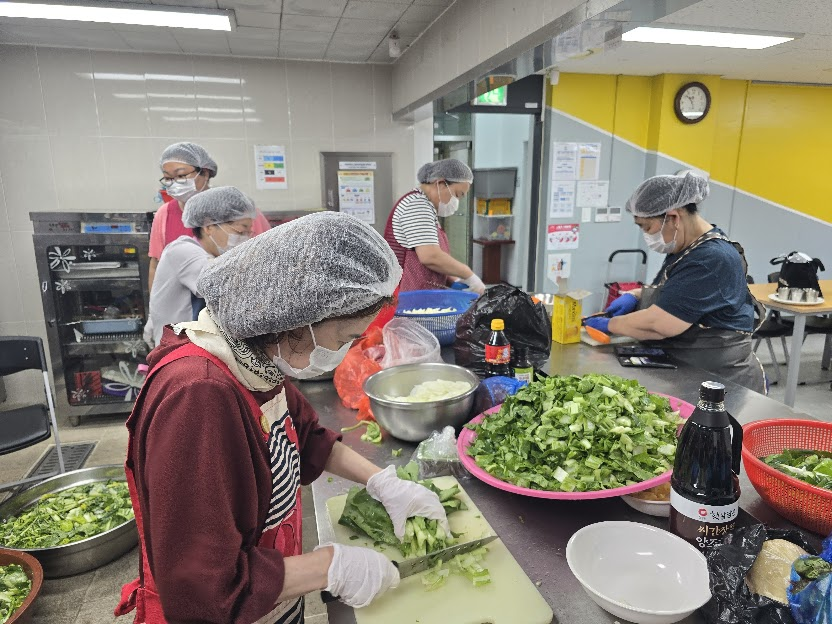 얼마 전 새로 합류한 봉사자들의 활약도 돋보였습니다. 열무김치를 담당한 이상녀 봉사자는 이전 골목잔치에서도 열무김치를 맡았던 경험이 있어 익숙한 손놀림으로 큰 역할을 해주셨고, 김승섭, 김형희 회원은 처음이라 낯설 수 있는 주방에서도 능숙하게 움직이며 어르신들을 위한 건강한 반찬 만들기에 힘을 보탰습니다.