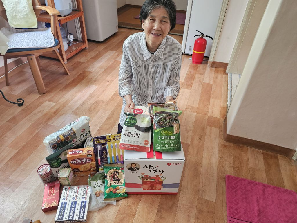 "롯데복지재단에서 후원해준 식료품 박스예요. 한 번 열어보세요, 어르신."