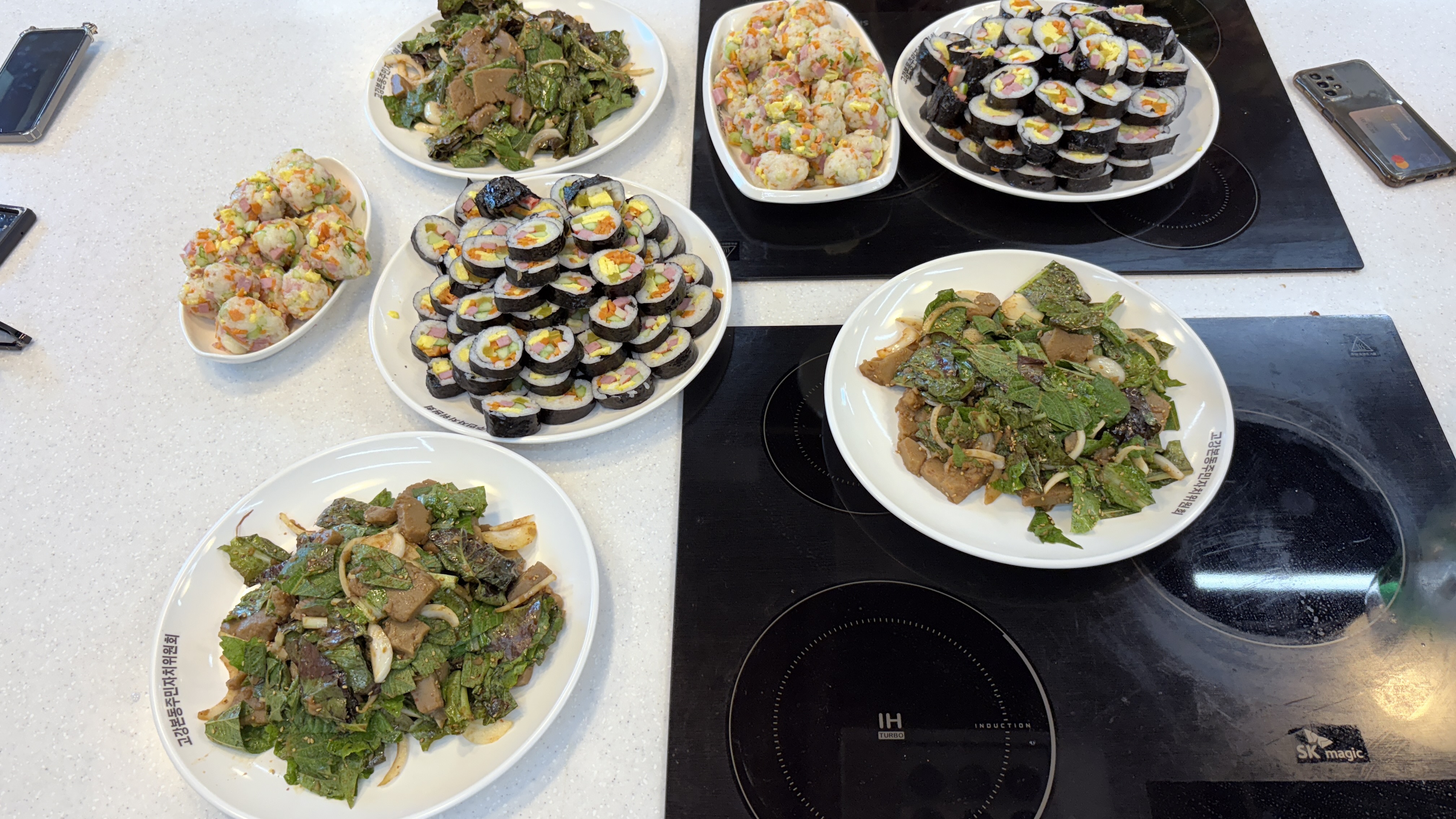 자~ 이쪽은 김밥말이... 이쪽은 묵무침... 이쪽은 수박화채에요. 맛있게 잘 만들어주세요//