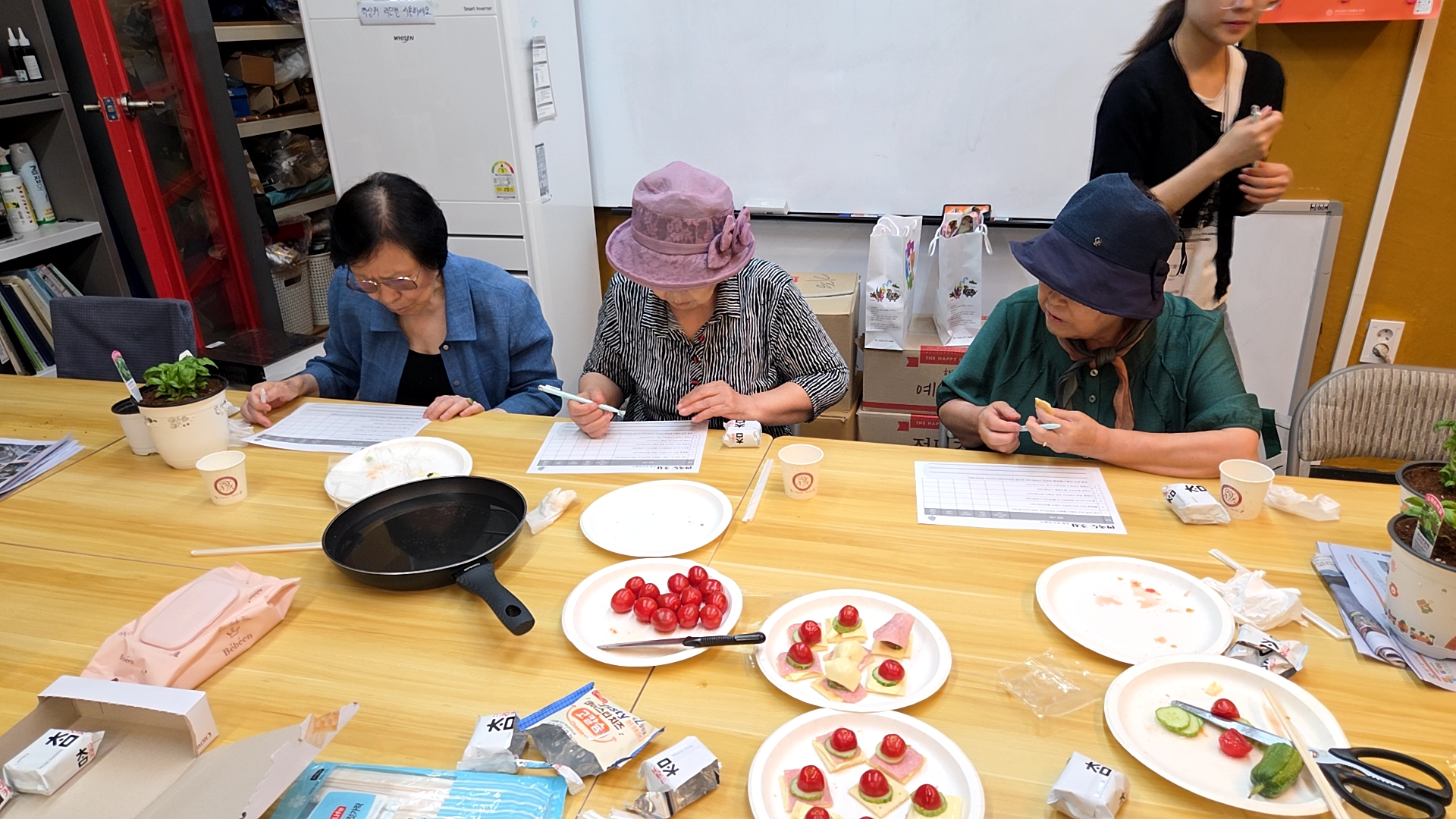 어르신들과 함께 직접 키운 바질을 활용해 카나페를 만들어 먹는 시간을 가졌습니다.