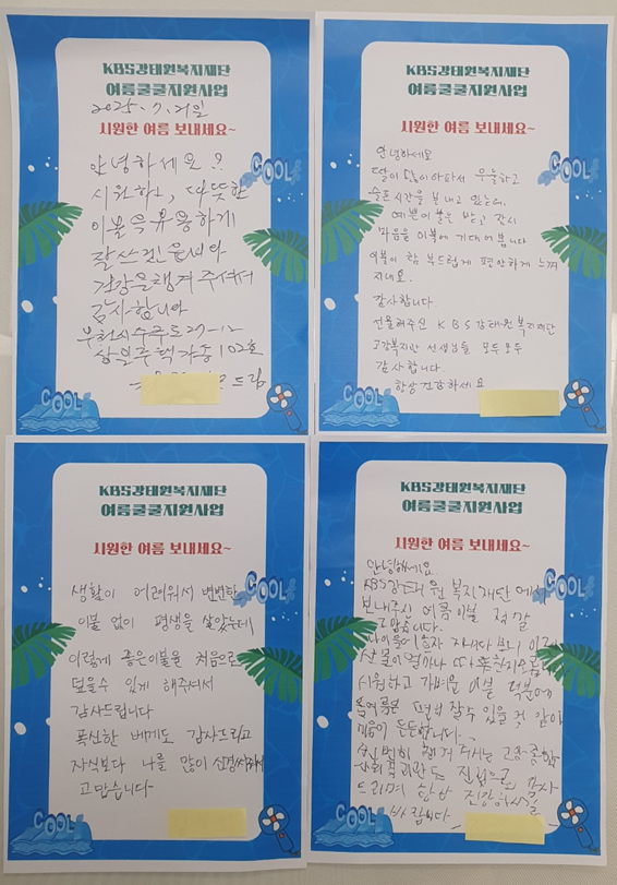 KBS강태원복지재단의 여름물품 지원사업 [여름쿨쿨]을 지원해 주신 관계자 여러분께 감사함을 전하며,