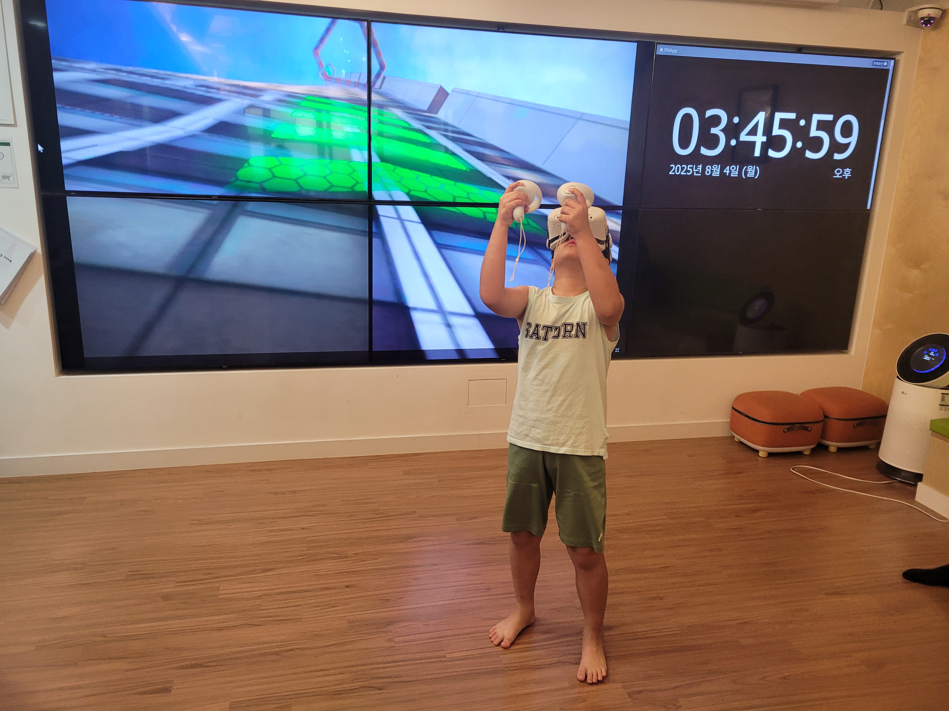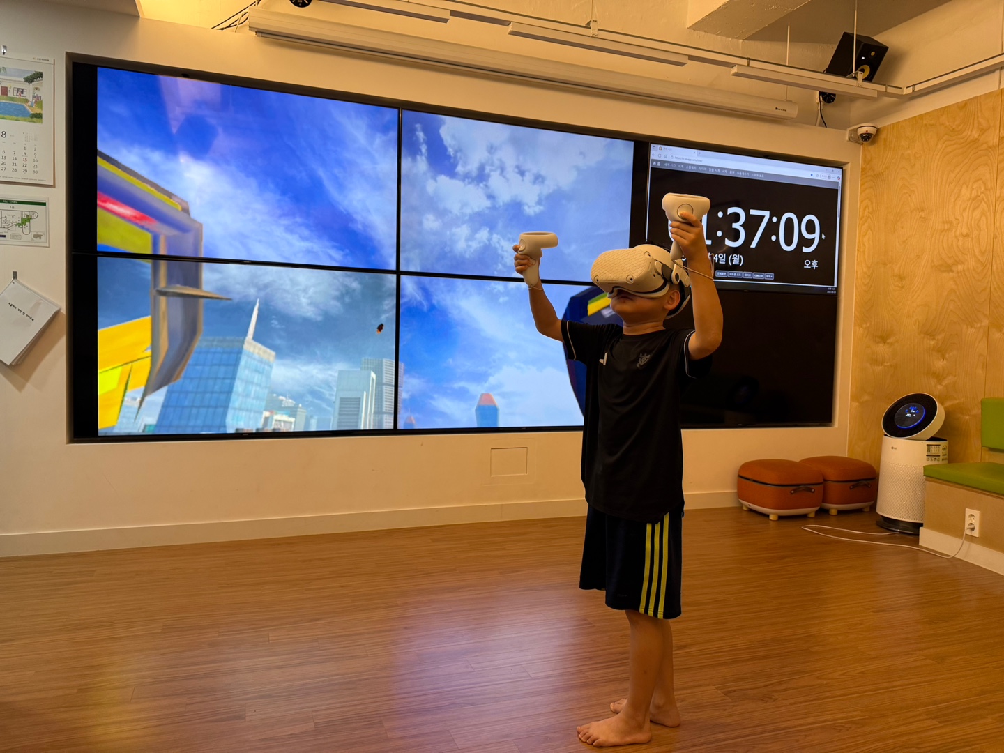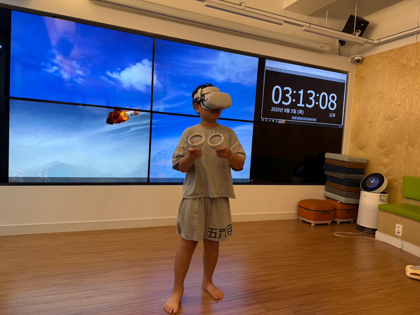 아이들은 머리에 VR 기기를 쓰고 새로운 세상으로 떠났습니다. 무시무시한 공룡을 만나고, 신나는 롤러코스터를 타고, 우주를 여행하는 아이언맨이 되기도 했죠. VR 속에서 평소 좋아하던 '스펀집밥' 영상을 보며 노래와 춤을 추던 아이의 모습은 모두에게 큰 즐거움을 주었어요. 아이들은 저마다의 방식으로 VR 세상을 만끽했습니다.