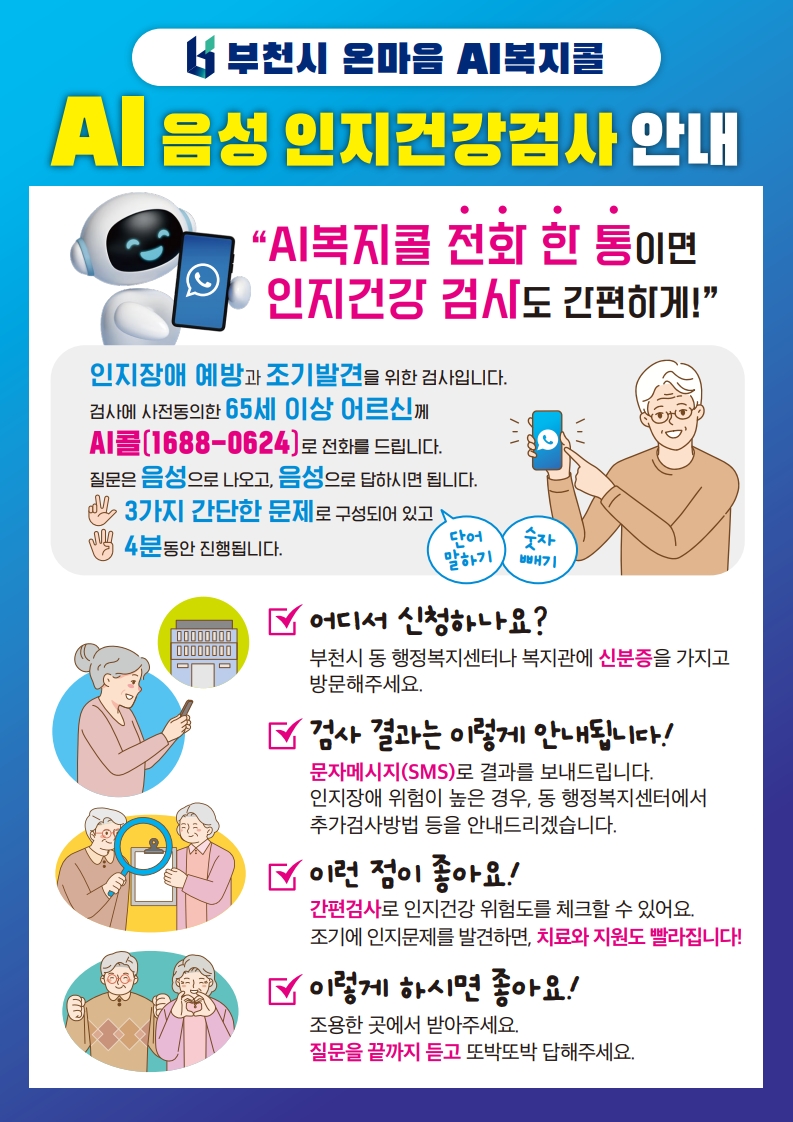AI 음성 인지건강검사를 원하시는 분은 관할동 행정복지센터 또는 고강종합사회복지관(032-677-9090)으로 전화신청 가능합니다😄