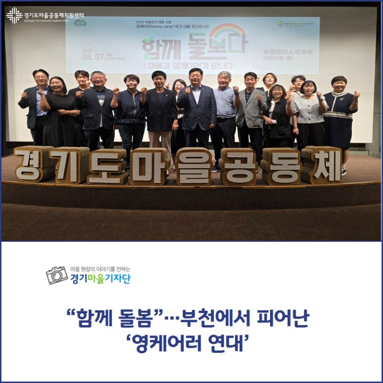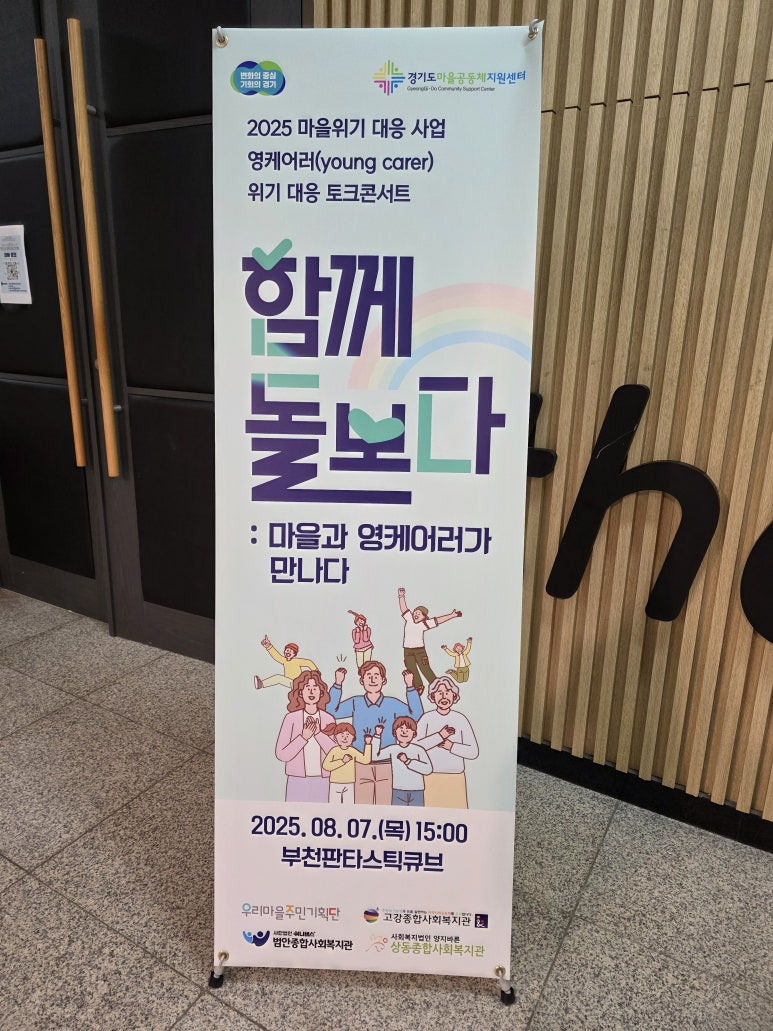 지난 8월 7일(목) 오후 3시. 부천시청 판타스틱큐브에서 ‘영케어러 위기 대응 토크콘서트’가 열렸다. 경기도마을공동체지원센터 ‘2025 마을위기 대응 사업’의 일환으로 진행된 100일간의 활동 내용을 공유하고, 이 사업에 참여했던 마을공동체, 복지기관, 영케어러, 교육복지사 등이 함께 참여해 영케어러 현장의 무게를 나누는 자리였다.